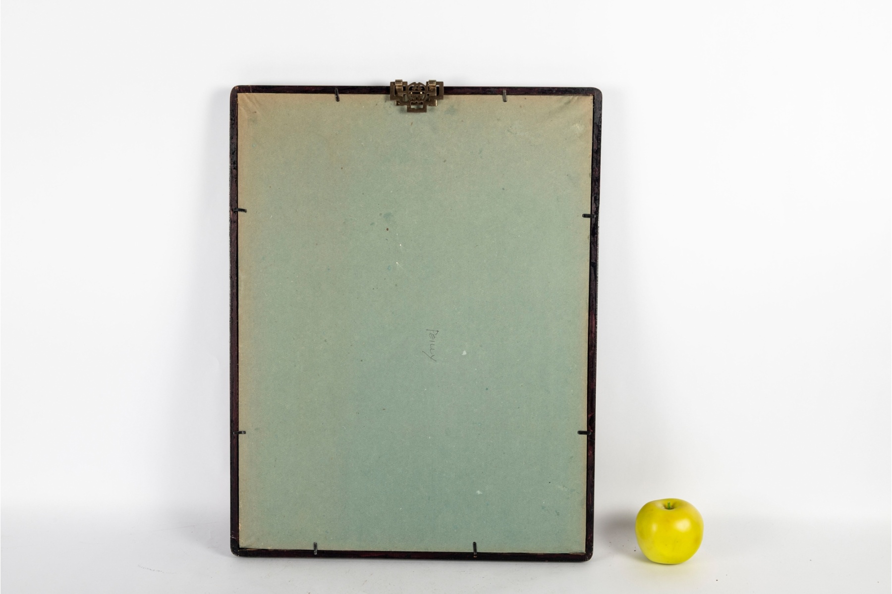 Mounted under glass with a cream silk-patterned mat and a dark lacquered wood frame featuring an ornate brass hanger.