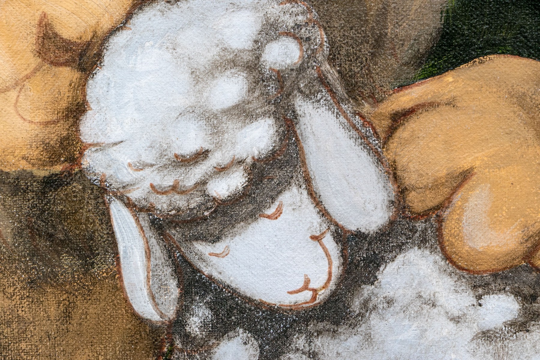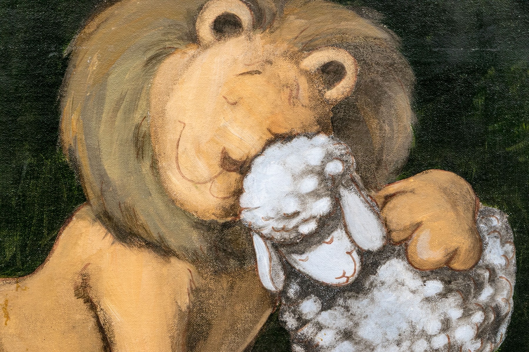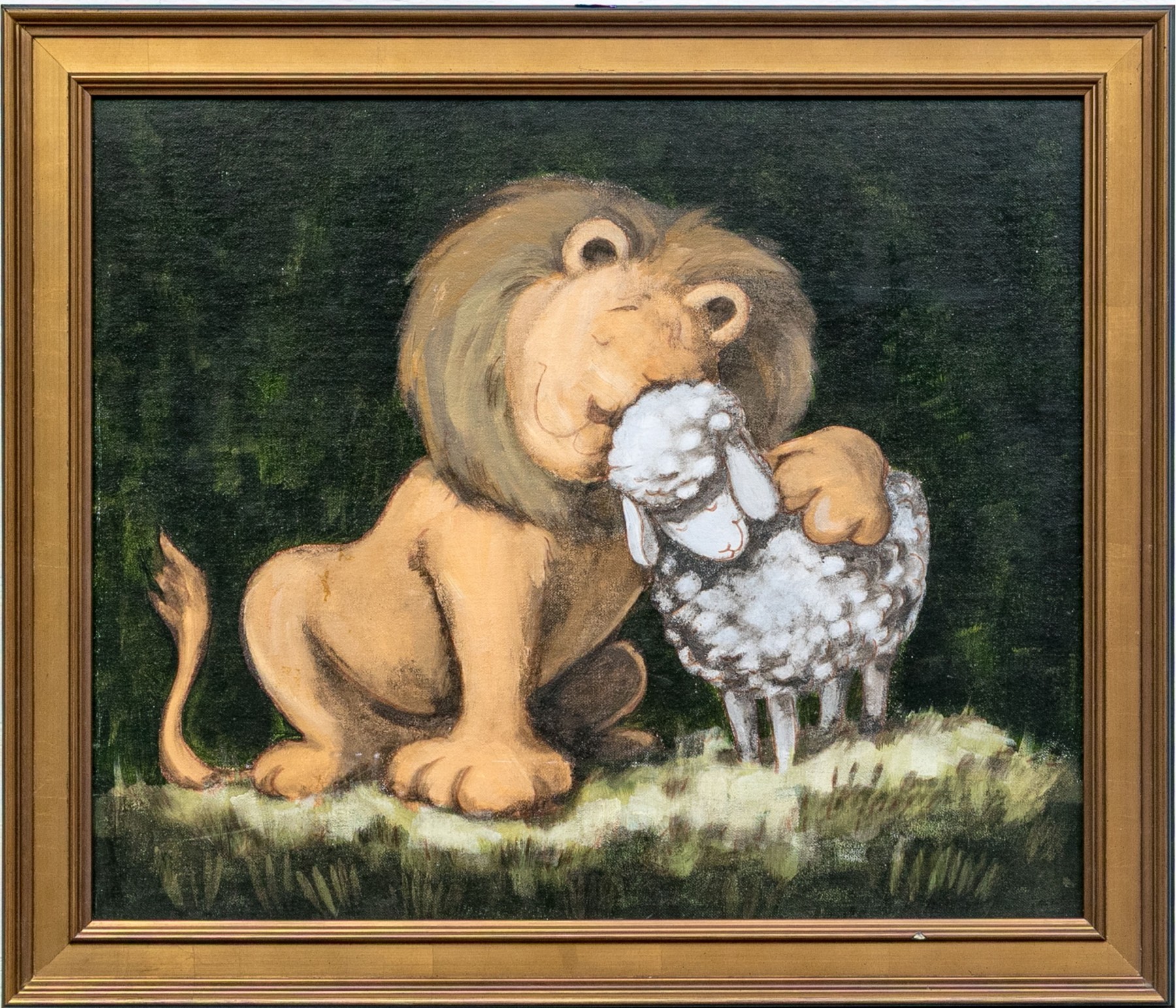 Unsigned. A sweet male lion happily cuddling a white sheep, mindful of the biblical passage of the lion lying down with the lamb. Presented in a black and gilt frame.