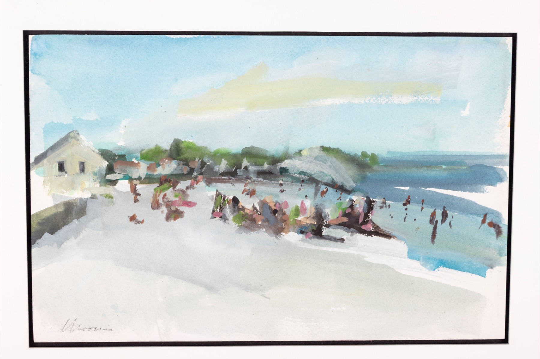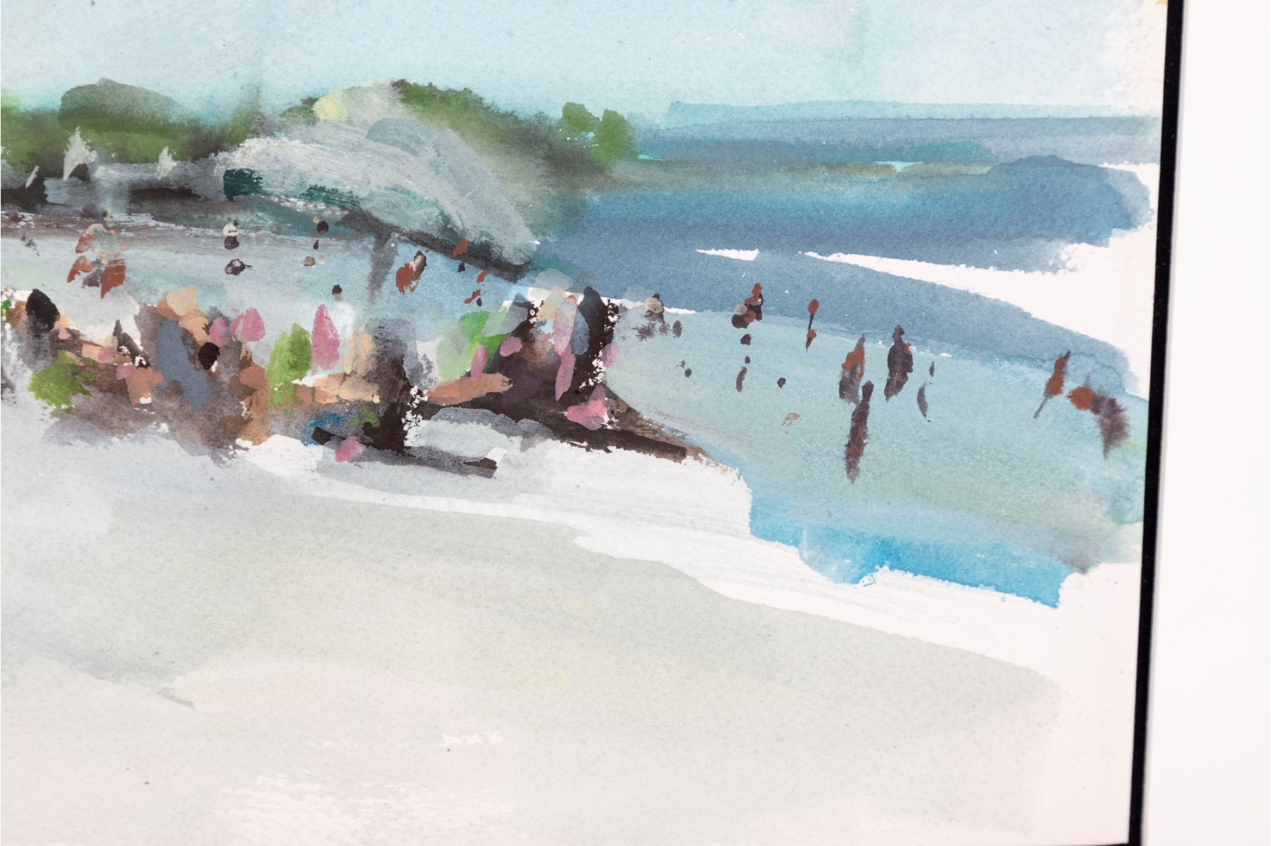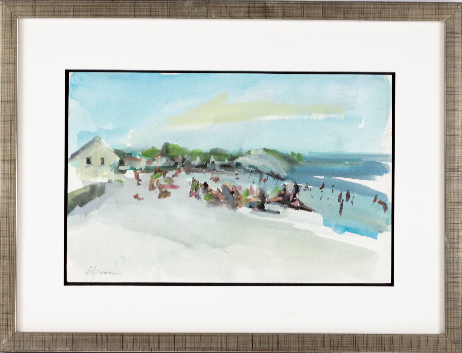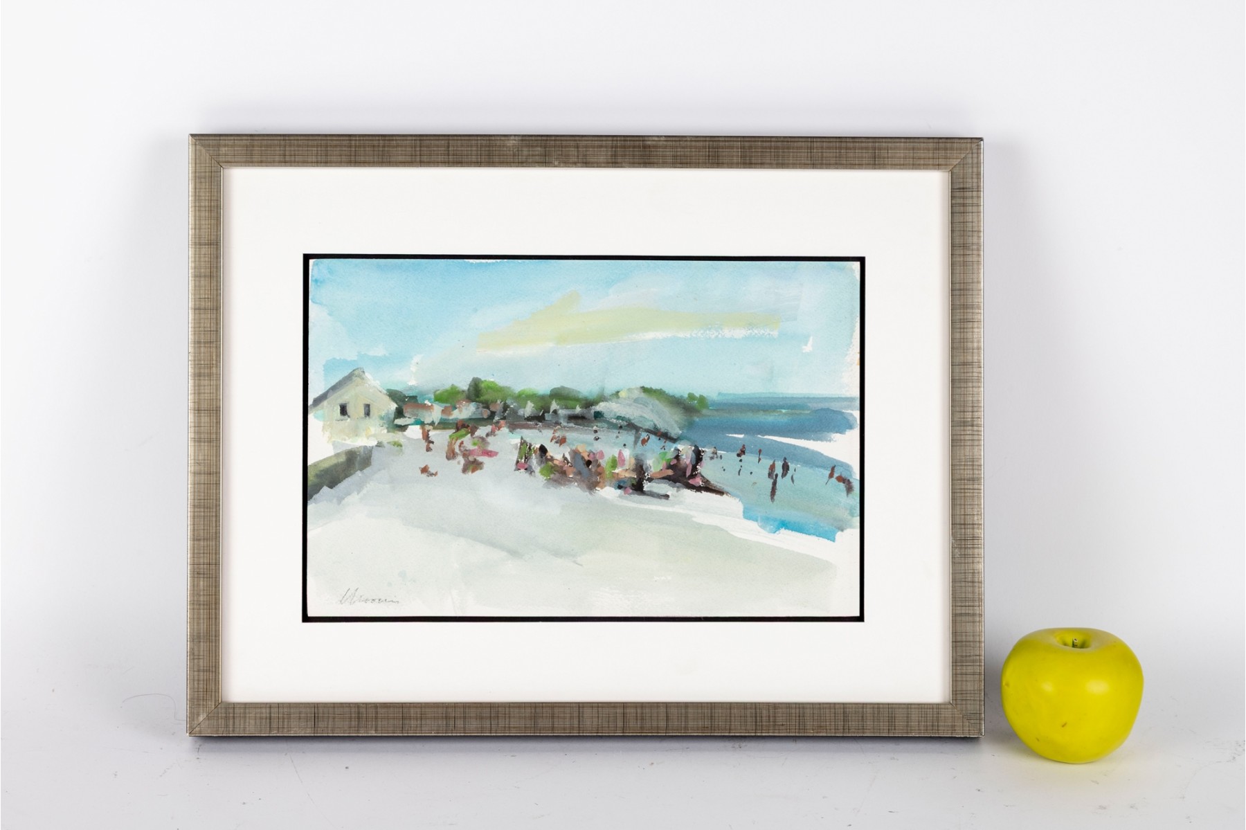 Tranquil watercolor painting of a beachside scene, signed by the artist. Housed in a contemporary frame, the piece captures the serene charm of coastal scenery with soft, fluid brushwork.