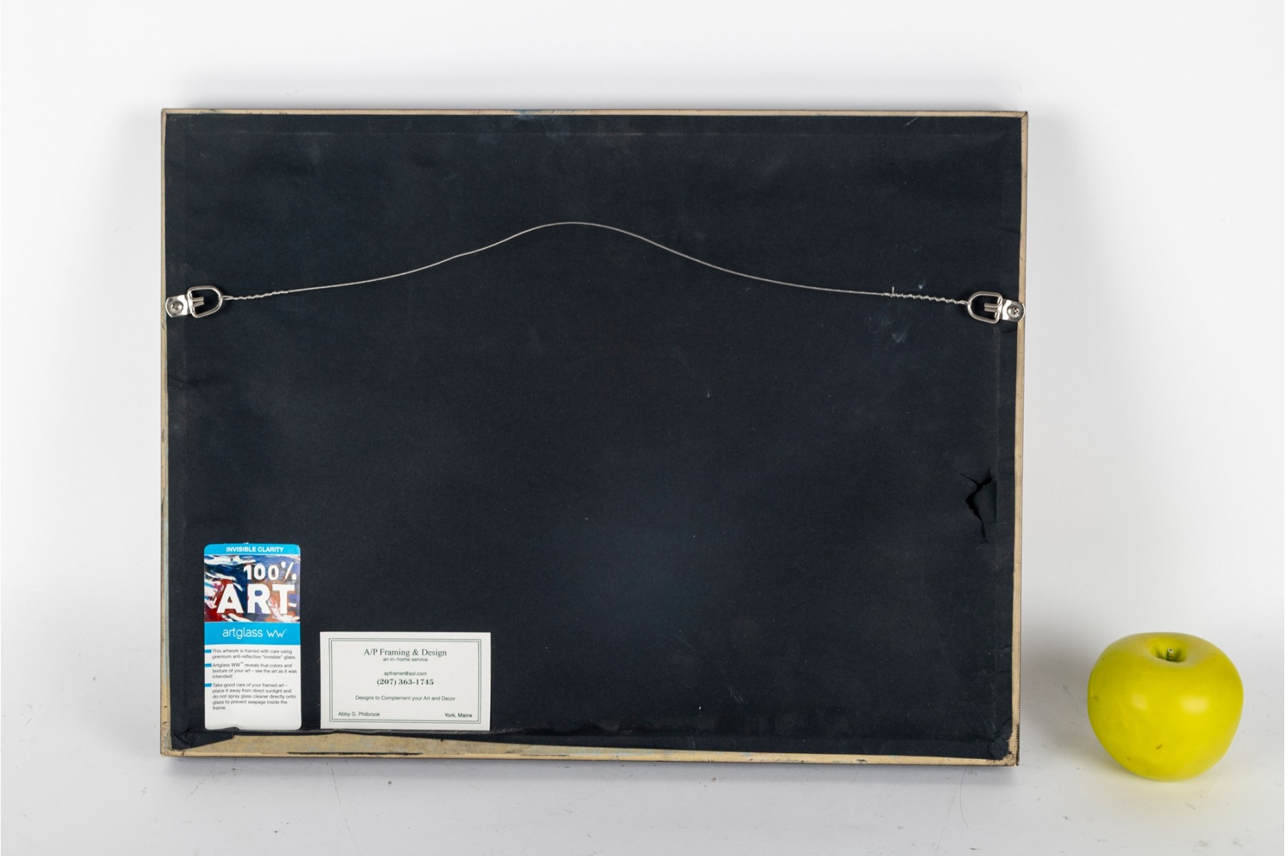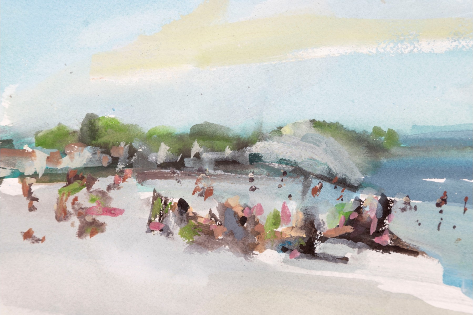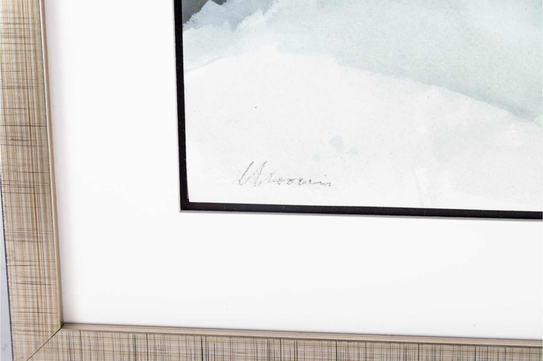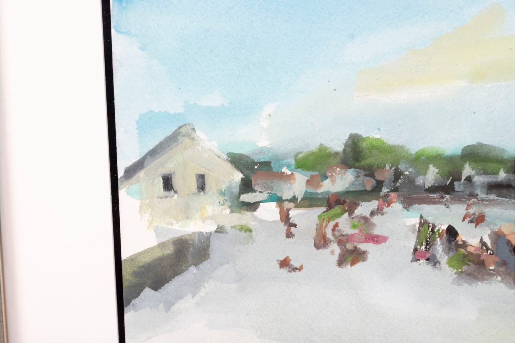 Tranquil watercolor painting of a beachside scene, signed by the artist. Housed in a contemporary frame, the piece captures the serene charm of coastal scenery with soft, fluid brushwork.