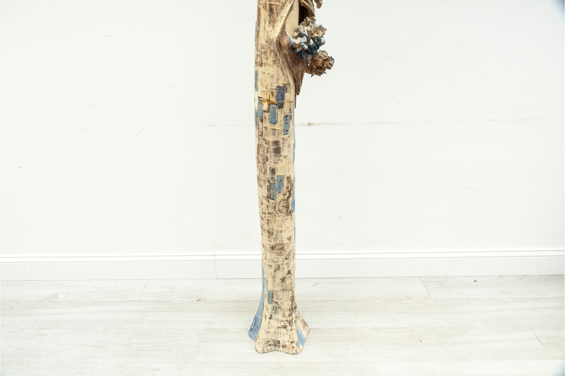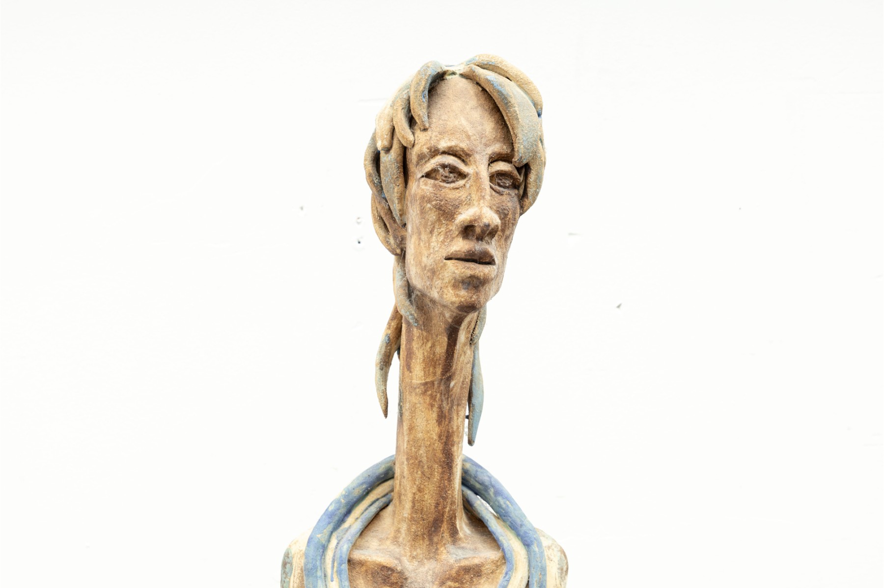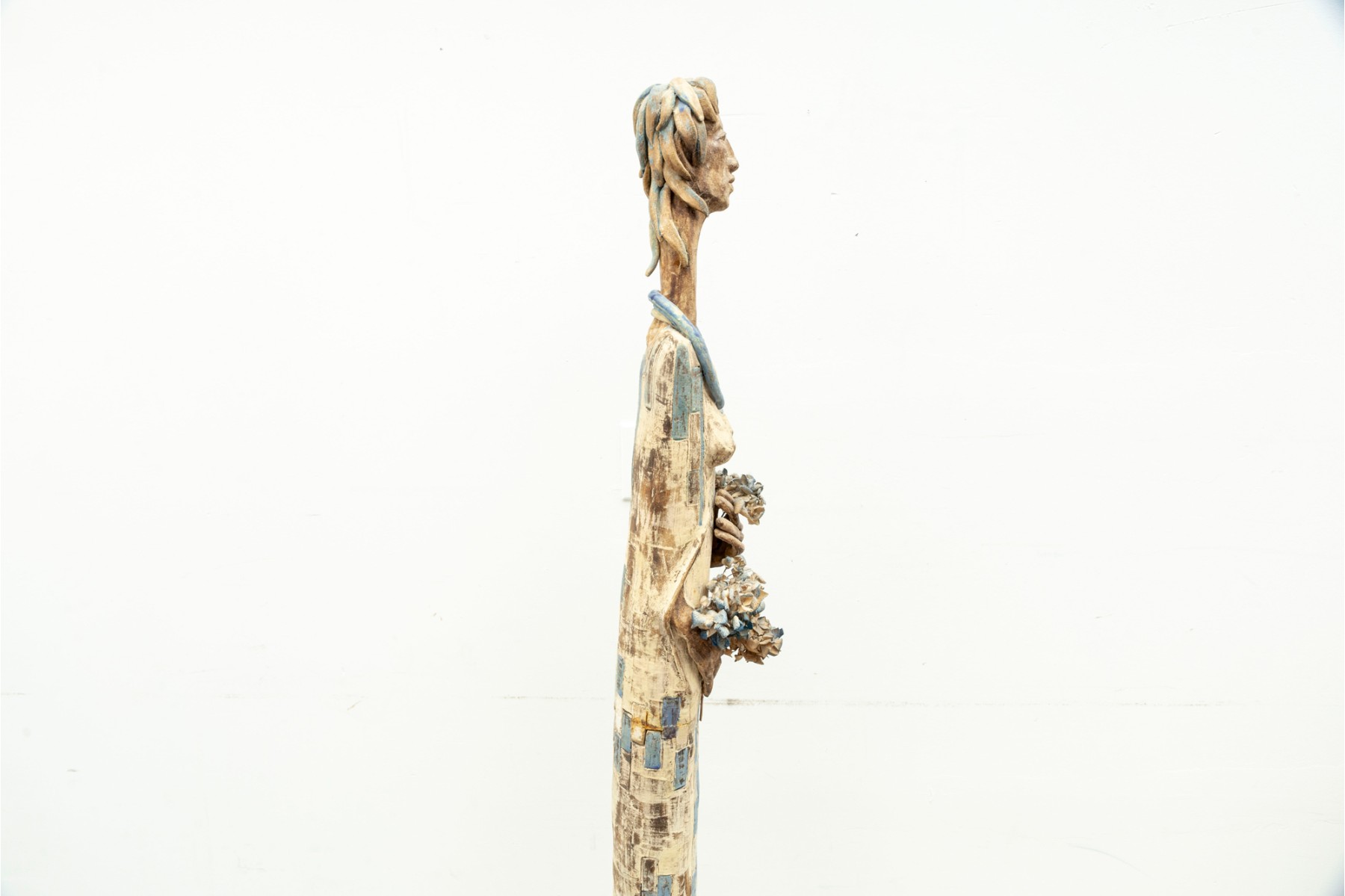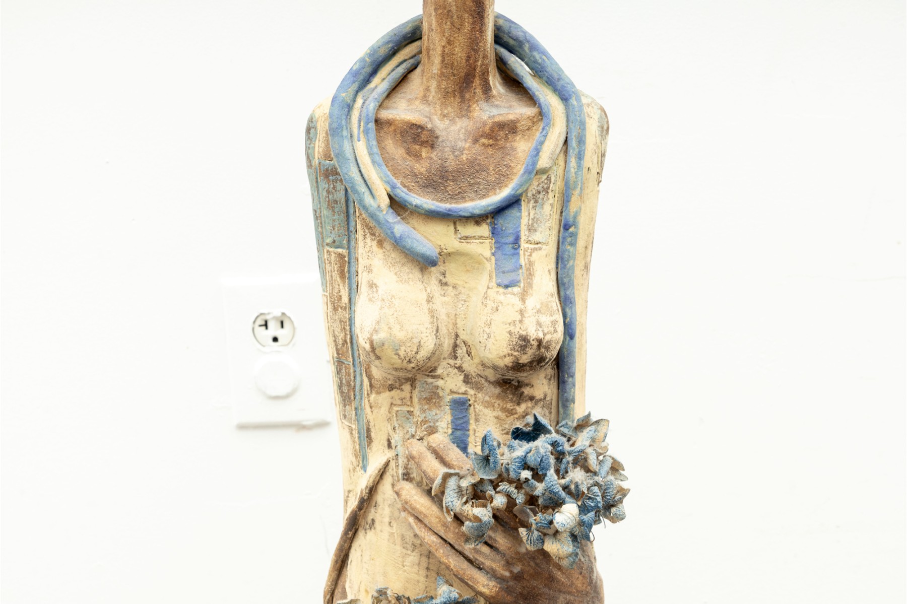 Frances Alvarino Norwood (American [NC], 20th century) ceramic sculpture, hand-painted over an exaggerated and elongated womanly form in a dress. Textured and detailed with flowing hair, the woman holds a set of preserved flowers below her chest in both hands. The piece is signed near the base — Dated 1999.