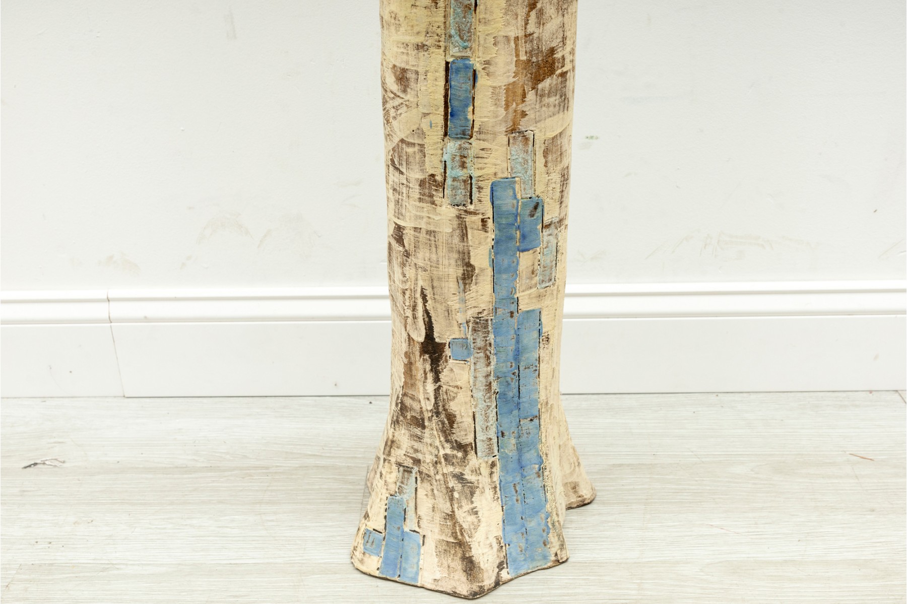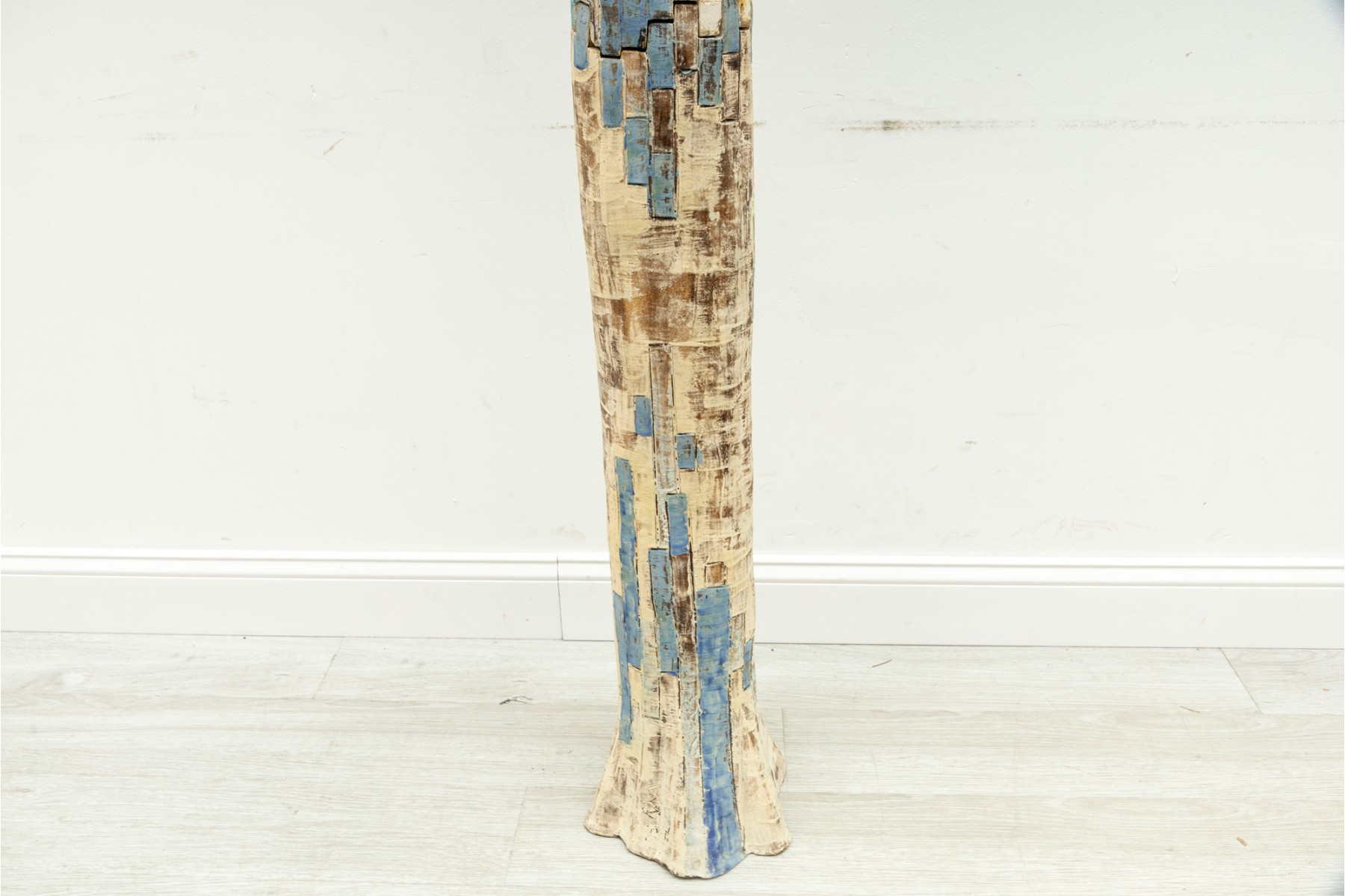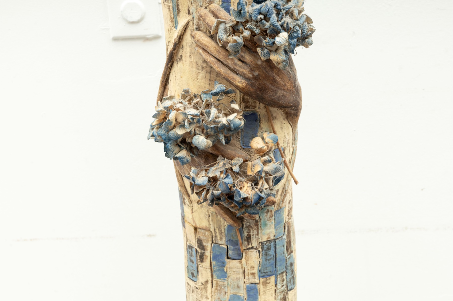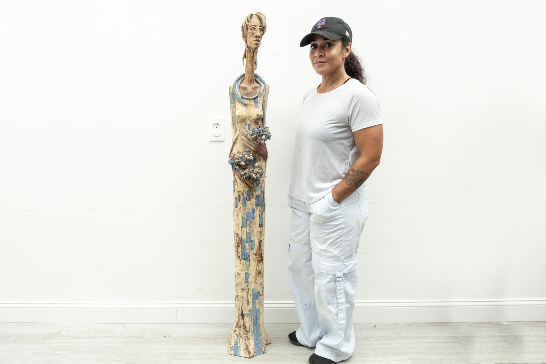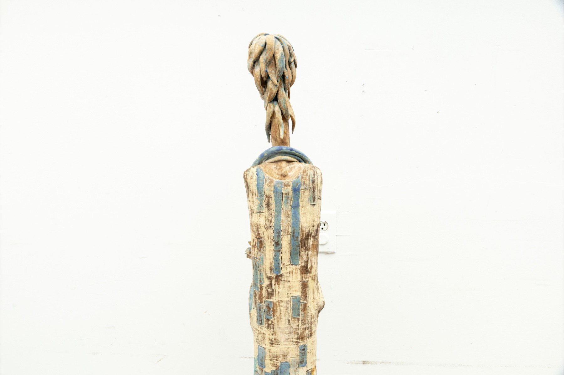 Frances Alvarino Norwood (American [NC], 20th century) ceramic sculpture, hand-painted over an exaggerated and elongated womanly form in a dress. Textured and detailed with flowing hair, the woman holds a set of preserved flowers below her chest in both hands. The piece is signed near the base — Dated 1999.