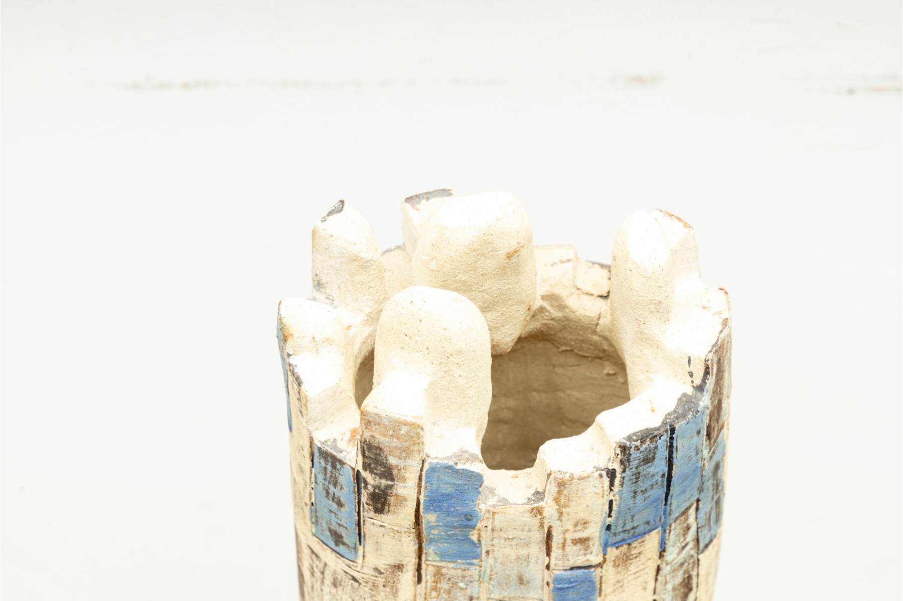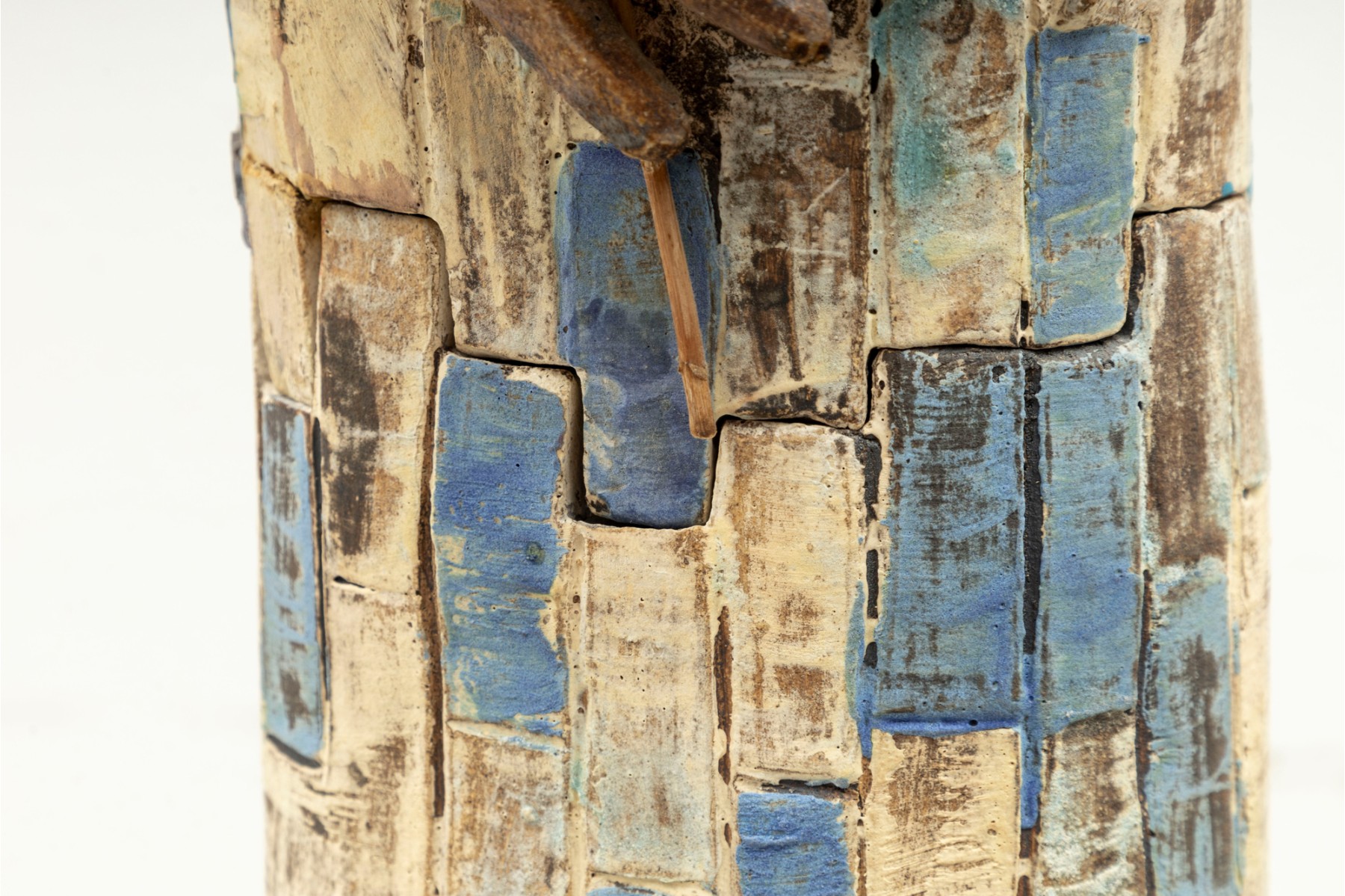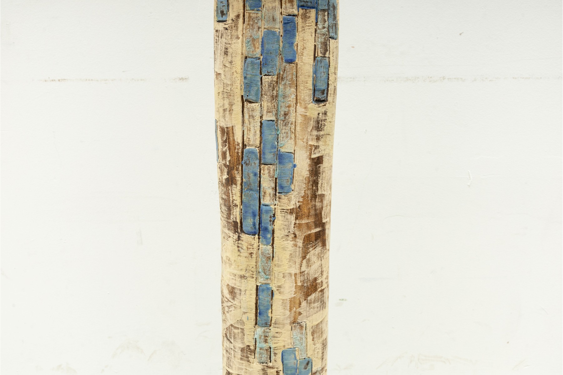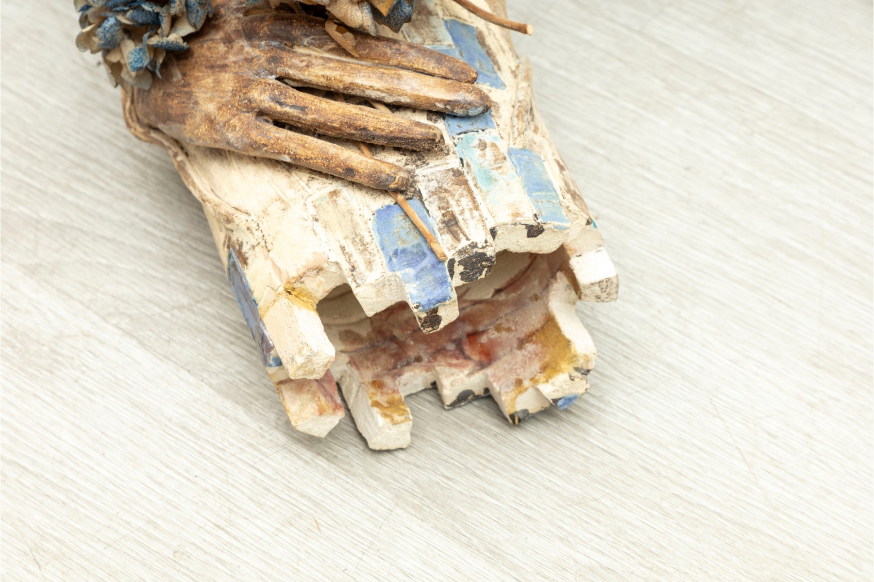 Frances Alvarino Norwood (American [NC], 20th century) ceramic sculpture, hand-painted over an exaggerated and elongated womanly form in a dress. Textured and detailed with flowing hair, the woman holds a set of preserved flowers below her chest in both hands. The piece is signed near the base — Dated 1999.