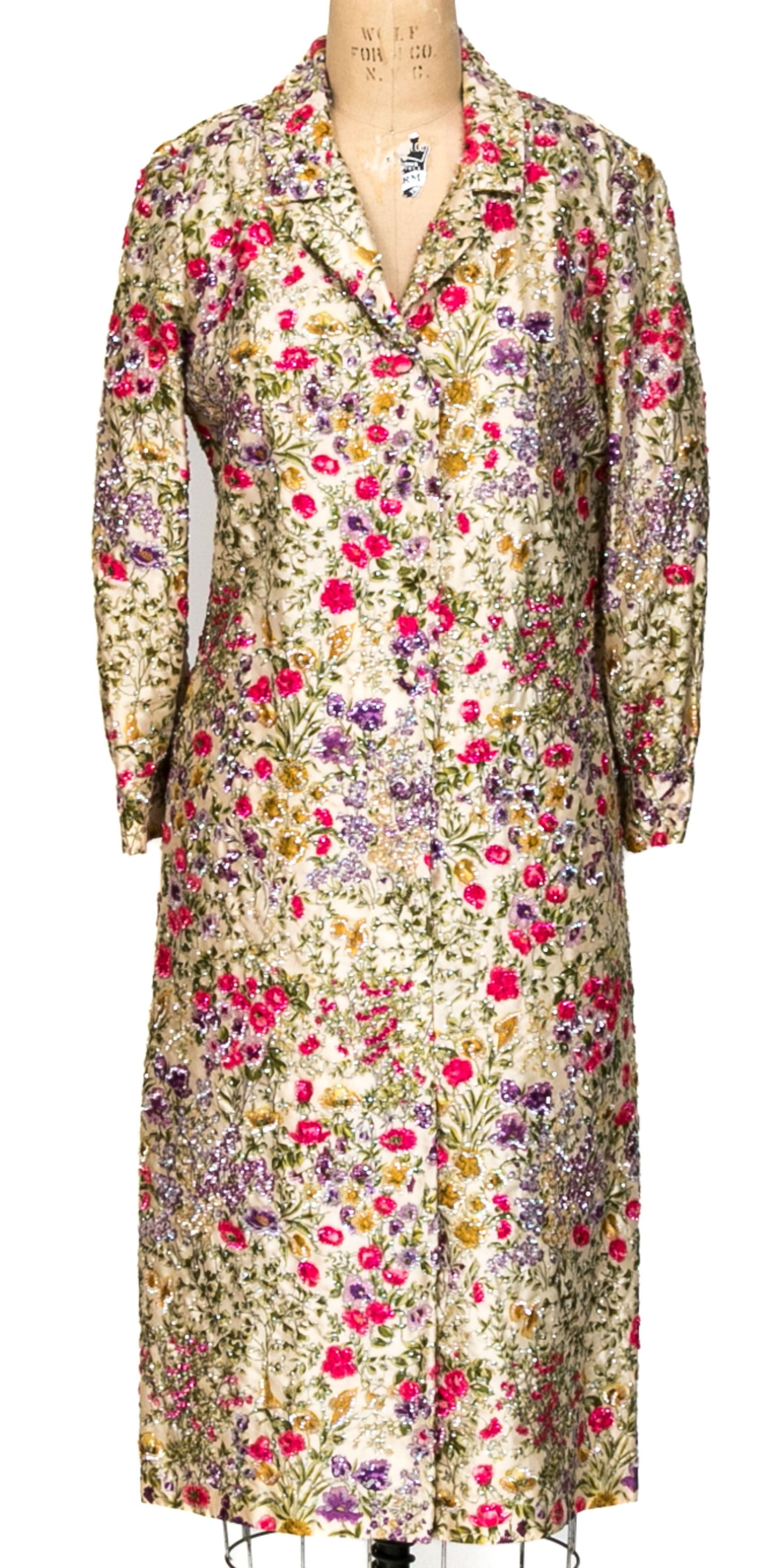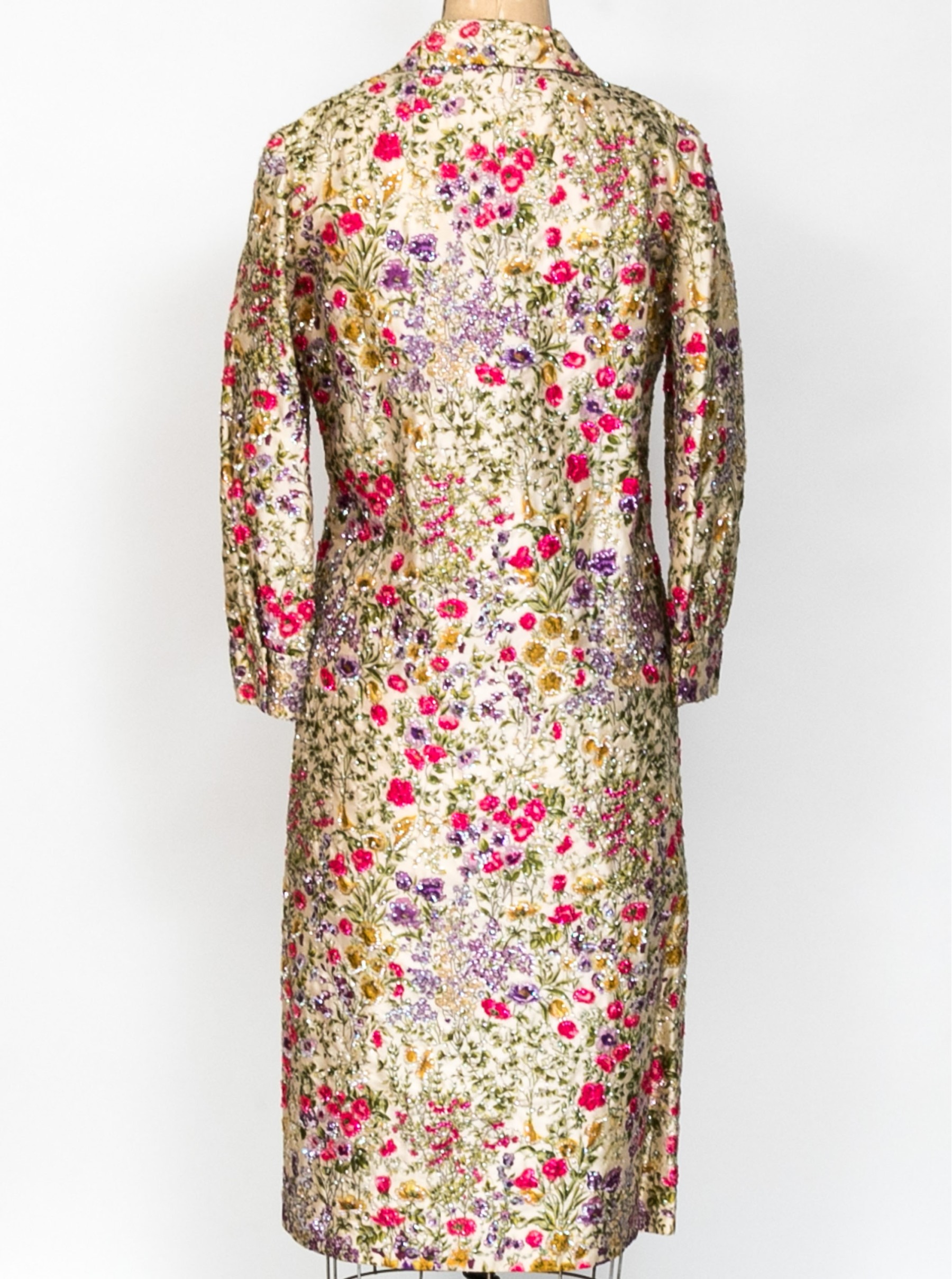 Floral patterned sequenced dress with 3/4 button up front with collar.