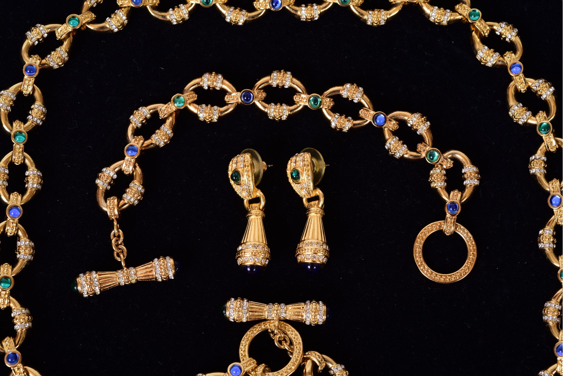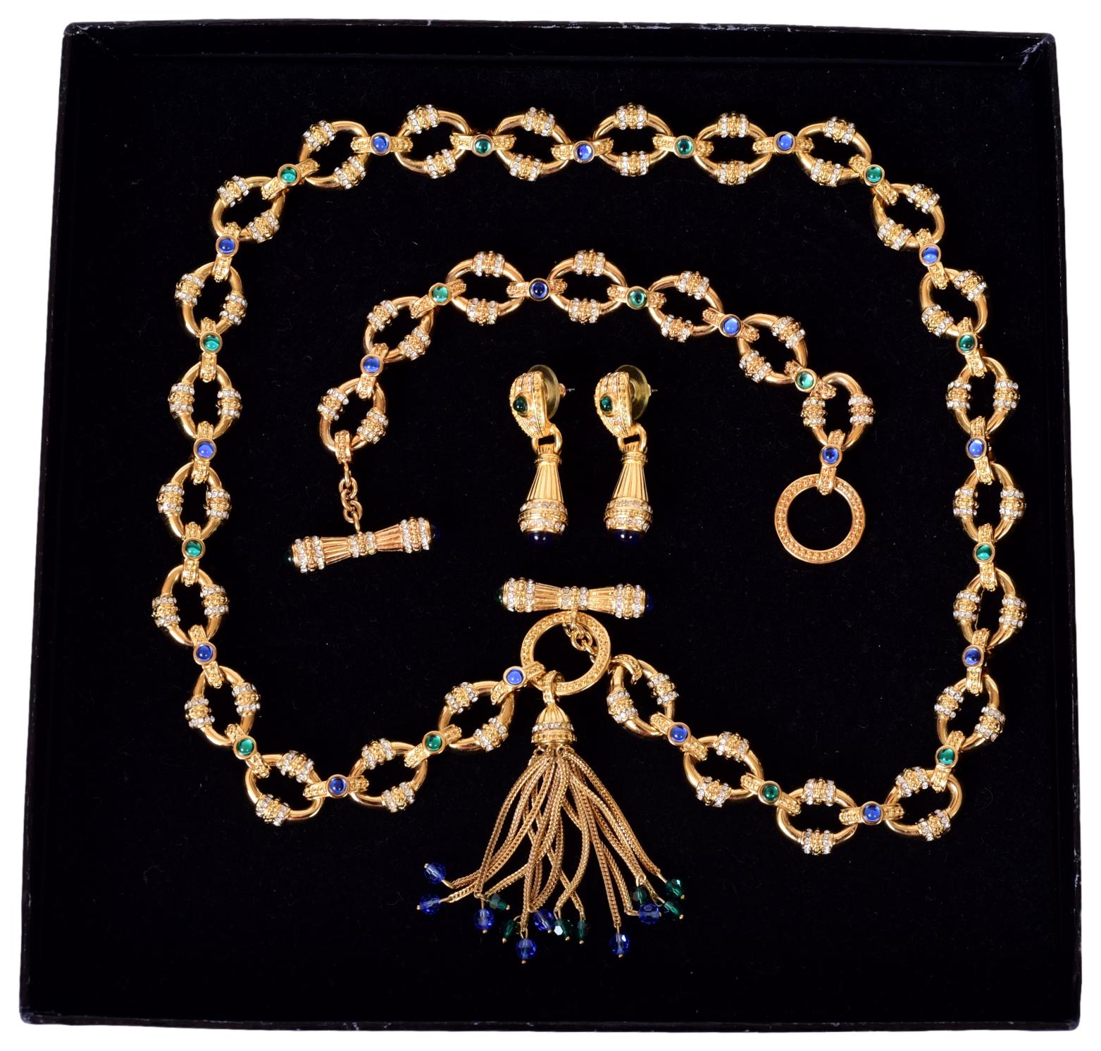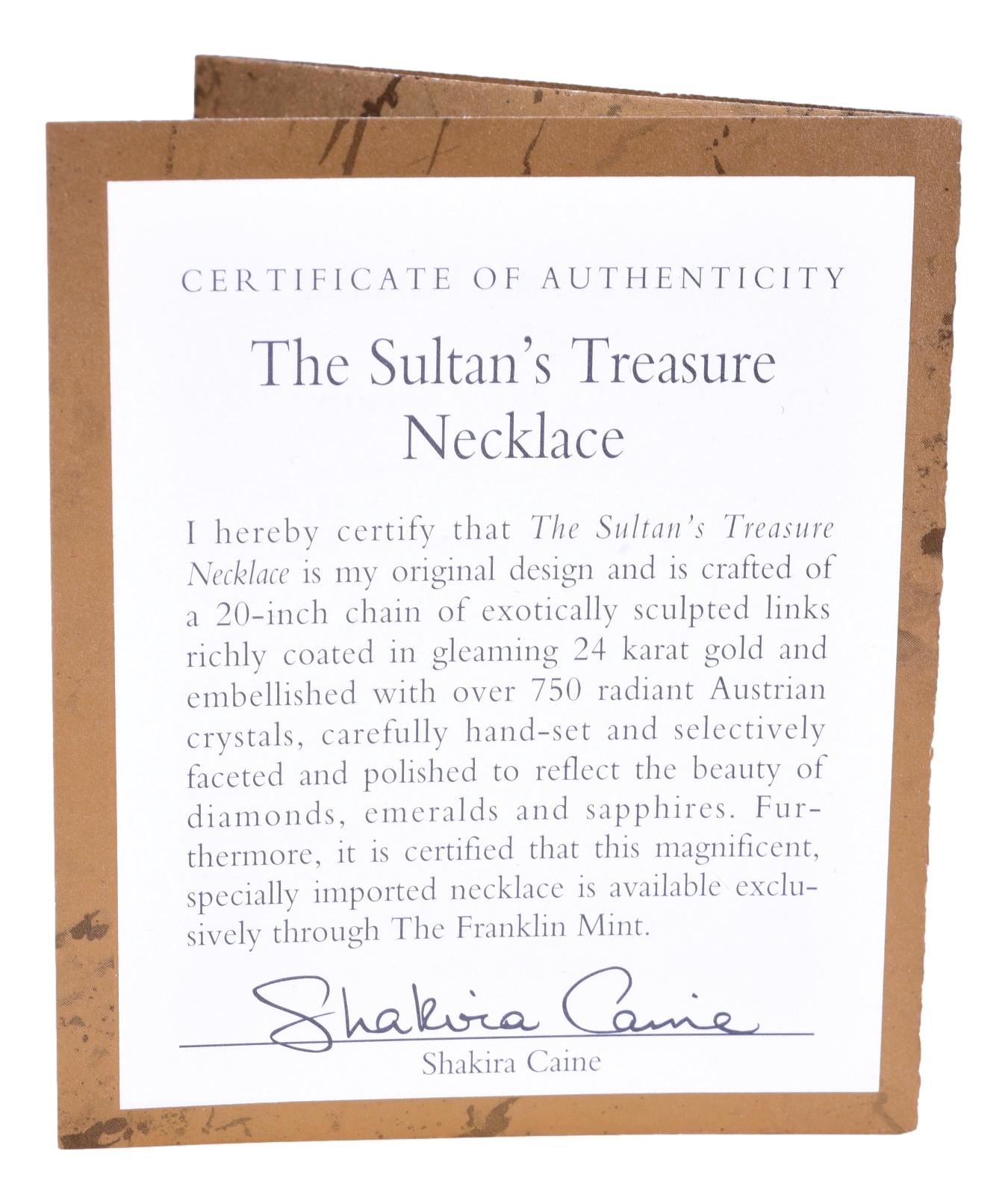 The Sultan's Treasure jewelry set is an original design by Shakira Caine (wife of actor Michael Caine) and is crafted of exotically sculpted links richly coated in gleaming 24 karat gold and embellished with over 750 radiant Austrian crystals, carefully hand set and selectively faceted and polished to reflect the beauty of diamonds, emeralds and sapphires. Truly stunning!