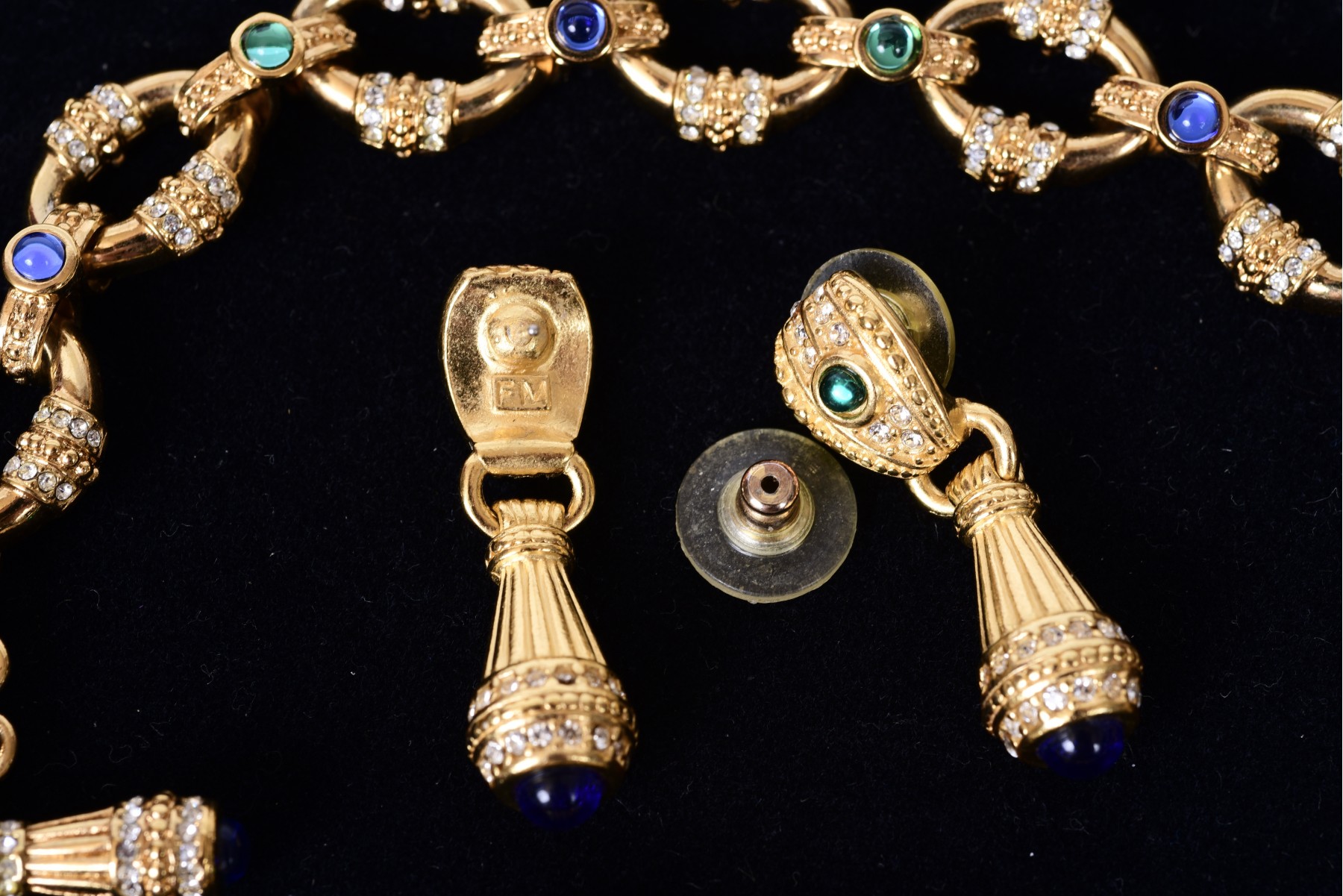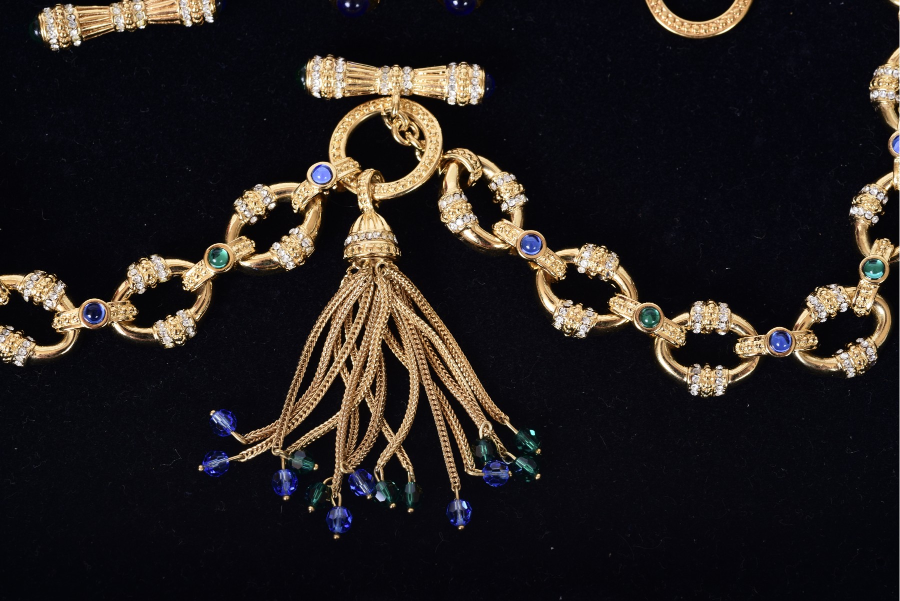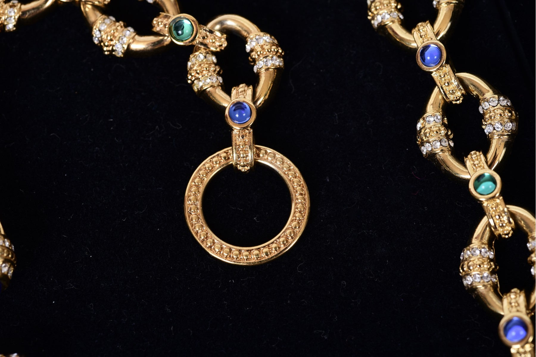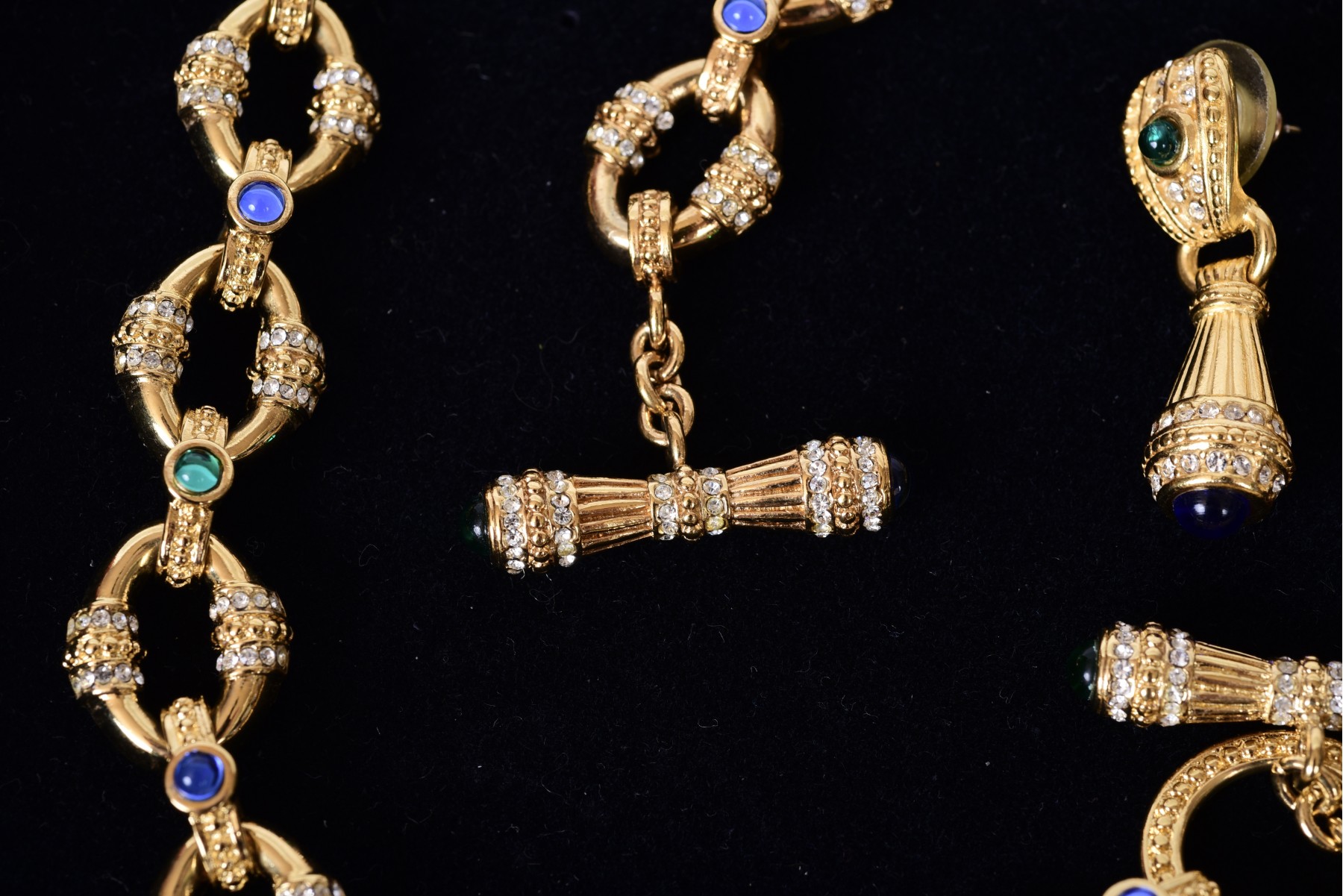 The Sultan's Treasure jewelry set is an original design by Shakira Caine (wife of actor Michael Caine) and is crafted of exotically sculpted links richly coated in gleaming 24 karat gold and embellished with over 750 radiant Austrian crystals, carefully hand set and selectively faceted and polished to reflect the beauty of diamonds, emeralds and sapphires. Truly stunning!
