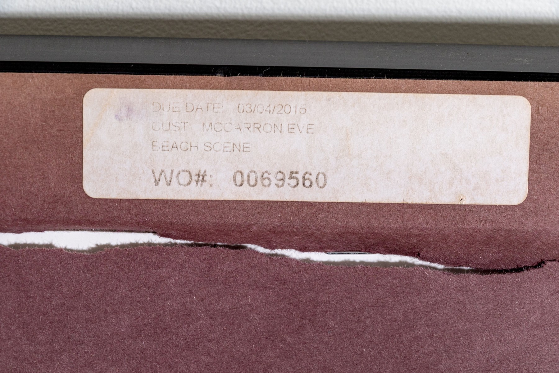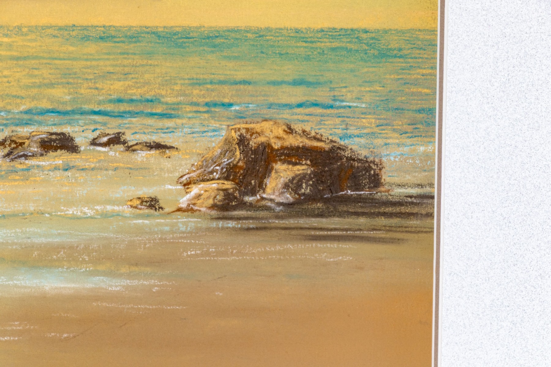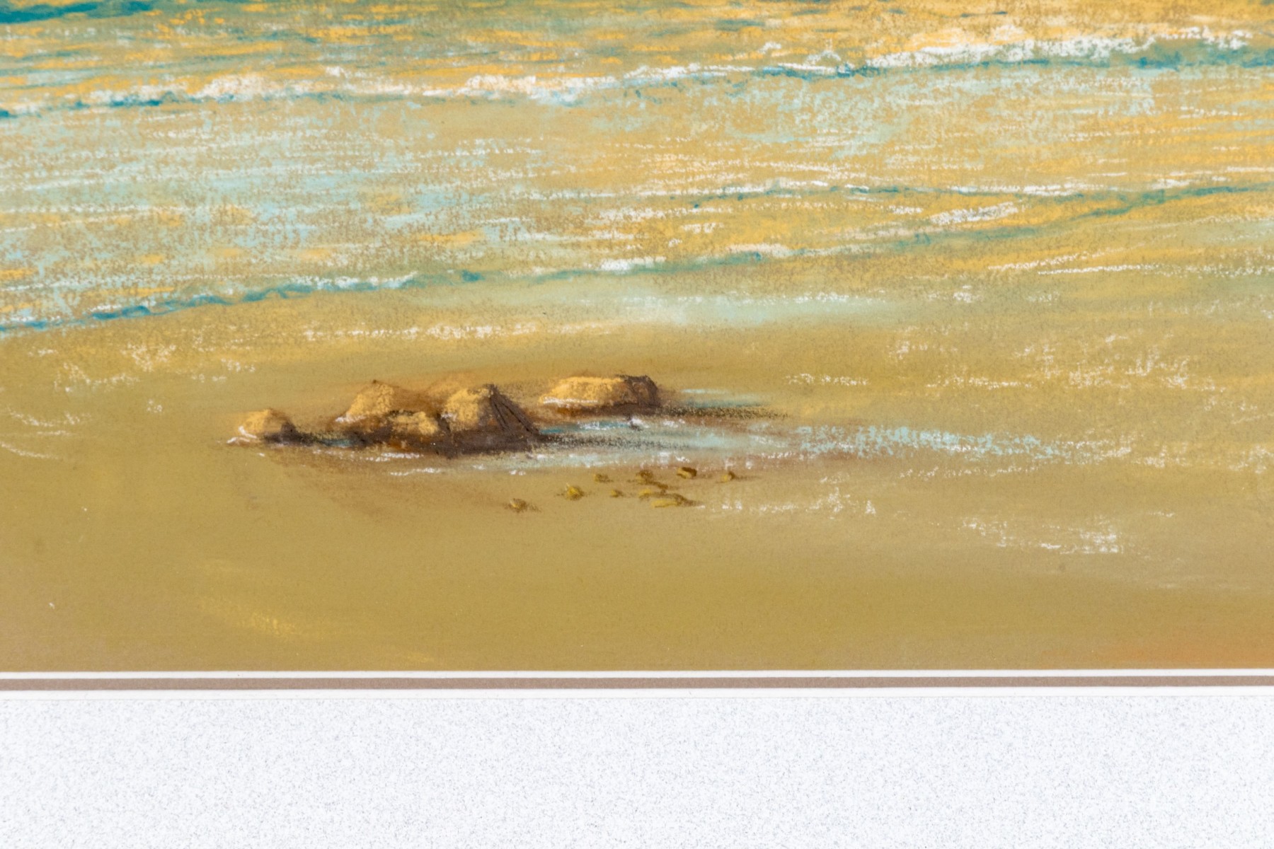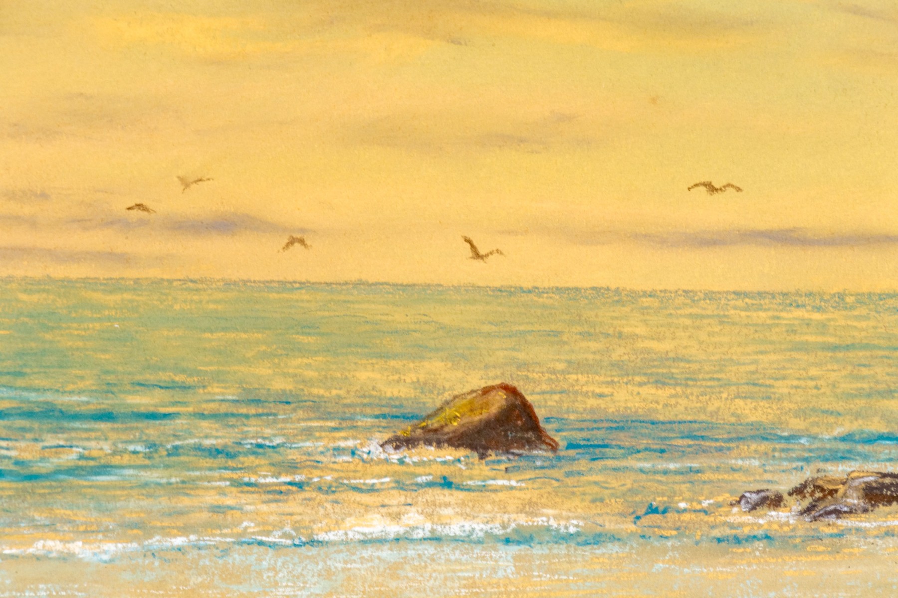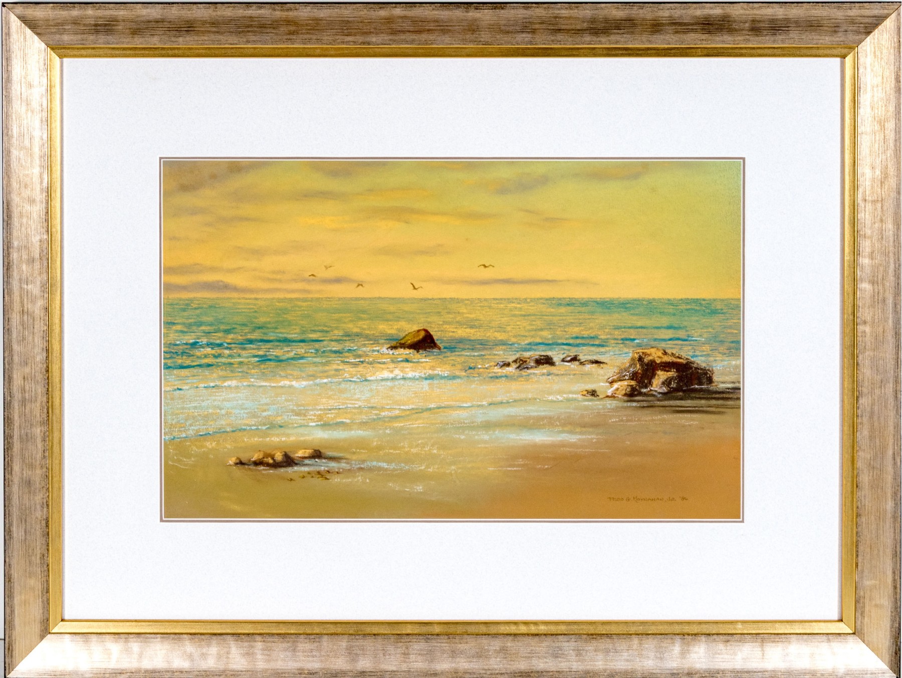 Beach with rocky outcrops and seagulls overhead. Presented custom framed with gilt finished liner and gilt frame and glazed.