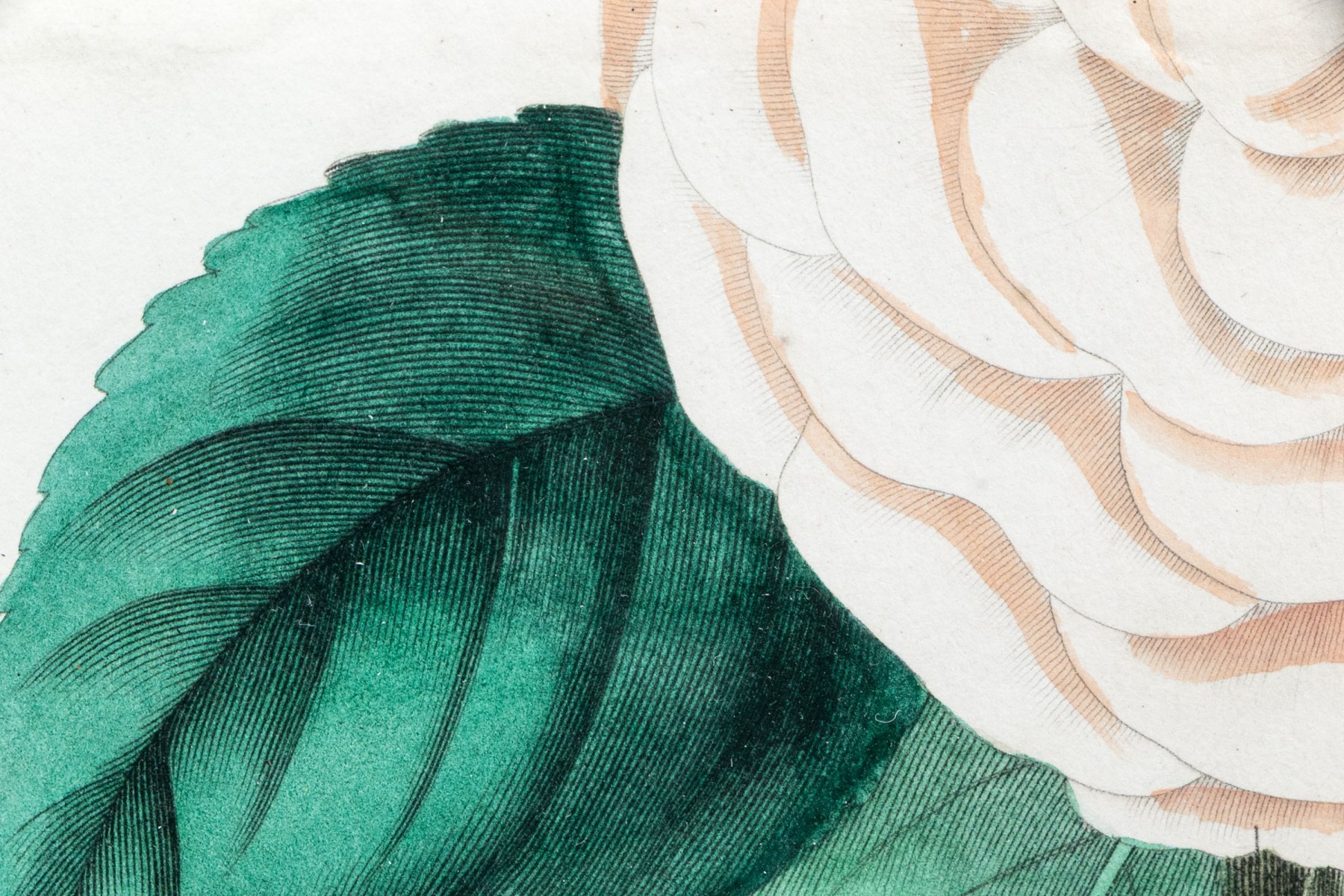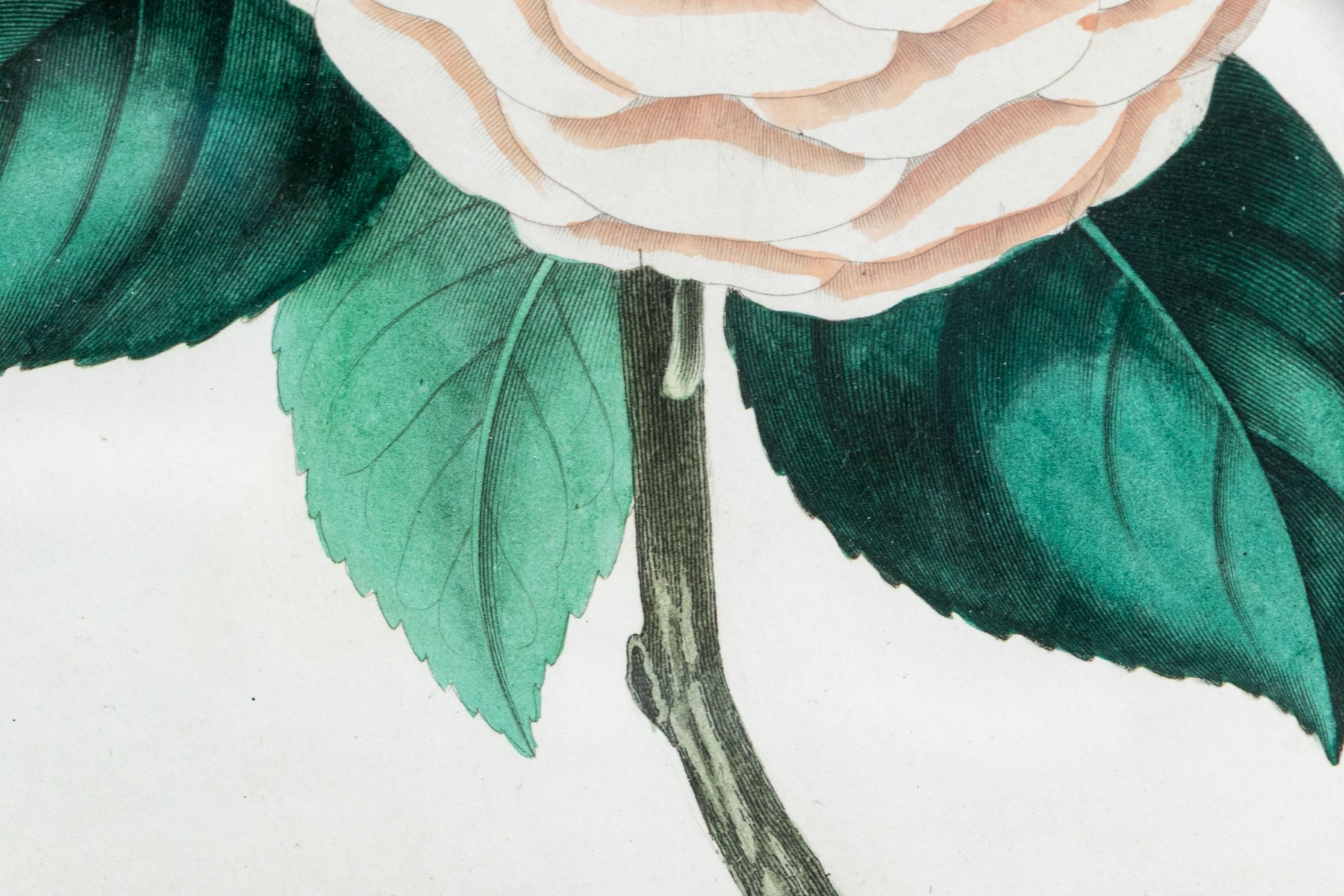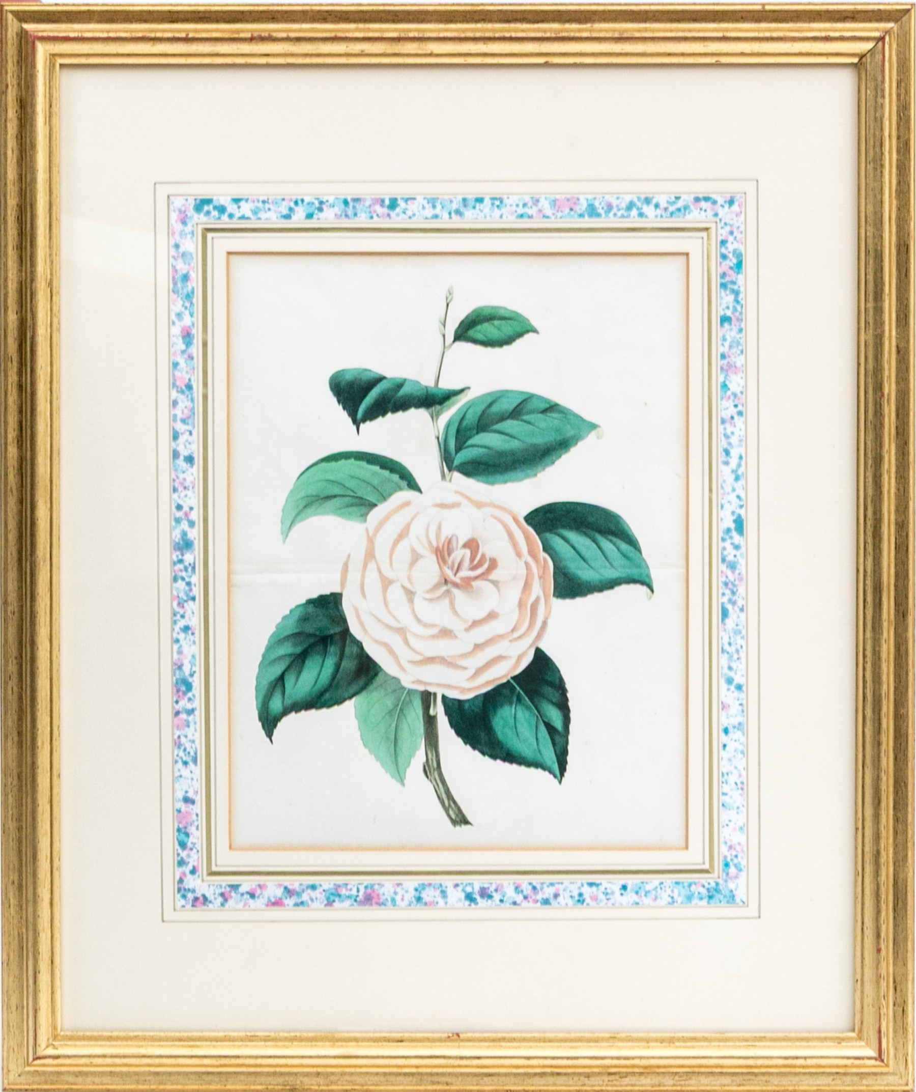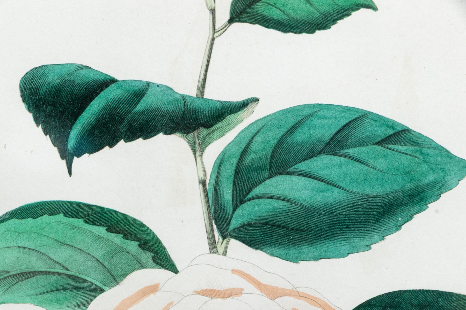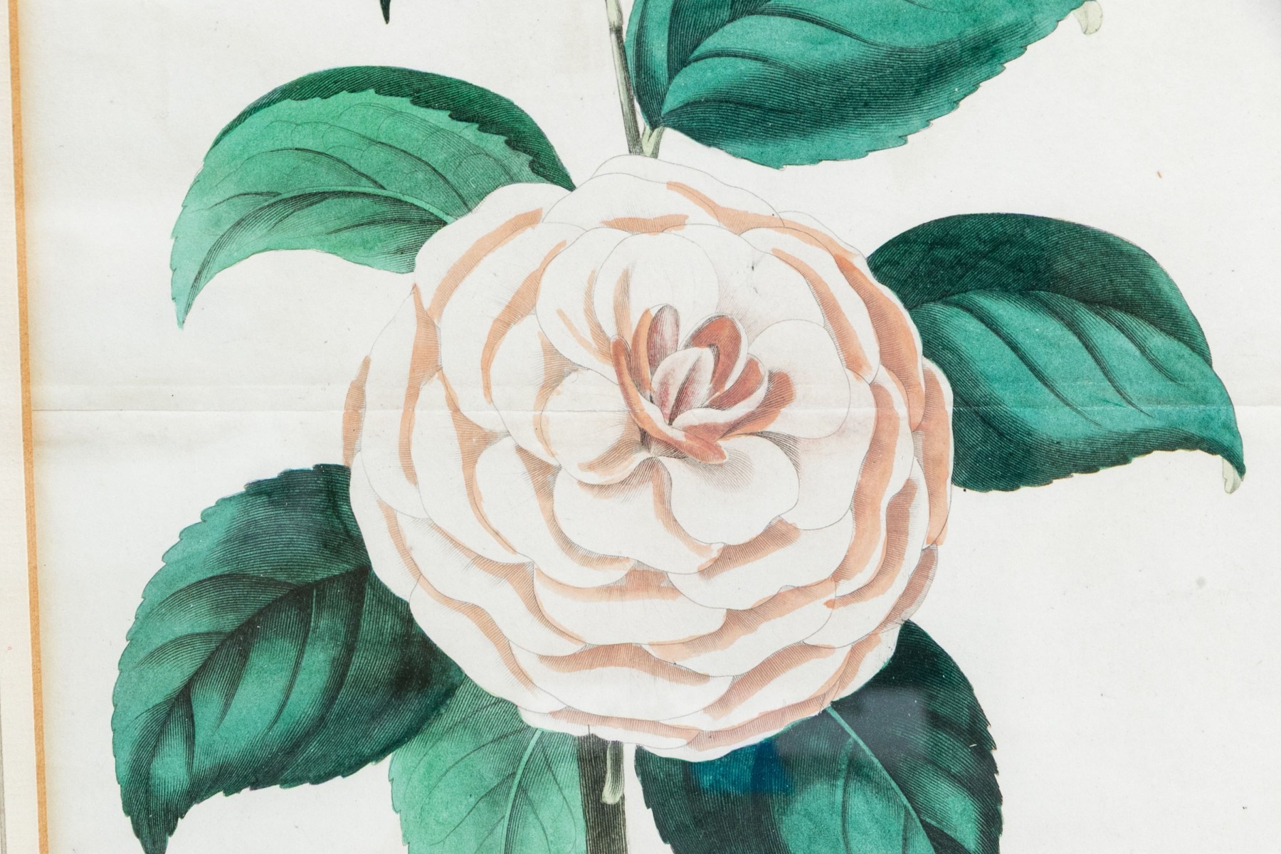 A beautiful hand-colored print after the original artwork by Frederick William Smith (British, 1797-1935) "Camellia Japonica Chandleri" as seen in Joseph Paxton (English, 1803-1865) "Magazine of Botany and Register of Flowering Plants" published by Wm. S. Orr & Co., 1830's. The plate depicts a beautiful white camellia with pink shadowing around the petal edges blooming on a tapering branch with large, lush green leaves.