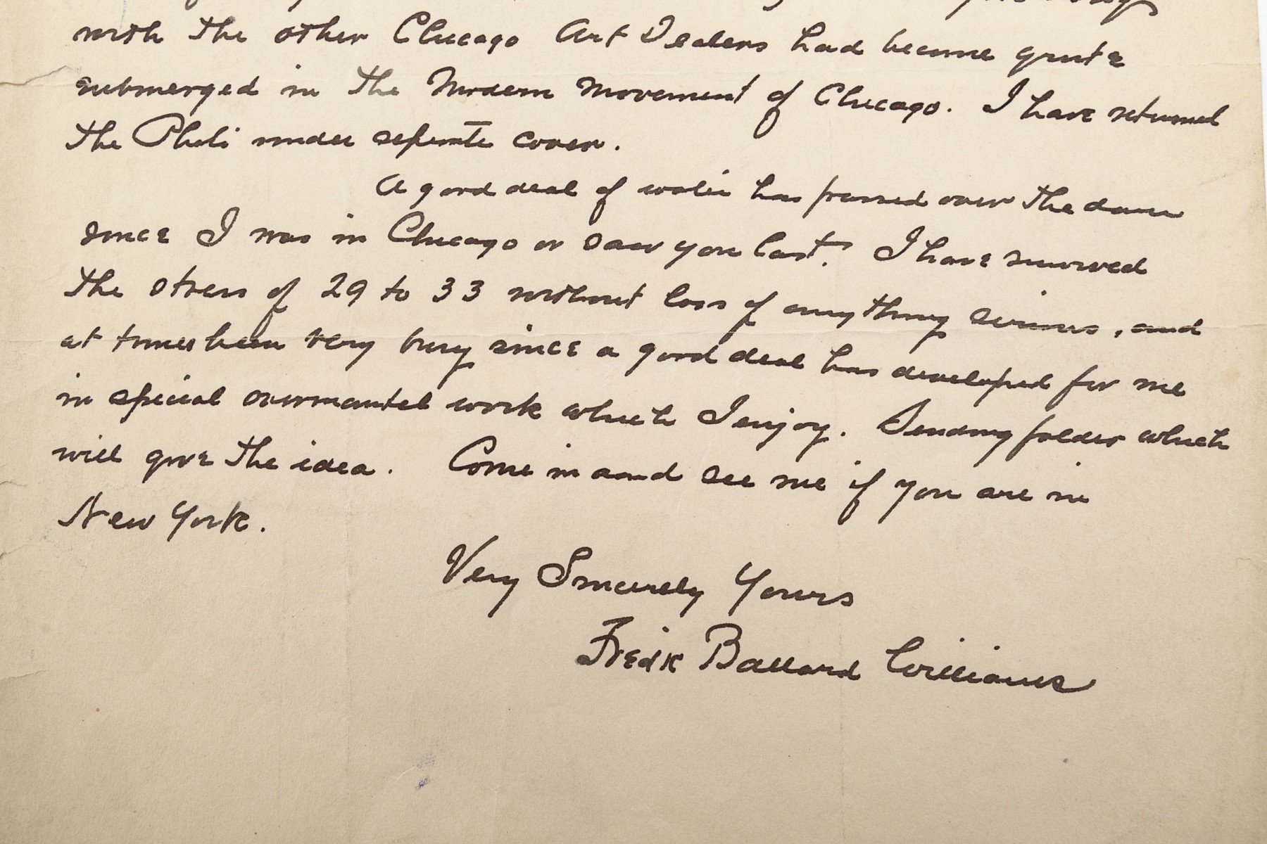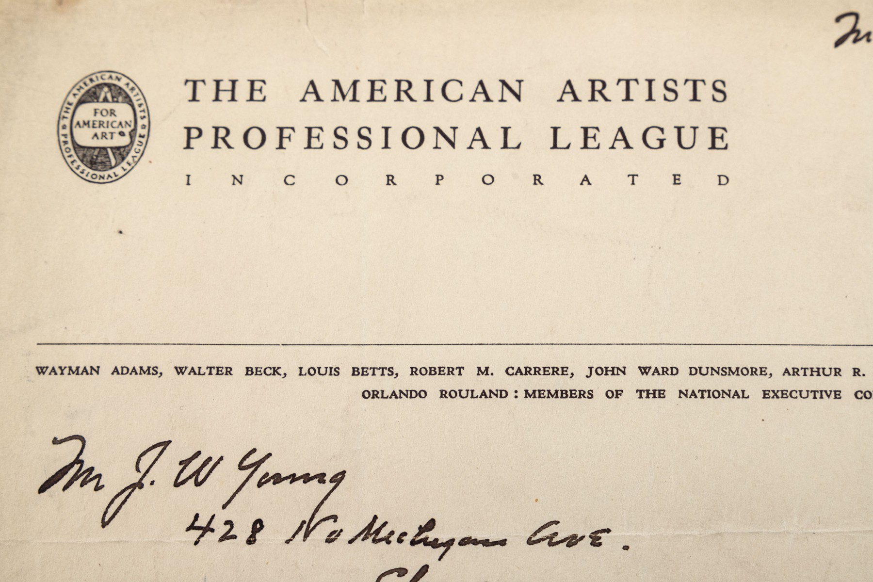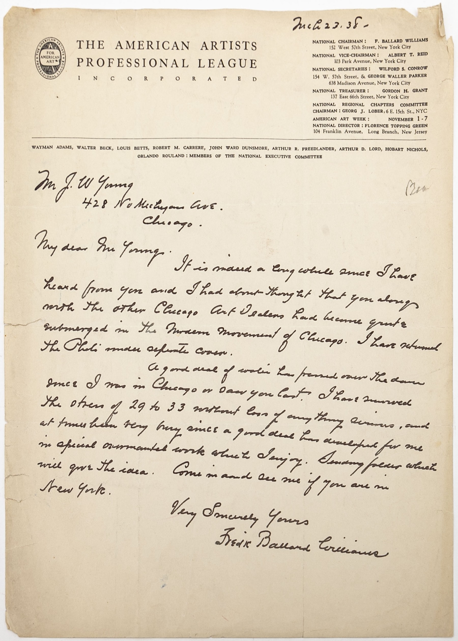 Fredrick Ballard Williams (American painter, 1871-1956) signed & handwritten letter in ink to Chicago art dealer, J.W. Young, regarding checking in, mentioned the Modern Movement of Chicago and offered seeing him whenever he is back in New York. Written on official stationary from The American Artists Professional League and dated March 23rd, 1938. Signed “Very Sincerely Yours” followed by his full name.