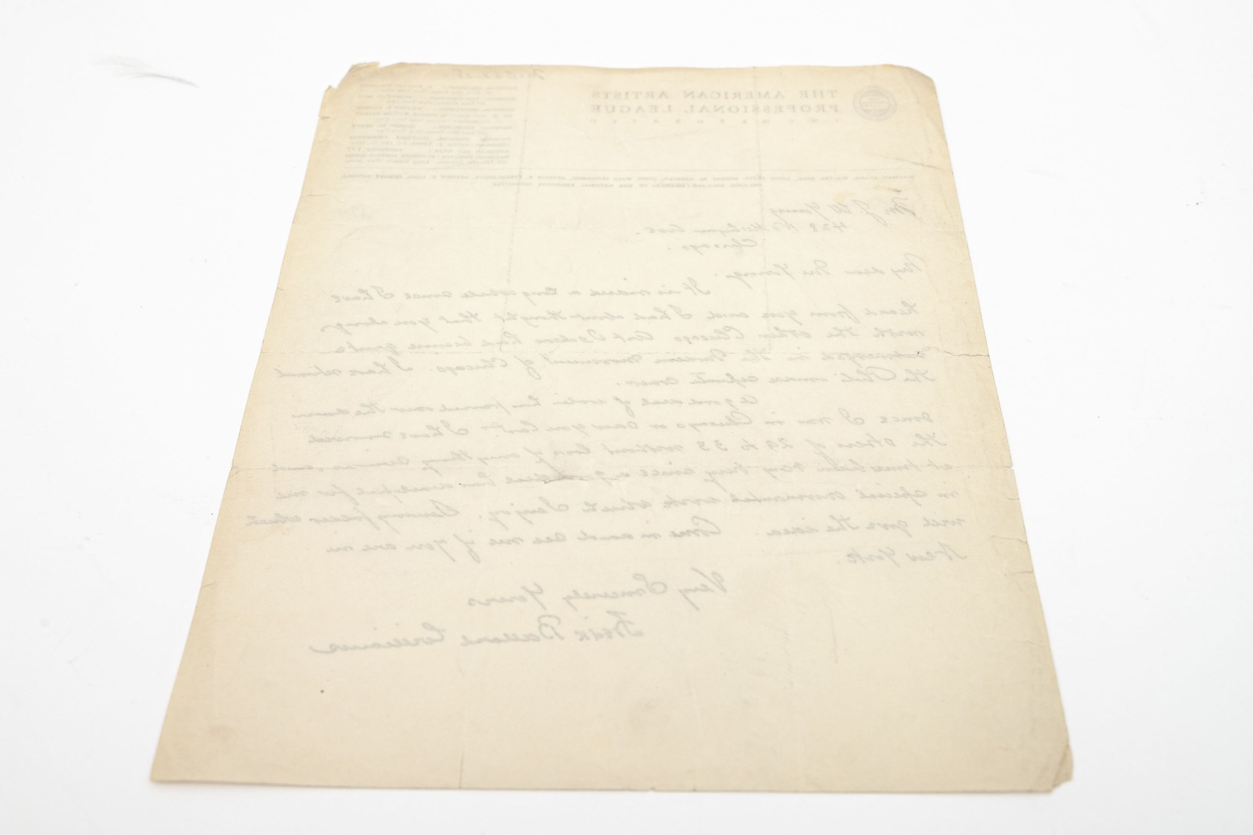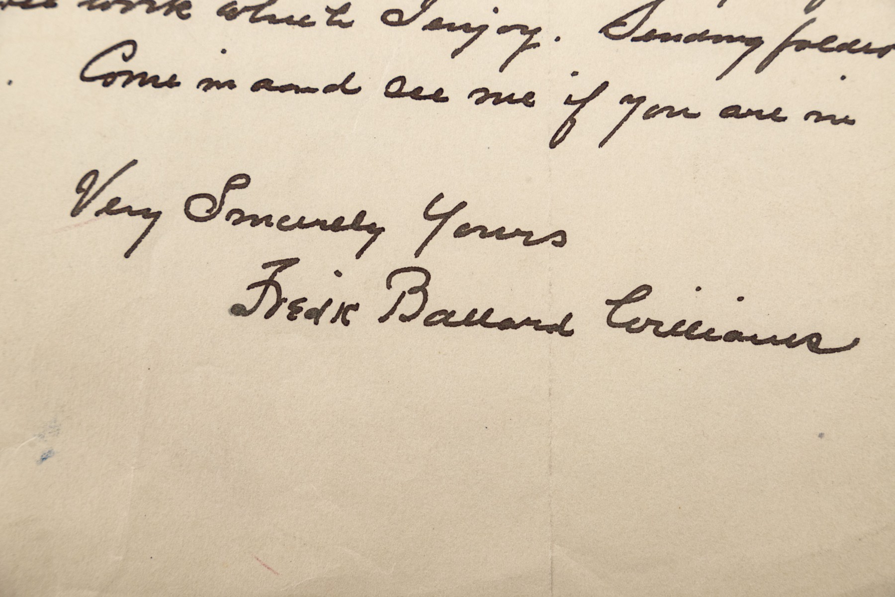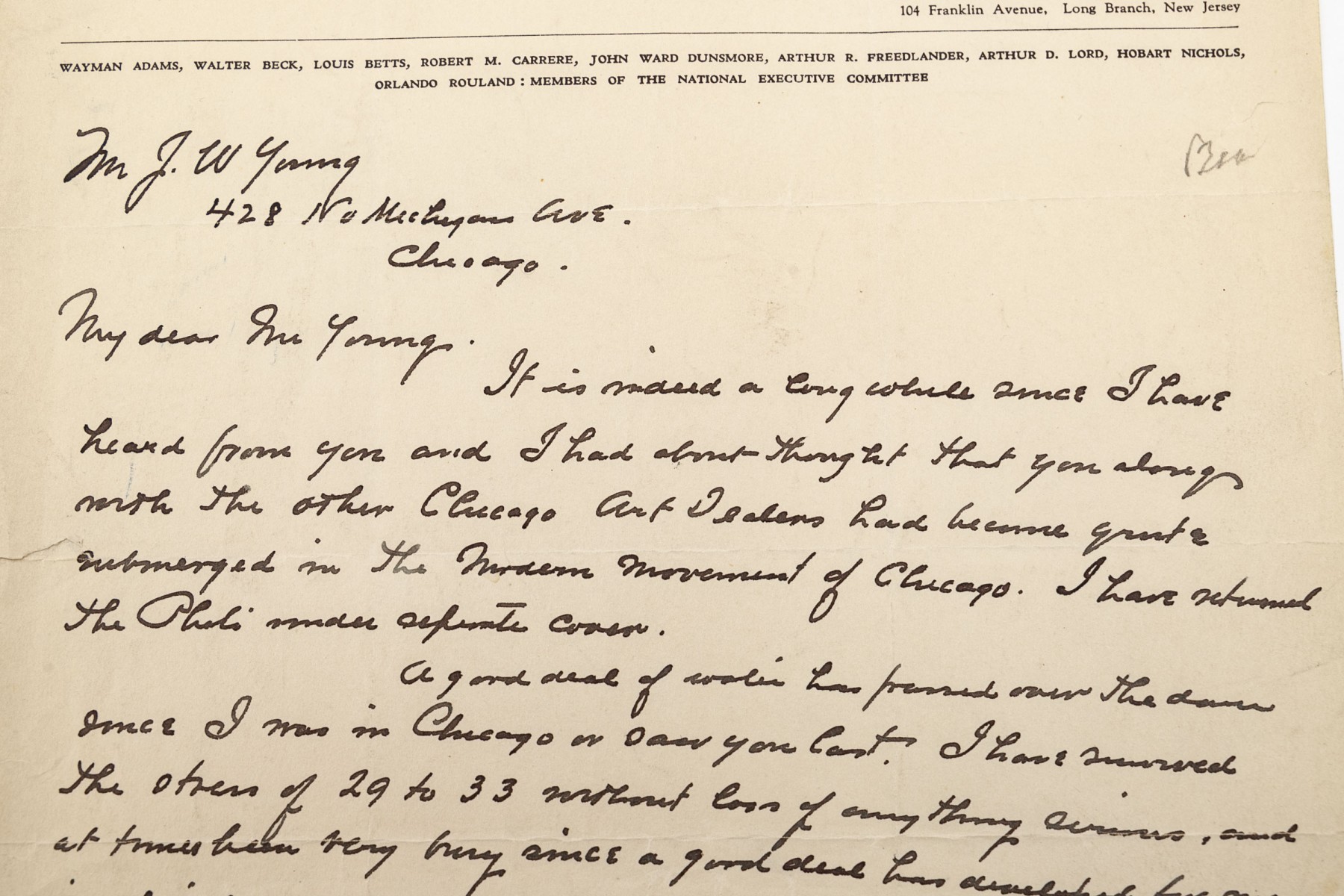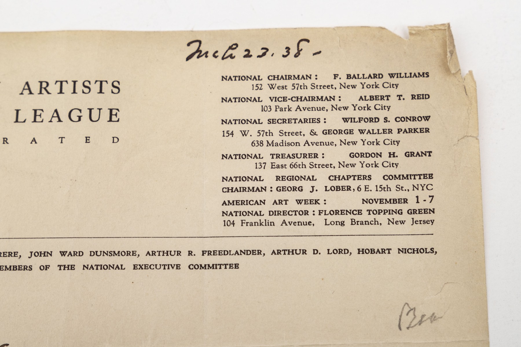 Fredrick Ballard Williams (American painter, 1871-1956) signed & handwritten letter in ink to Chicago art dealer, J.W. Young, regarding checking in, mentioned the Modern Movement of Chicago and offered seeing him whenever he is back in New York. Written on official stationary from The American Artists Professional League and dated March 23rd, 1938. Signed “Very Sincerely Yours” followed by his full name.