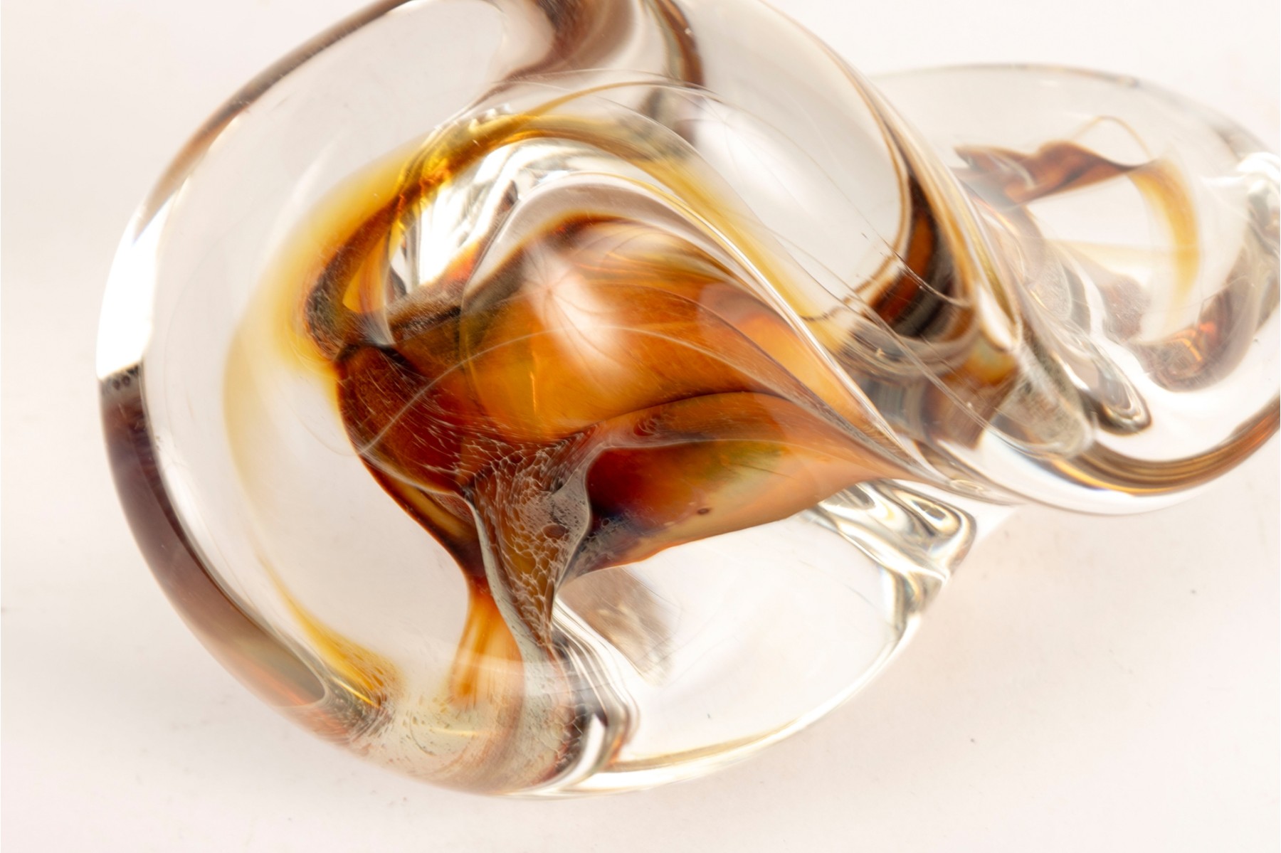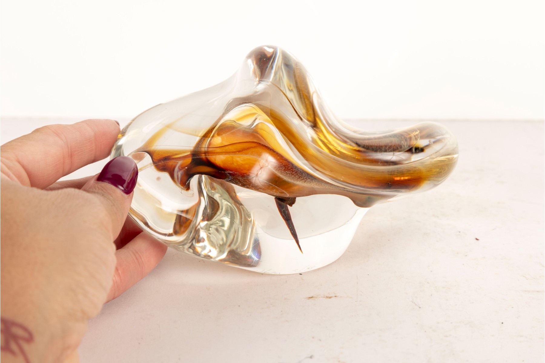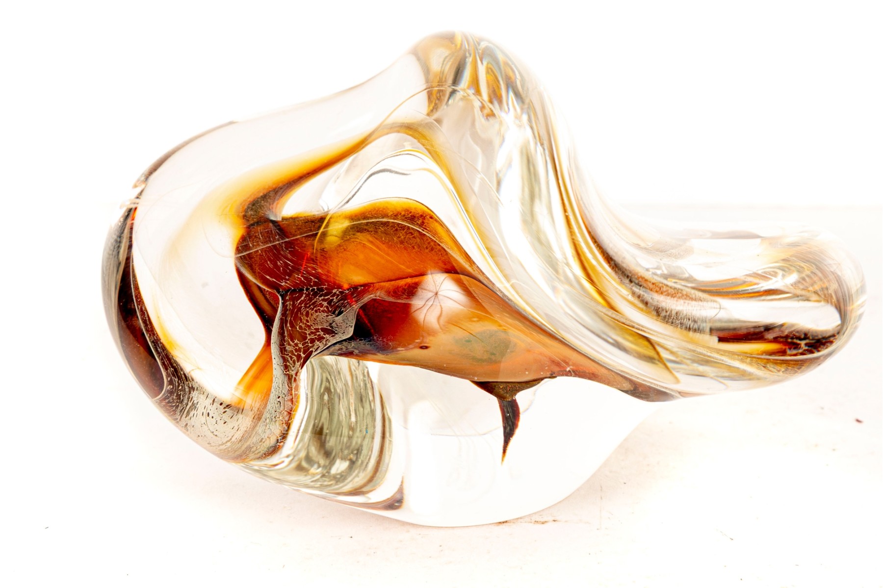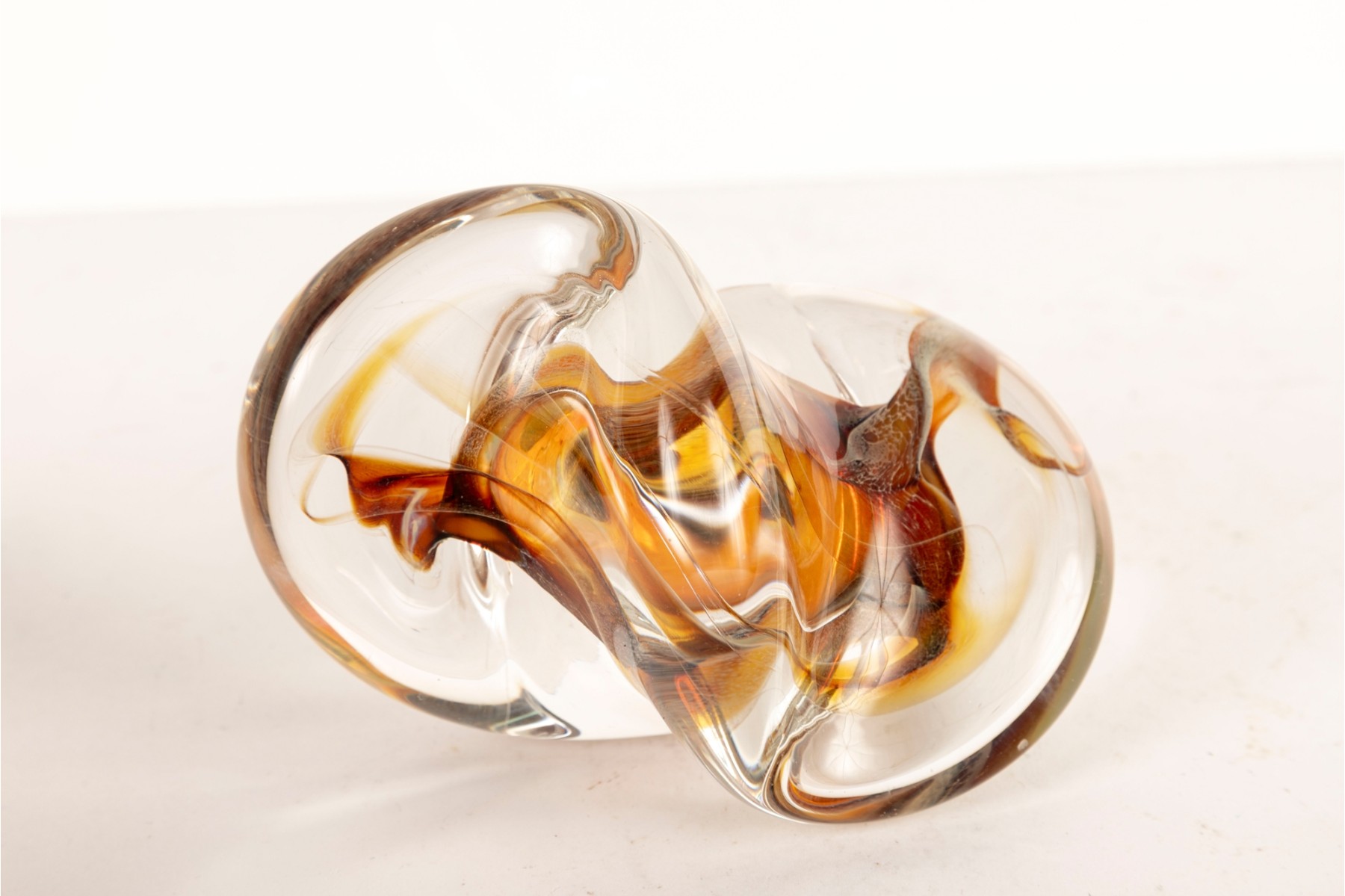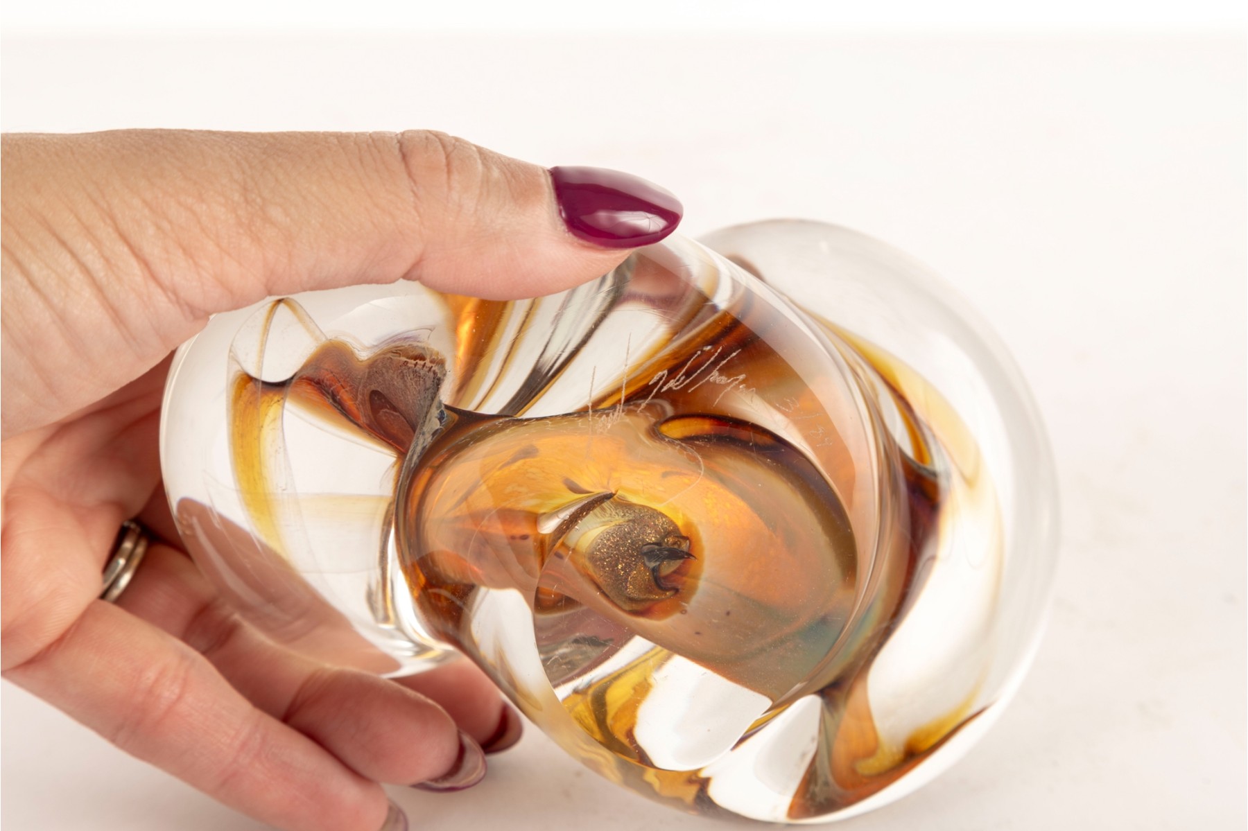 Freeform art glass paperweight featuring a dynamic swirl design in rich amber and mixed hues. A signature can be found on the underside. See photos for details.