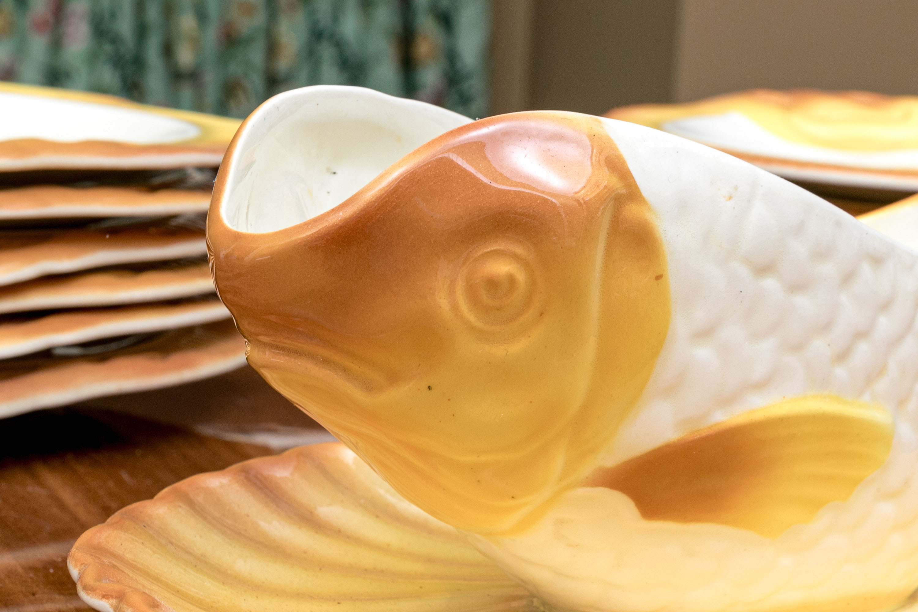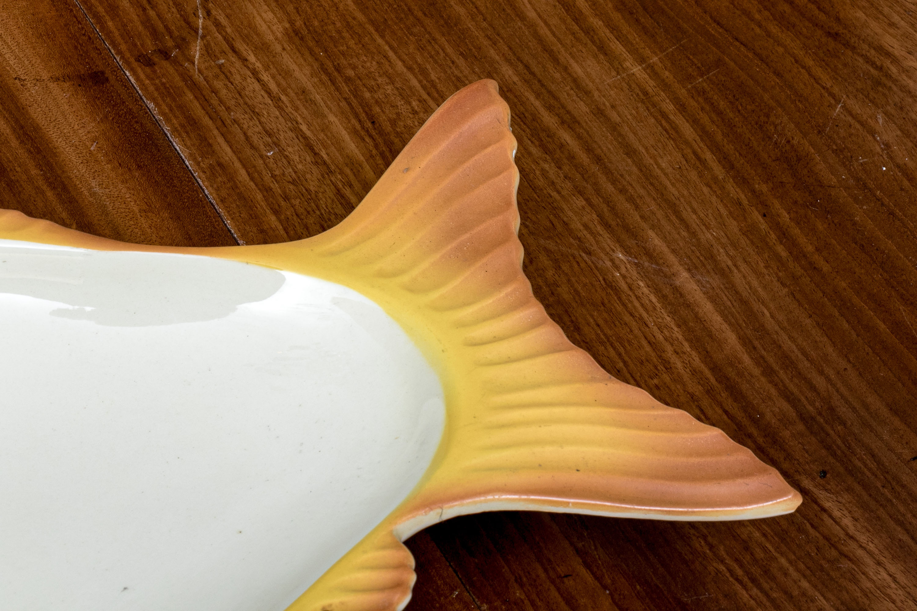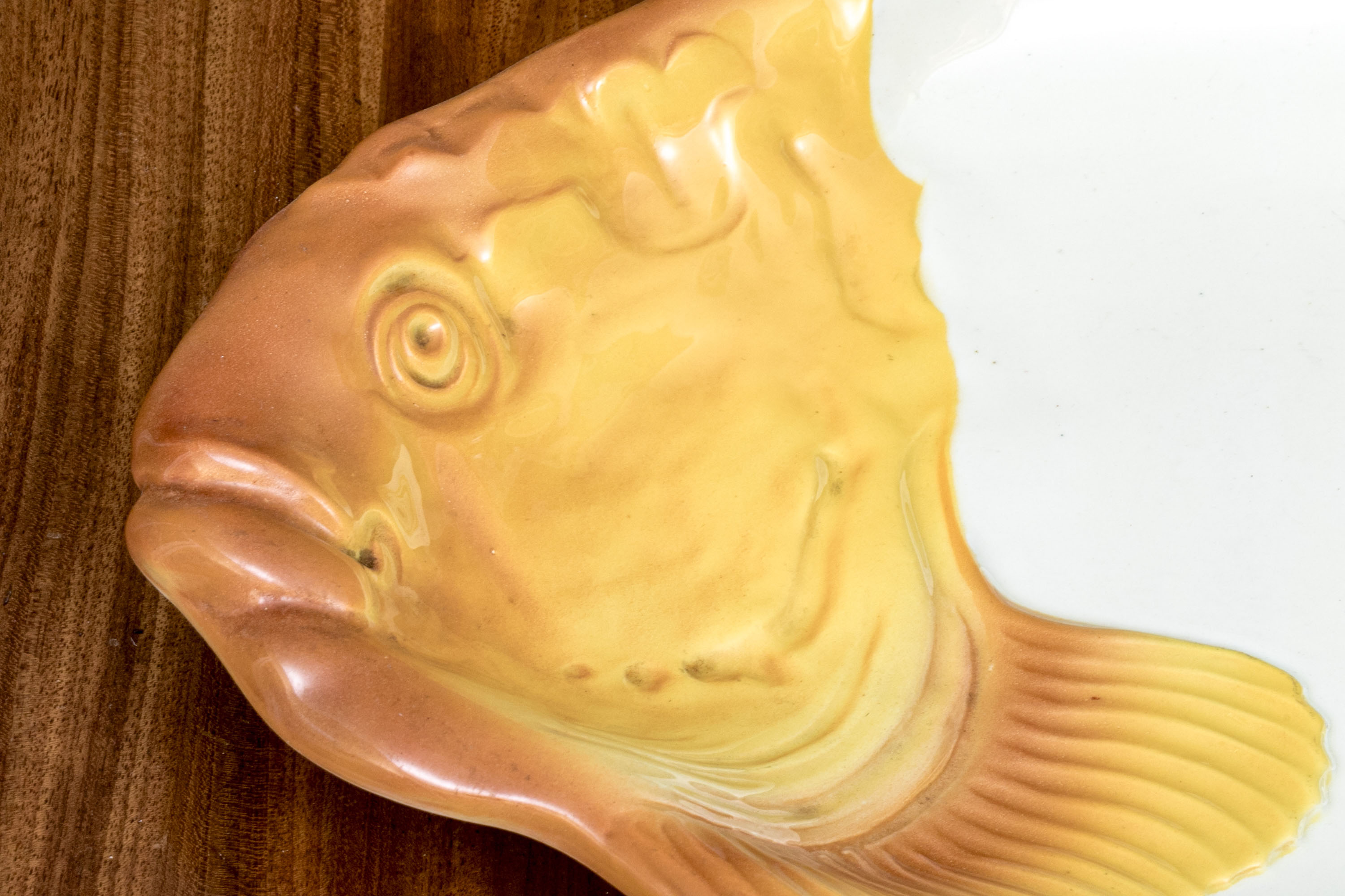 All wonderfully crafted with fish form, textural moulded decoration with yellow finished trim edges.