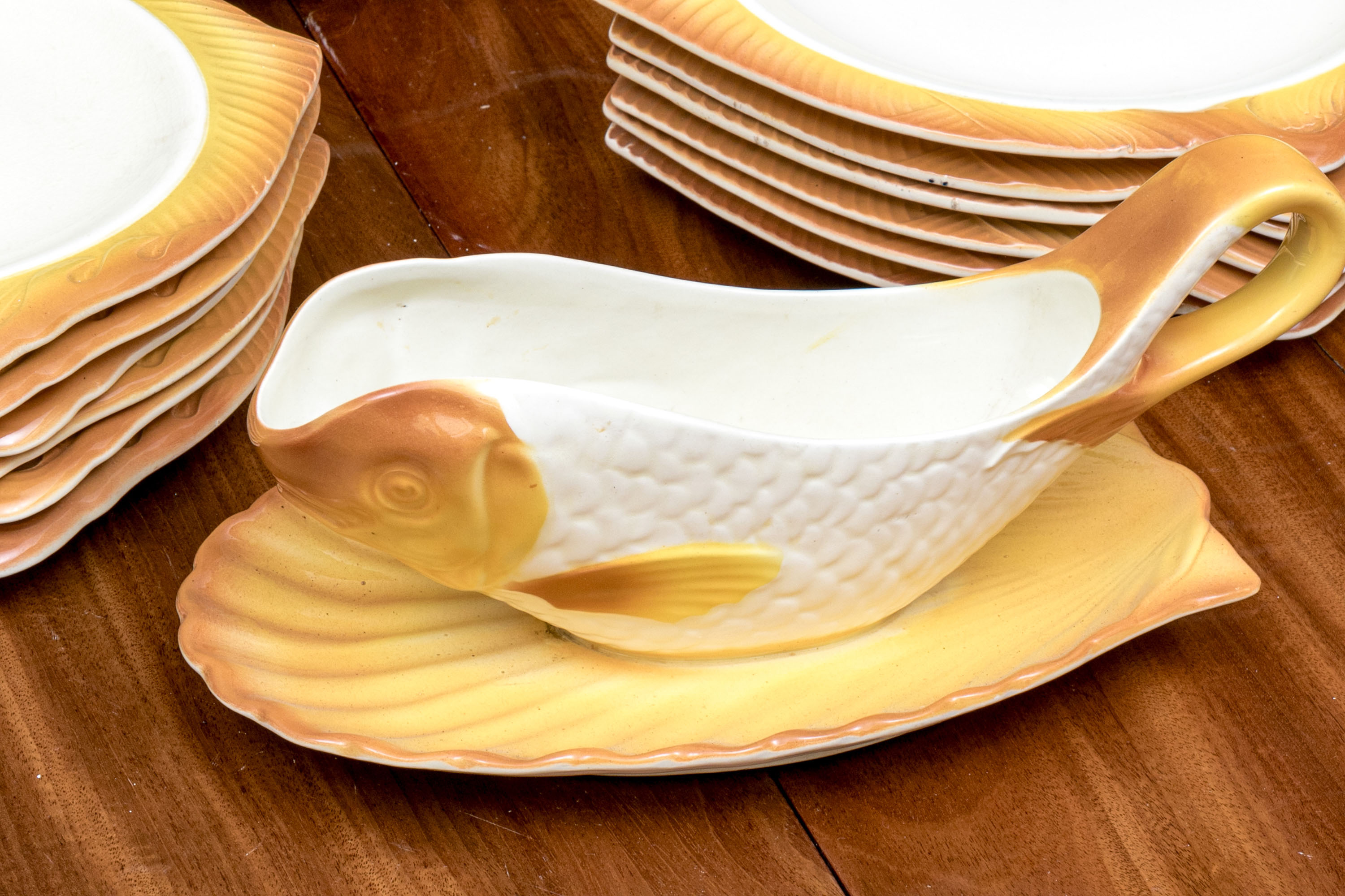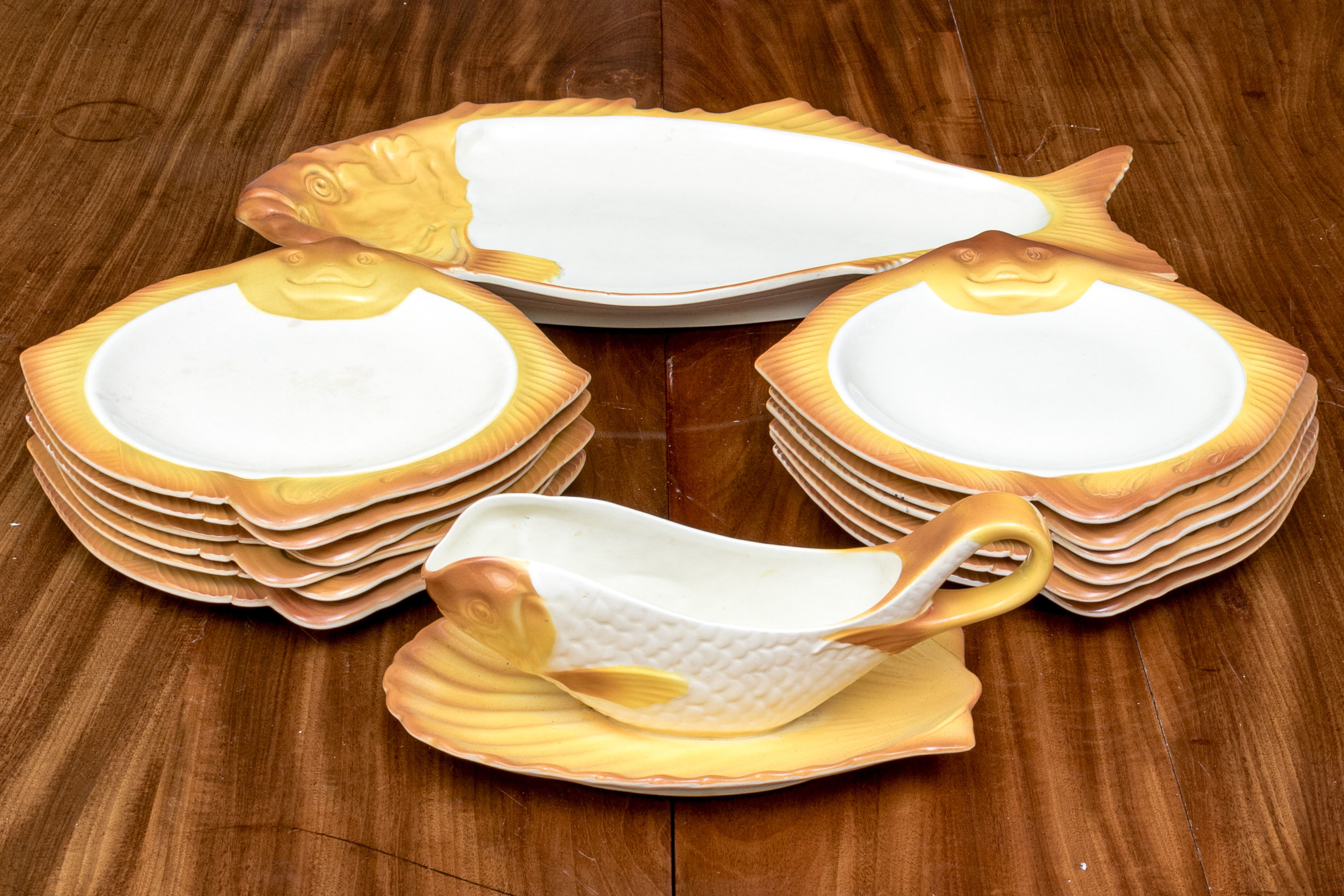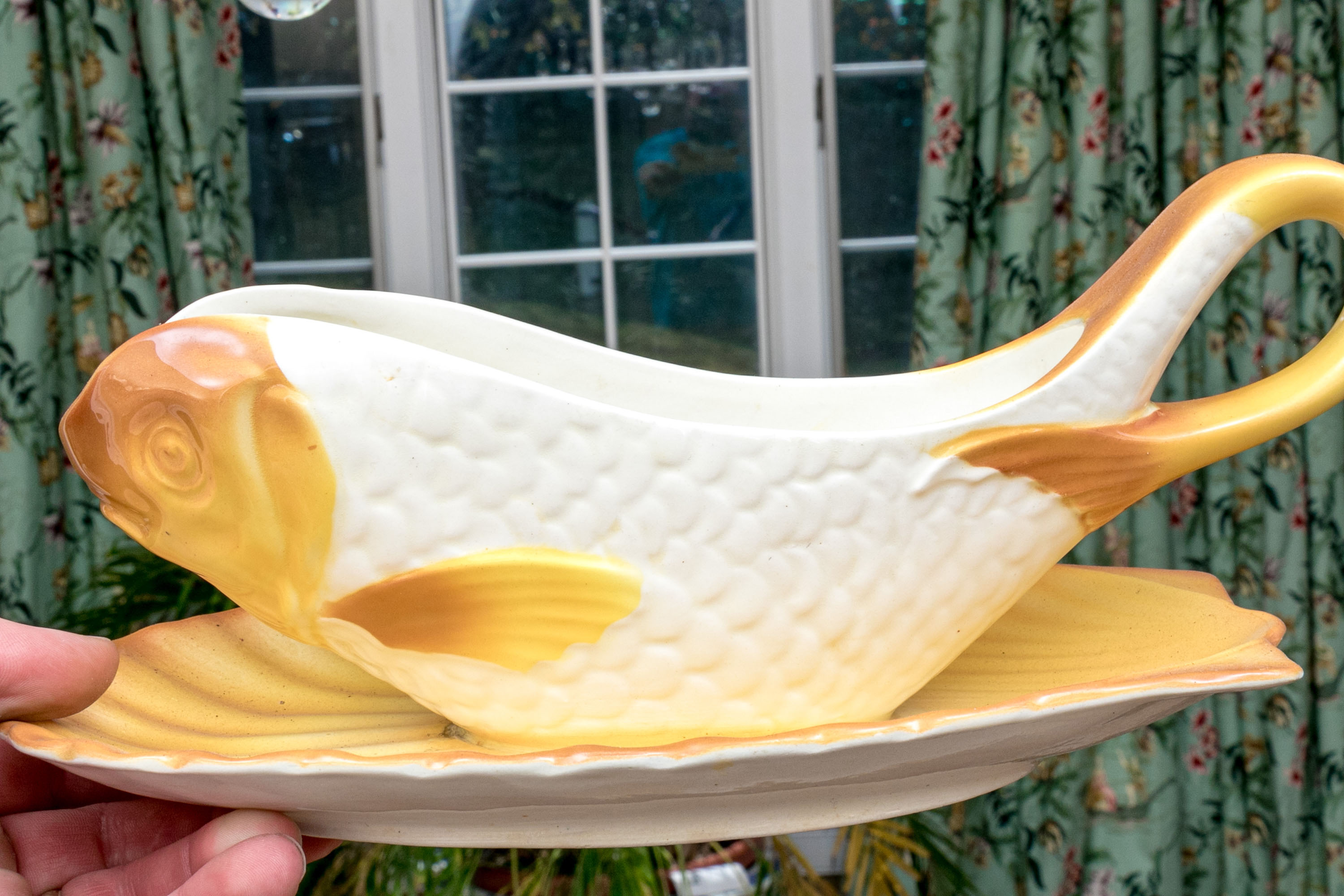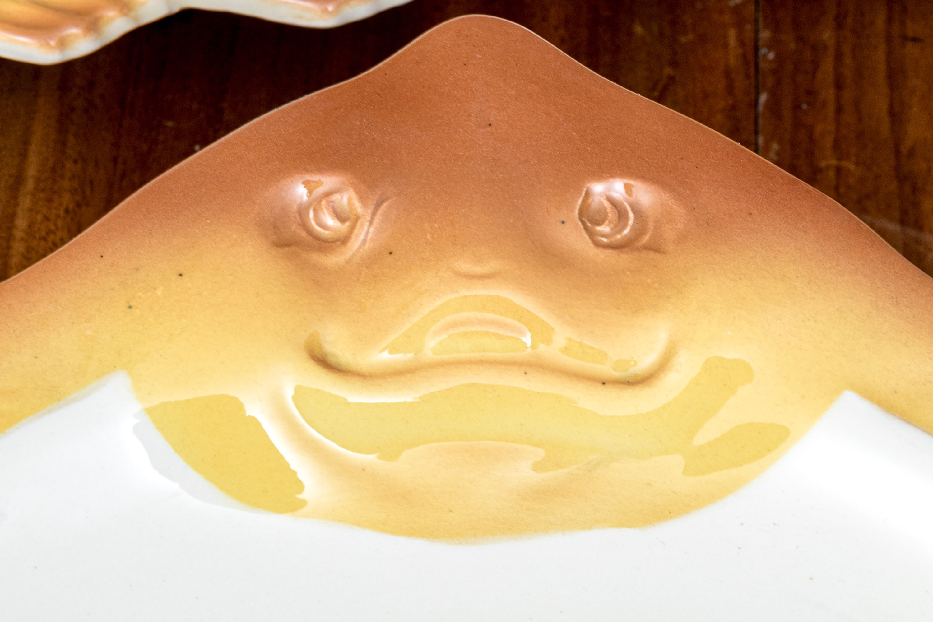 All wonderfully crafted with fish form, textural moulded decoration with yellow finished trim edges.
