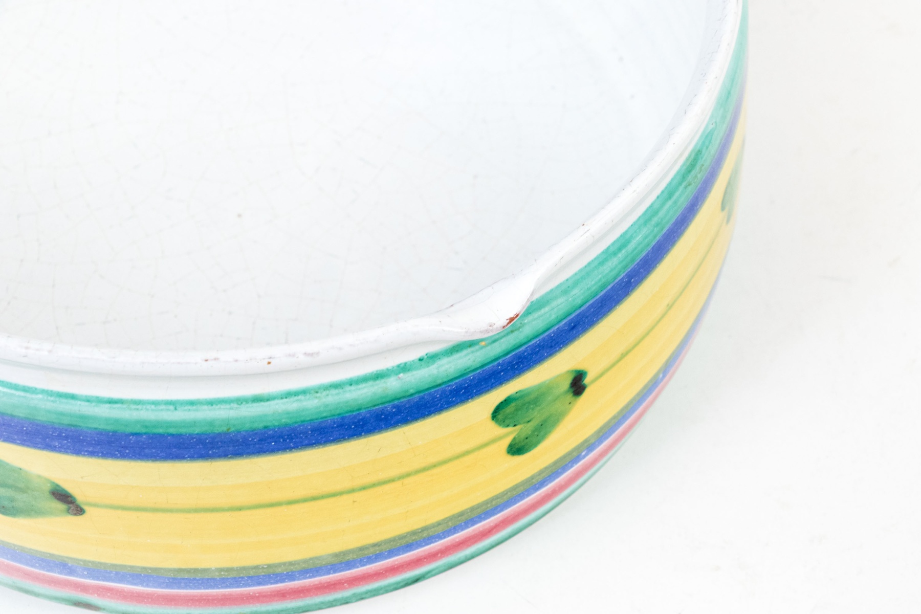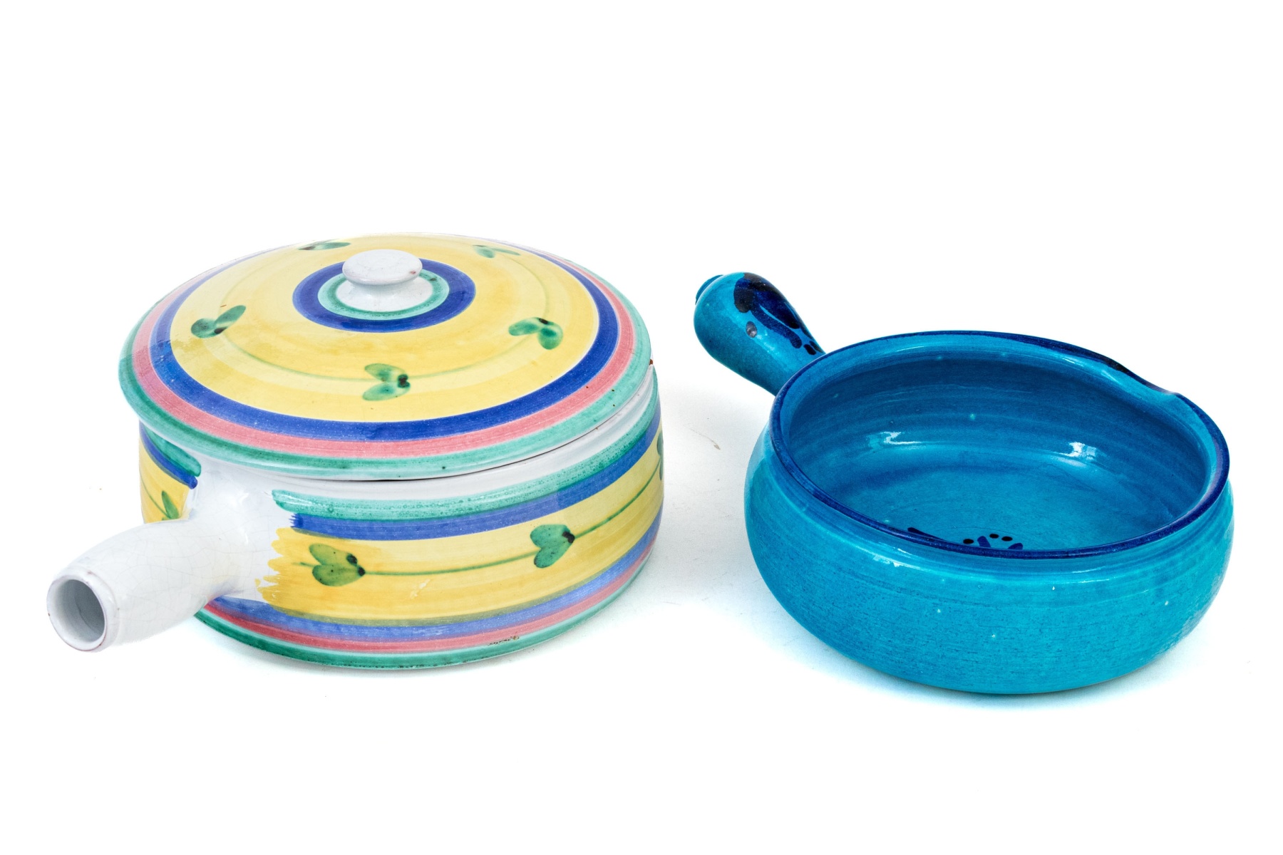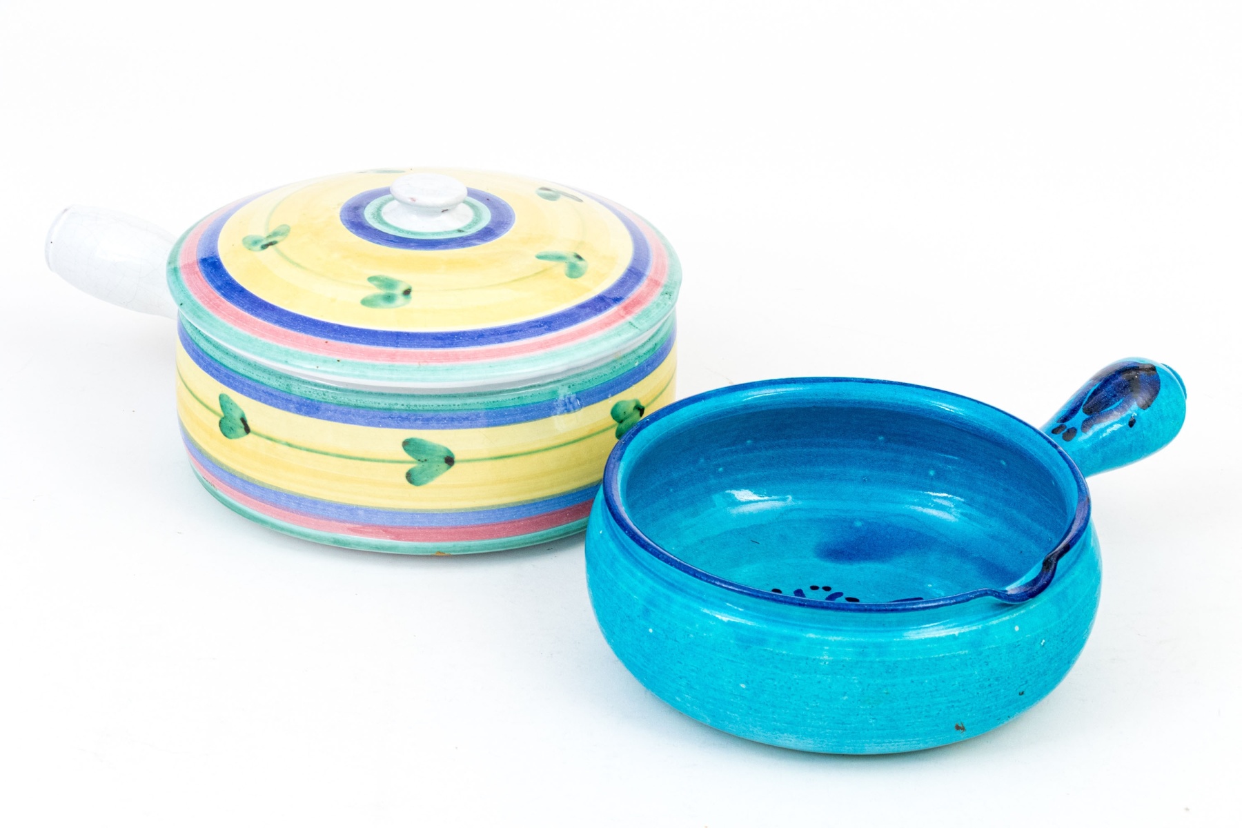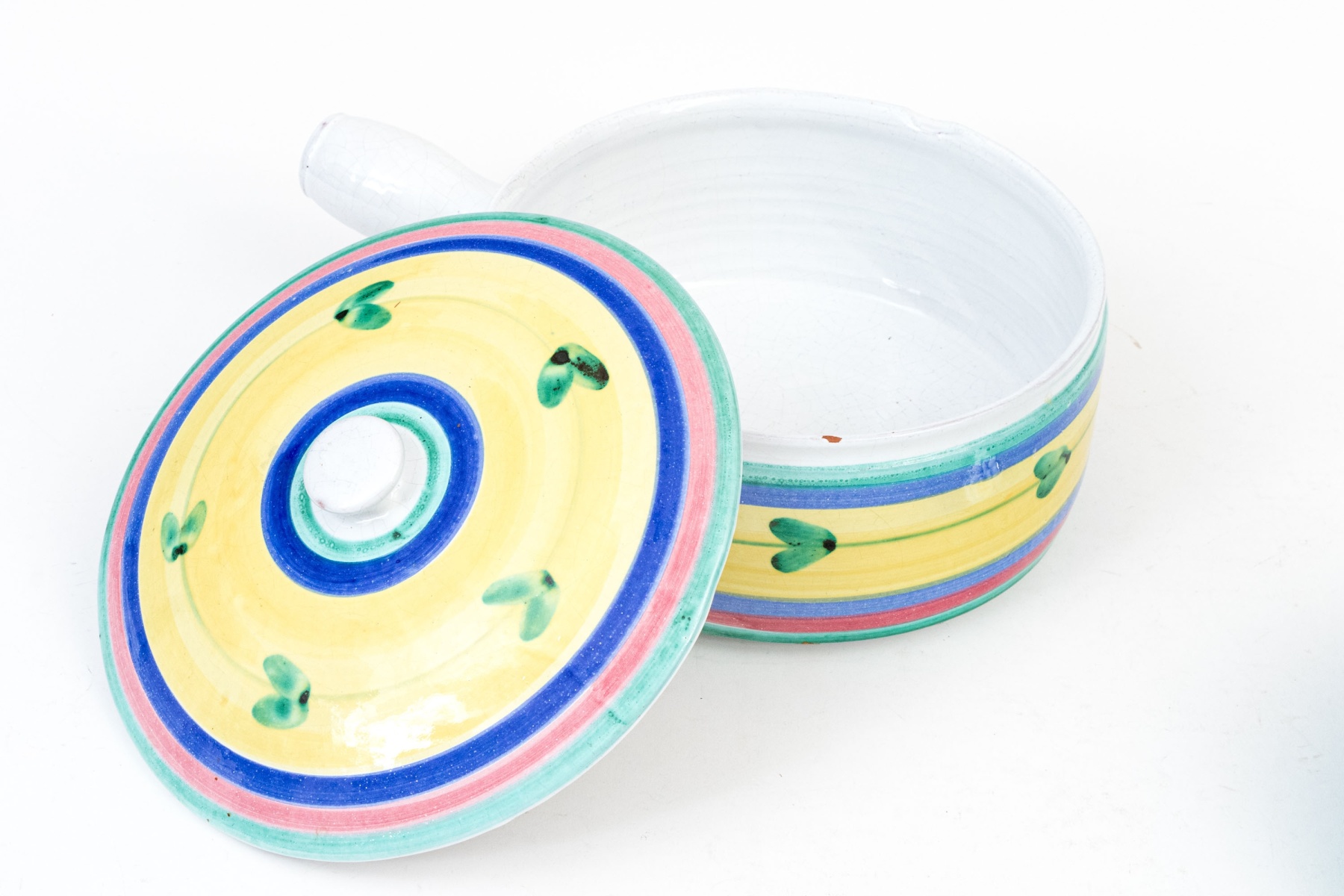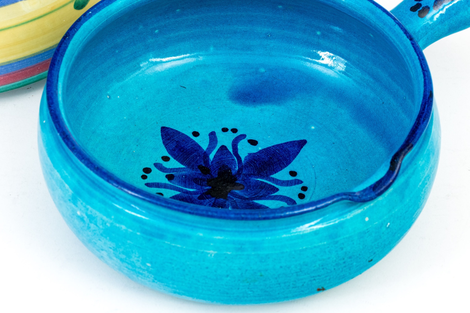 A lovely duo of hand-decorated ceramics including a Caleca lidded casserole in yellow, blue, green, and pink with a wreath of leaves around the center and a single white handle. Accompanied by a French blue glazed soup bowl with a small spout and a single handle to the side, decorated with pretty floral sprays at the center and on the handle. Both marked underfoot.