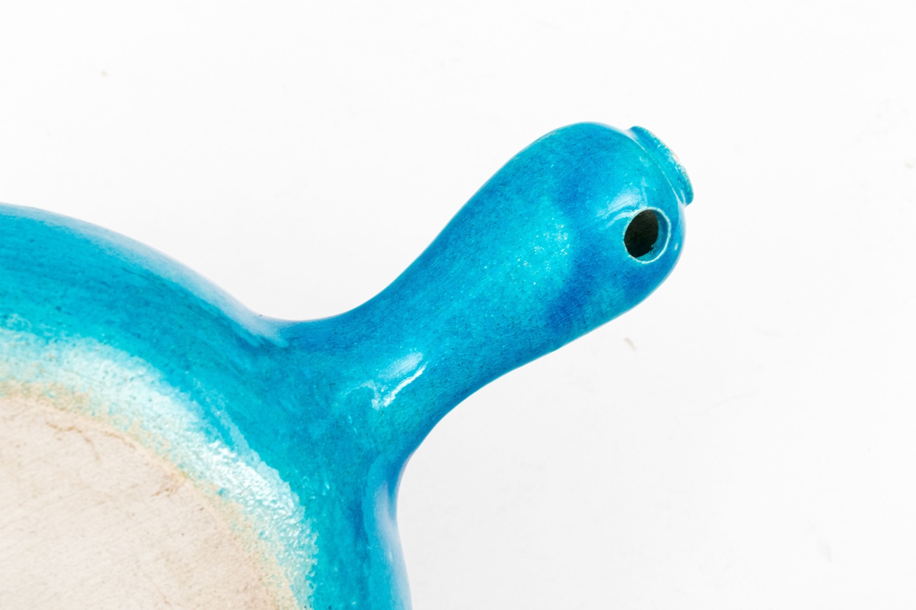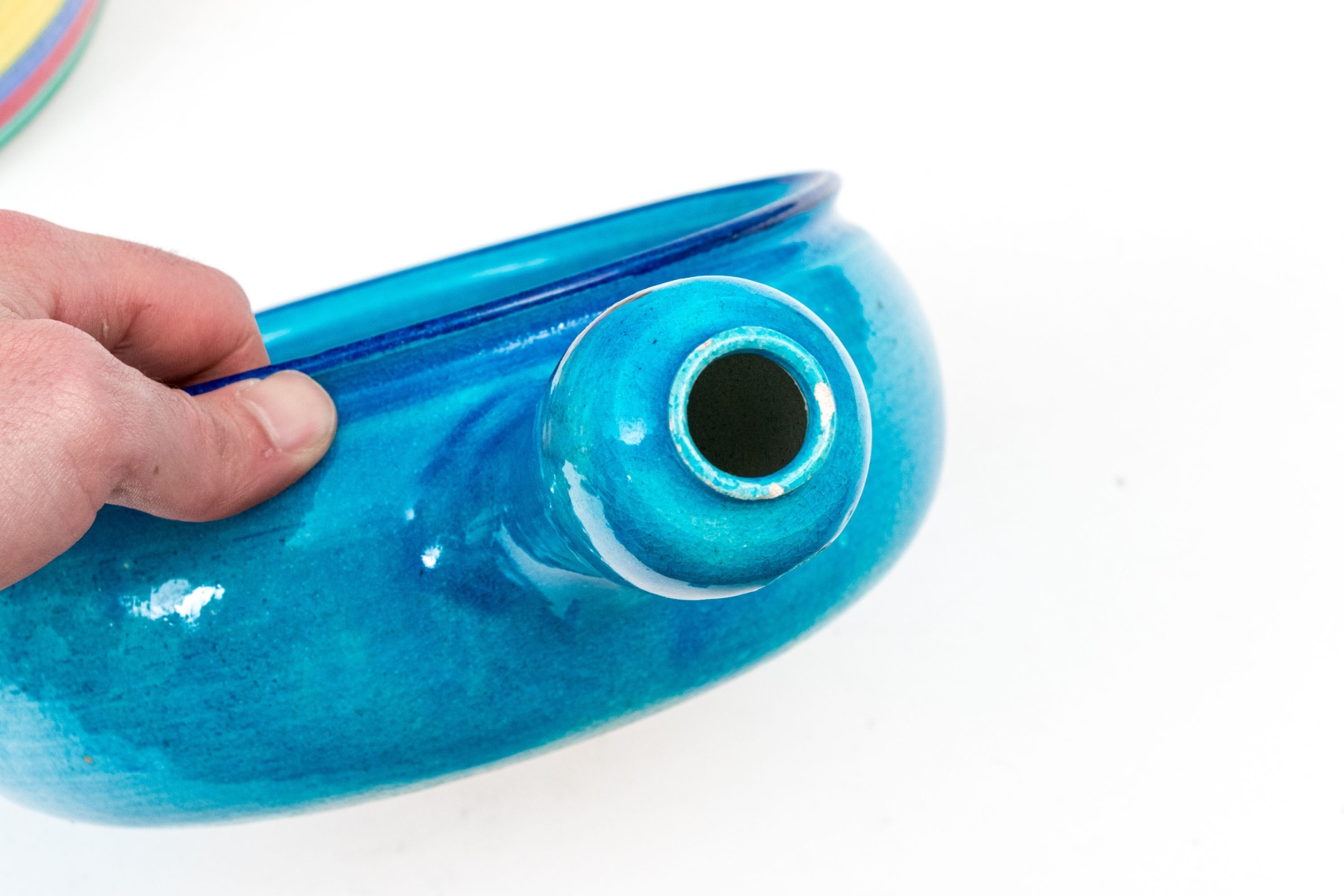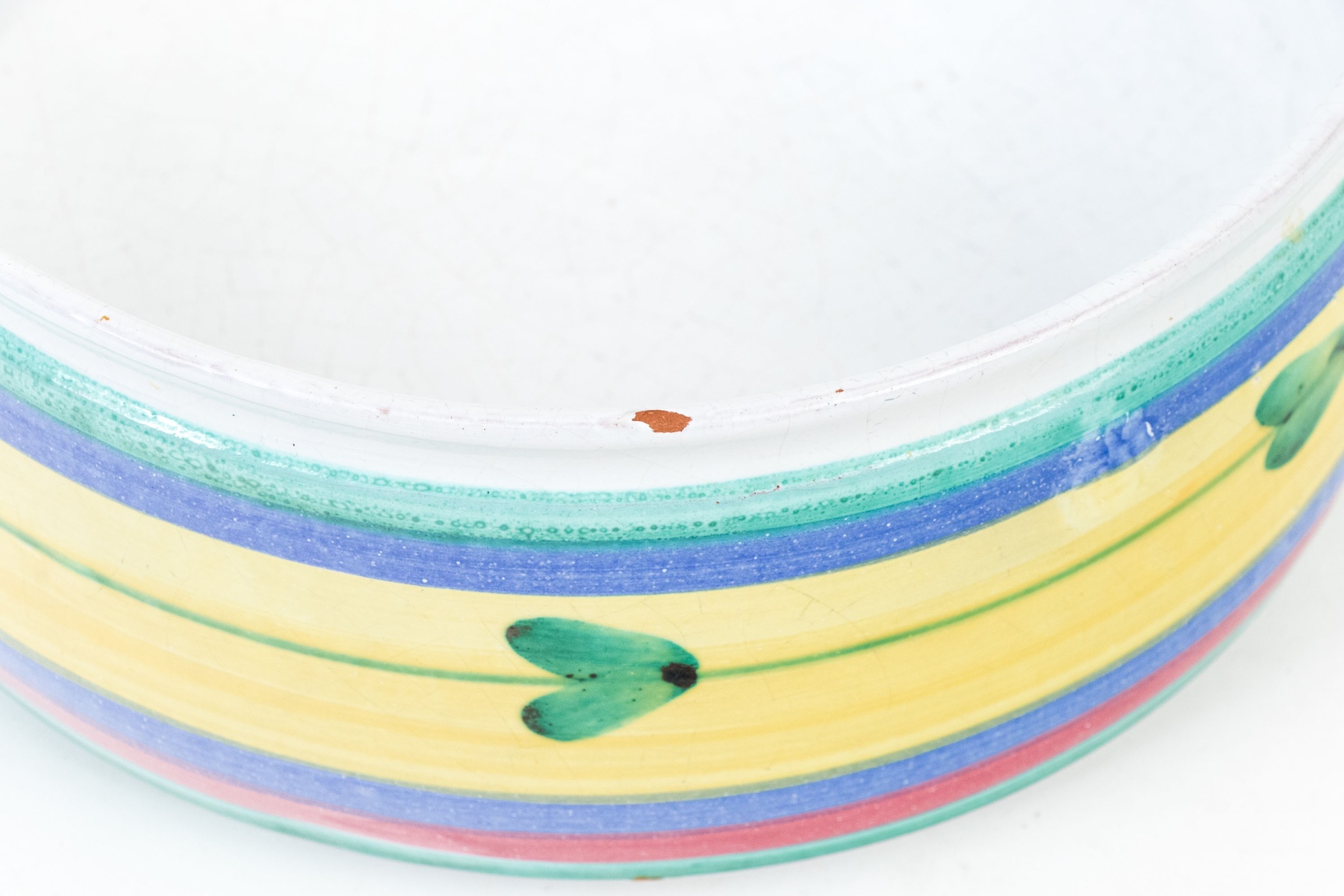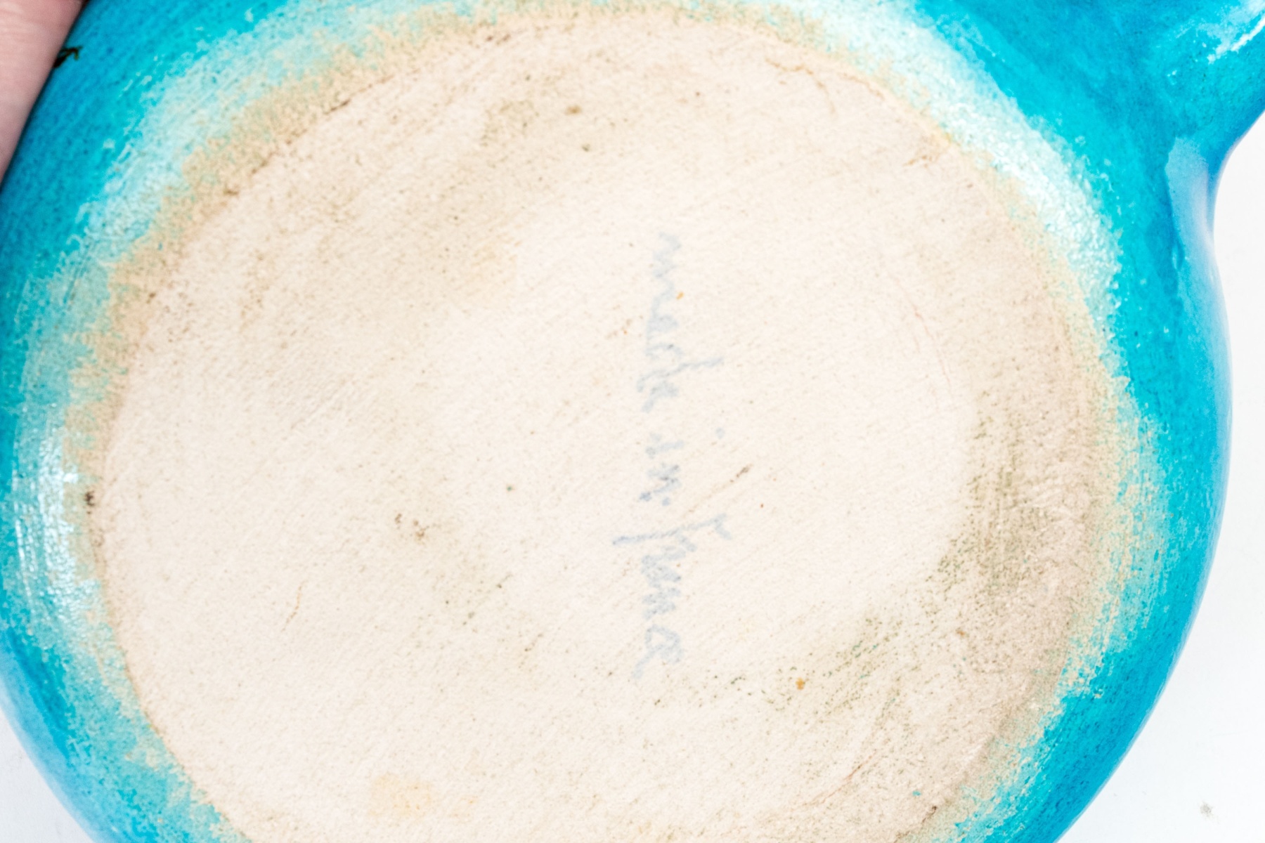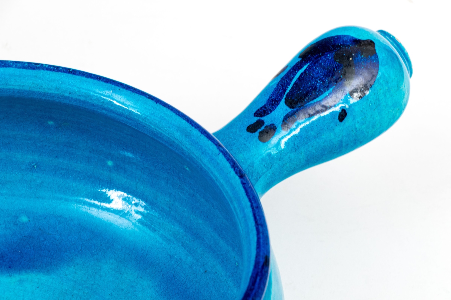 A lovely duo of hand-decorated ceramics including a Caleca lidded casserole in yellow, blue, green, and pink with a wreath of leaves around the center and a single white handle. Accompanied by a French blue glazed soup bowl with a small spout and a single handle to the side, decorated with pretty floral sprays at the center and on the handle. Both marked underfoot.