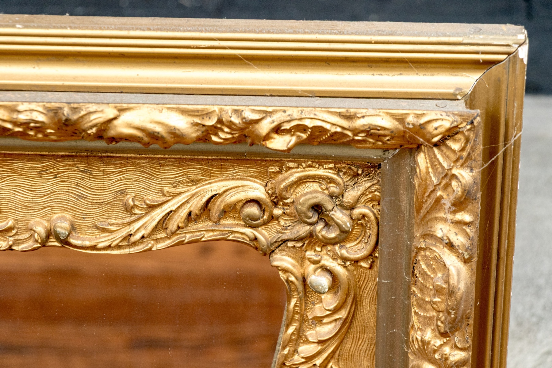 A gorgeous rectangular mirror in a gilt frame exuding classic French Baroque decadence with carved gesso rocaille, lattices, and foliate flourishes adding great visual interest and elegant depth.