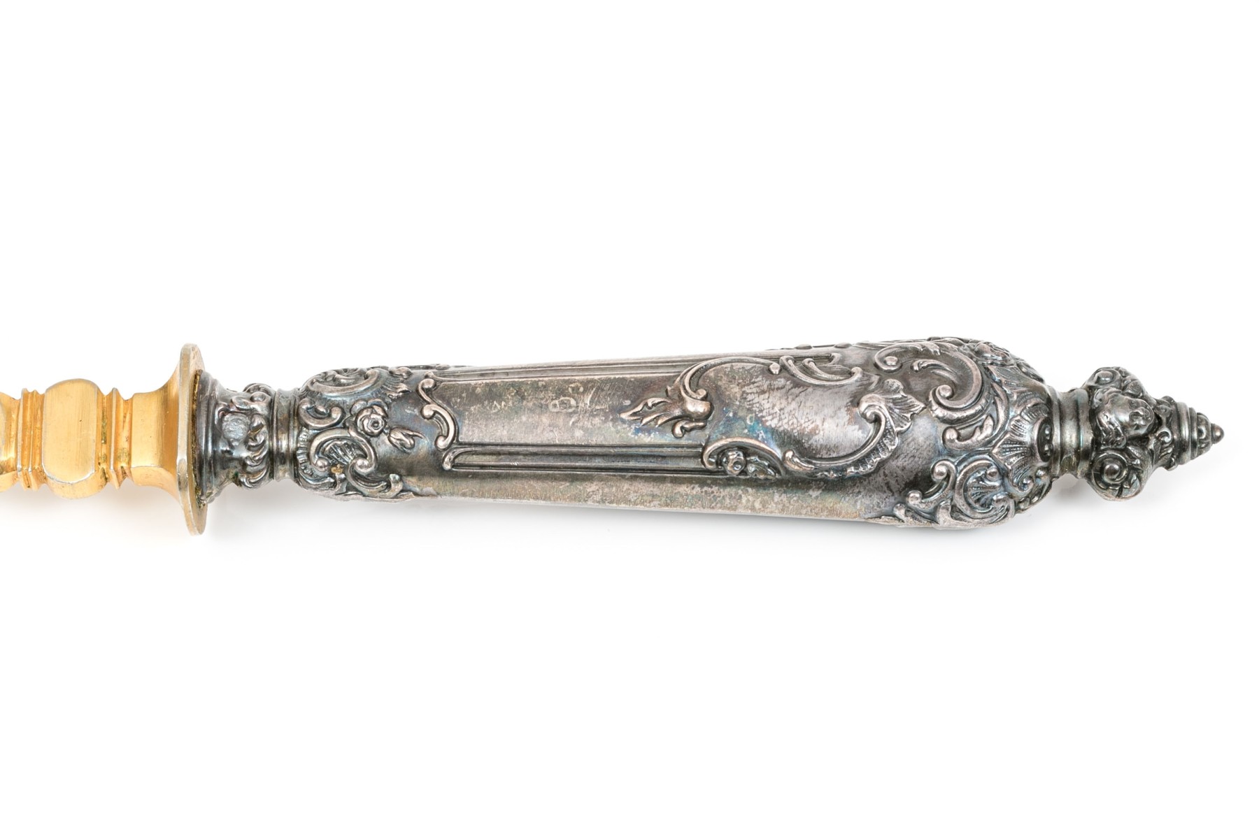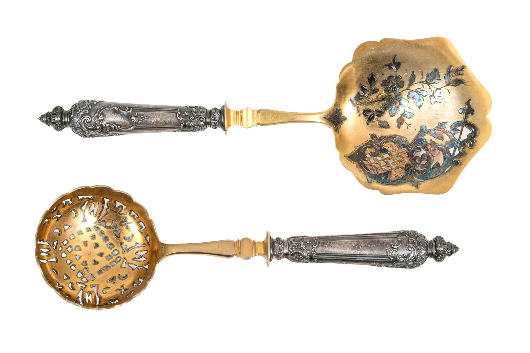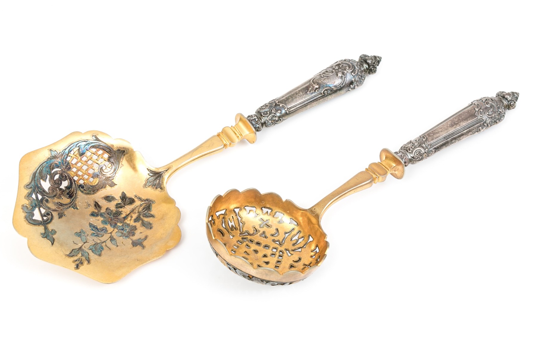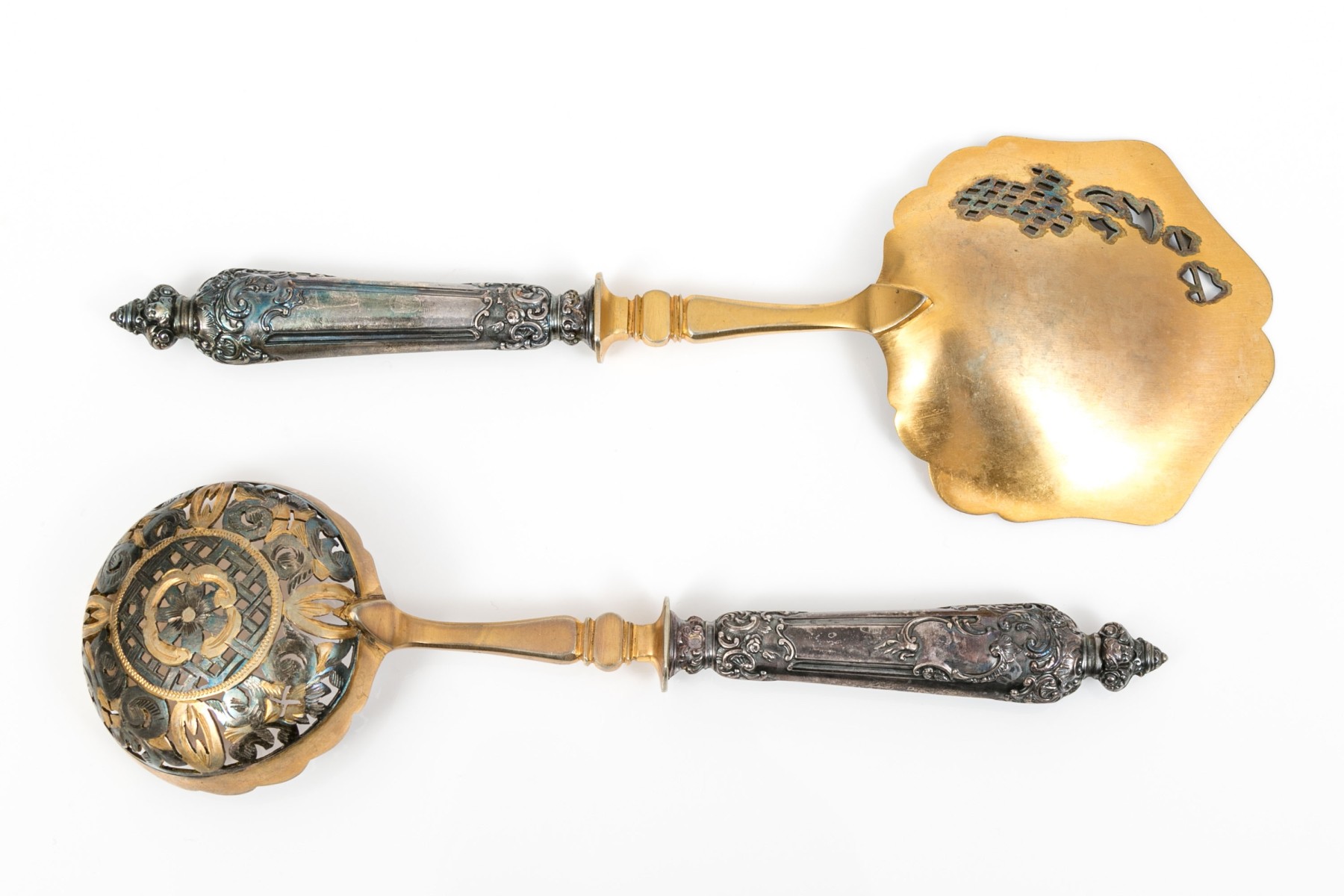 French beautiful pair of ornate vintage 800 silver handled pierced servers