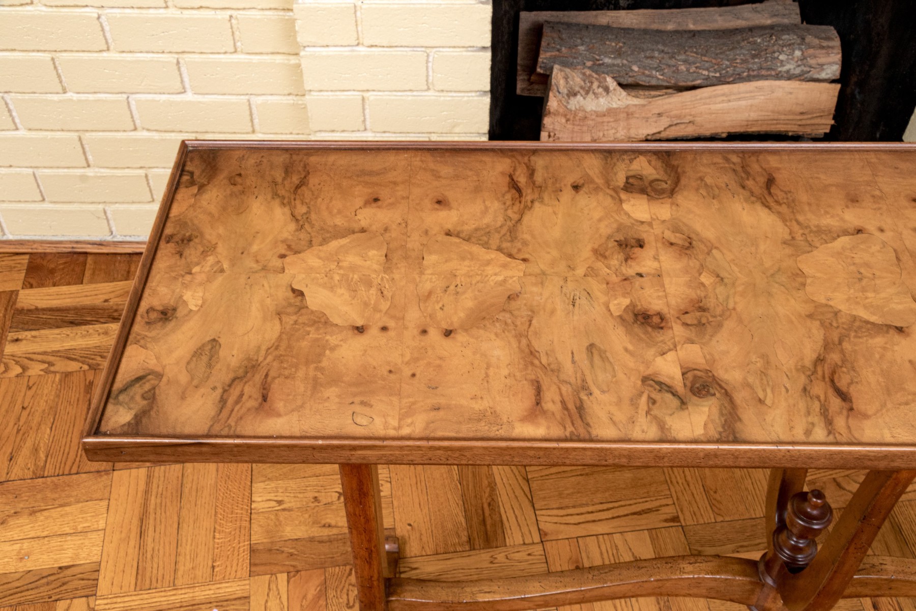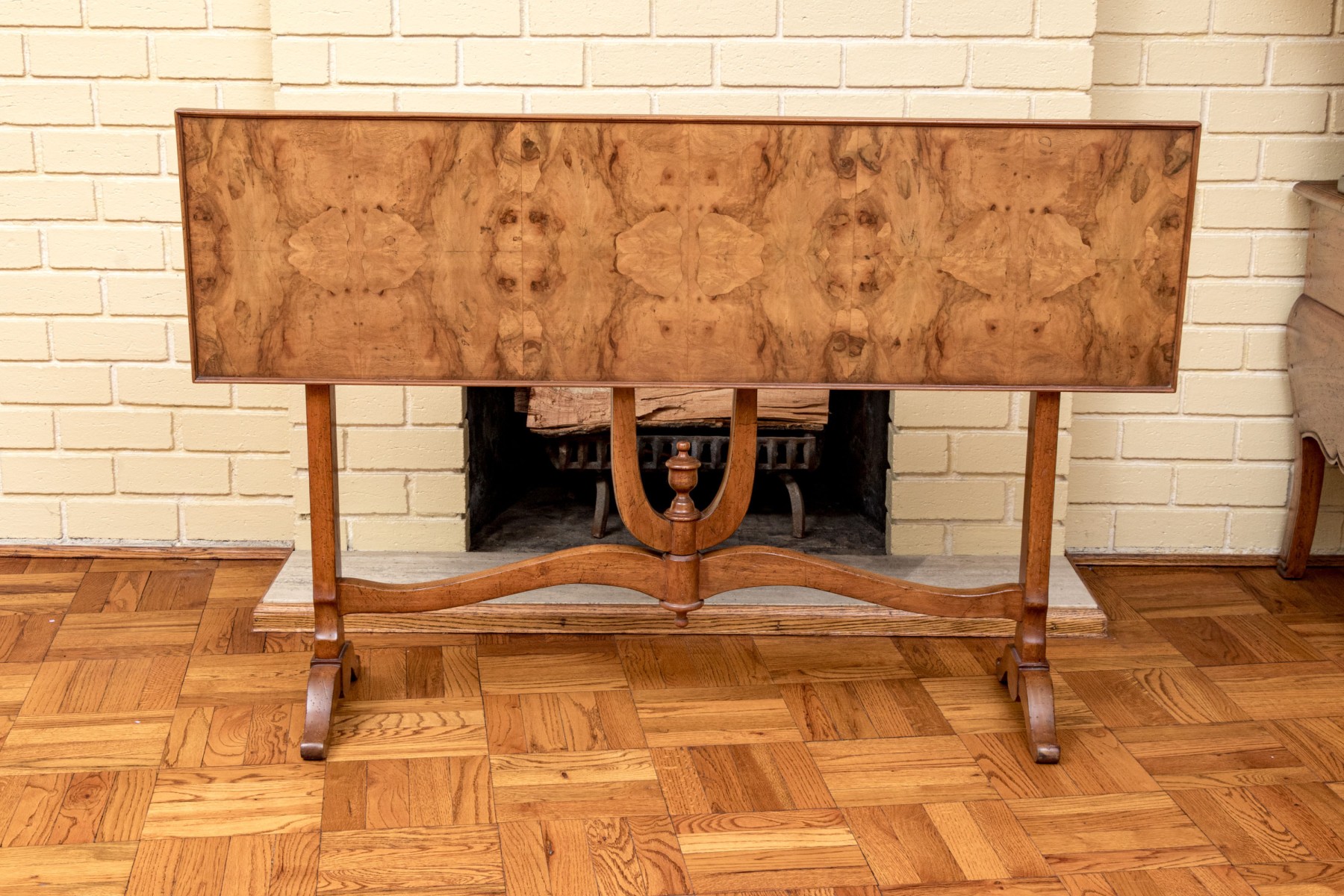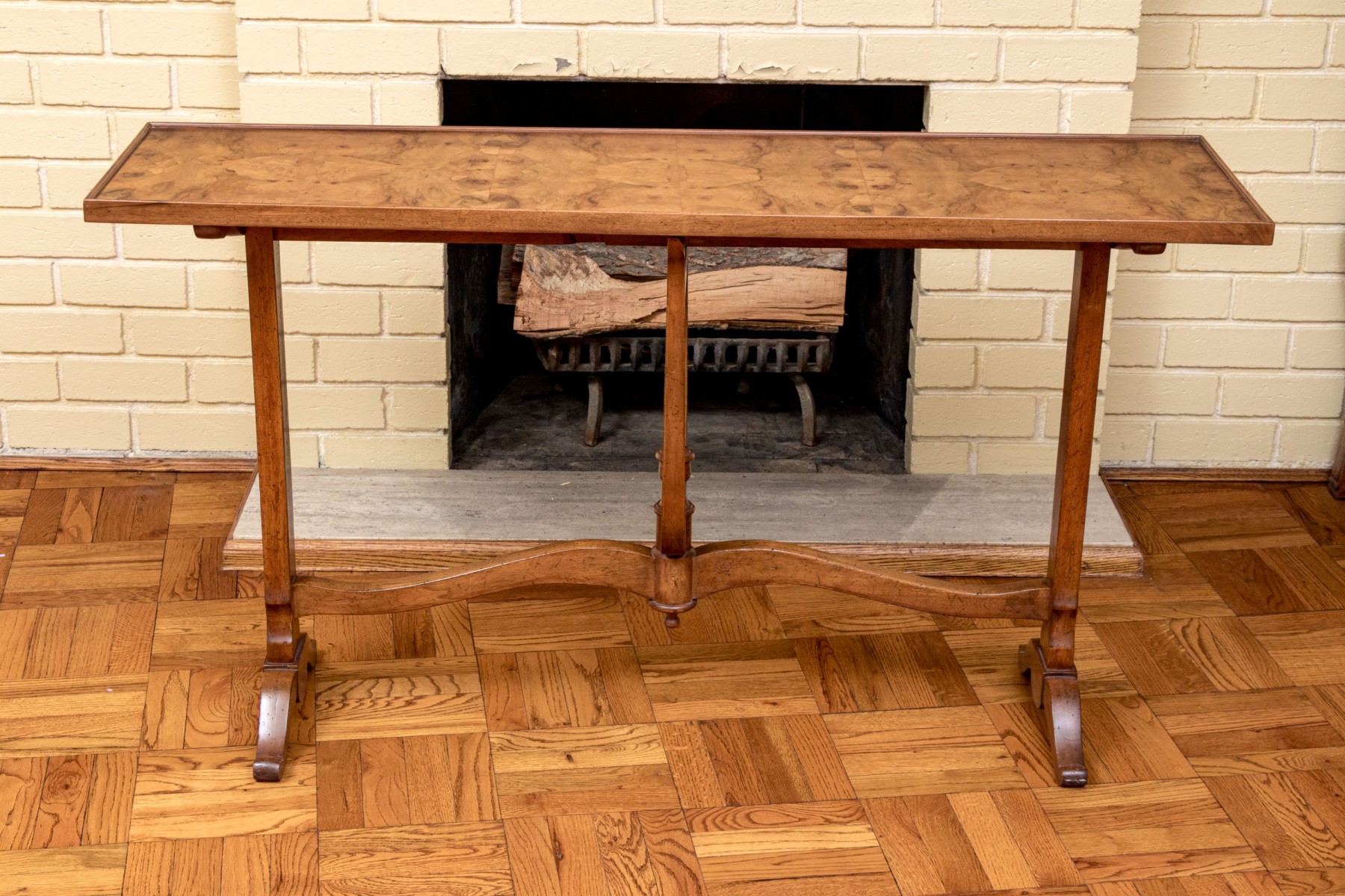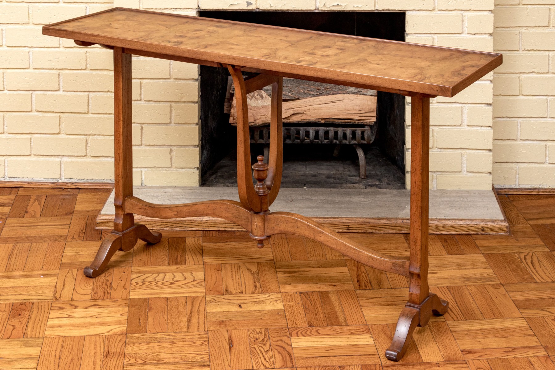 An excellent French console table displaying a light honeyed brown finish with a long, rectangular burlwood tilt-top over a trestle support with a rotating U-shaped support over an oval finial at the center of a serpentine stretcher.