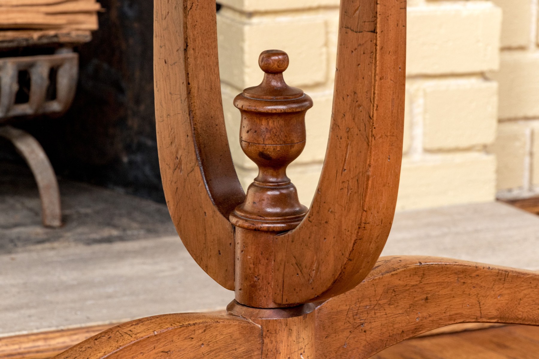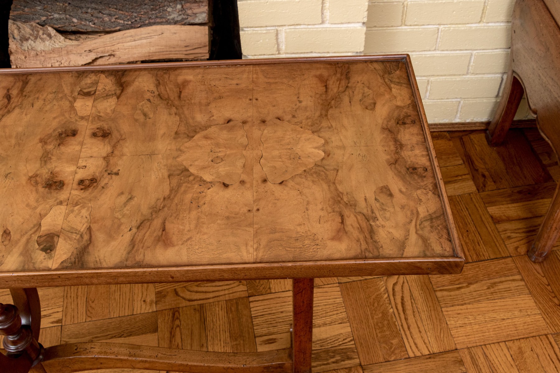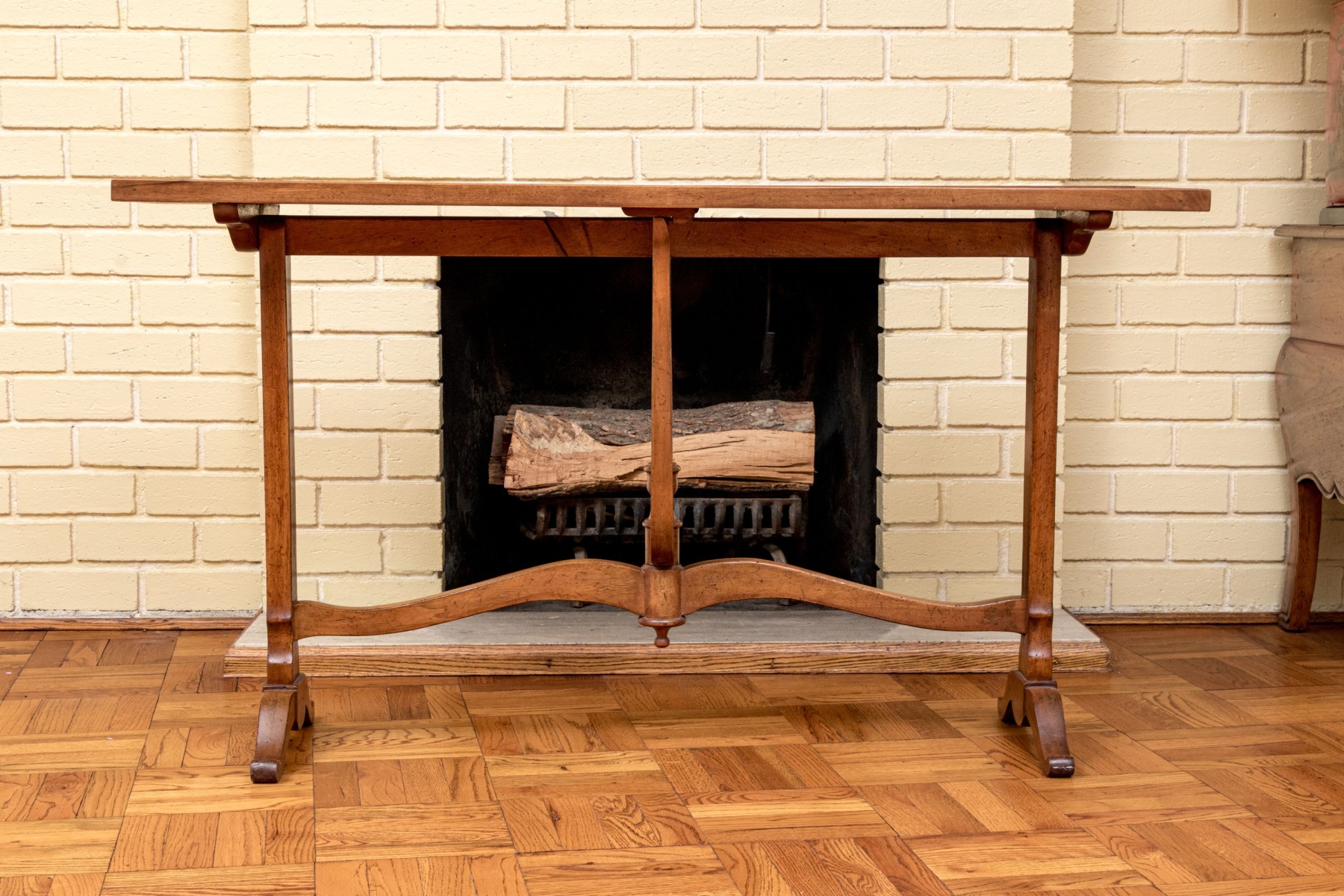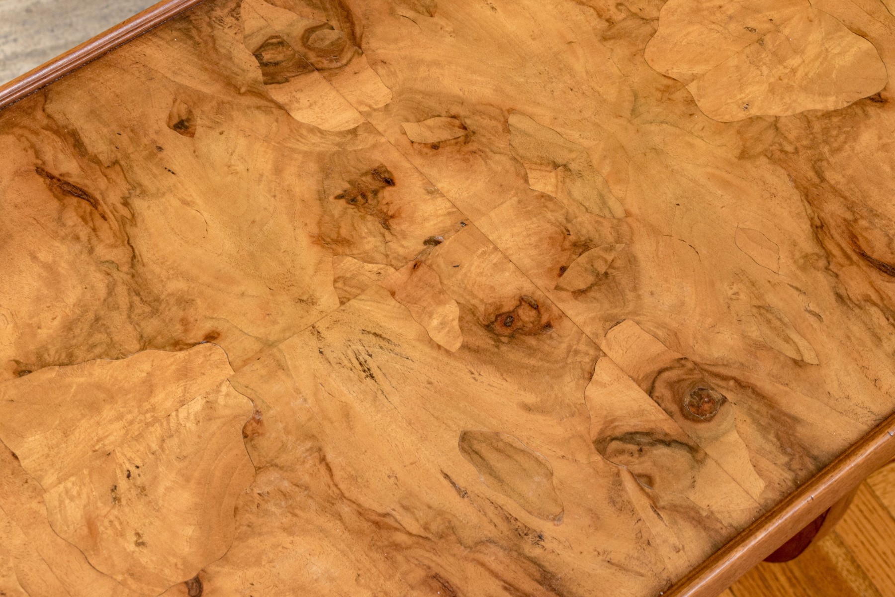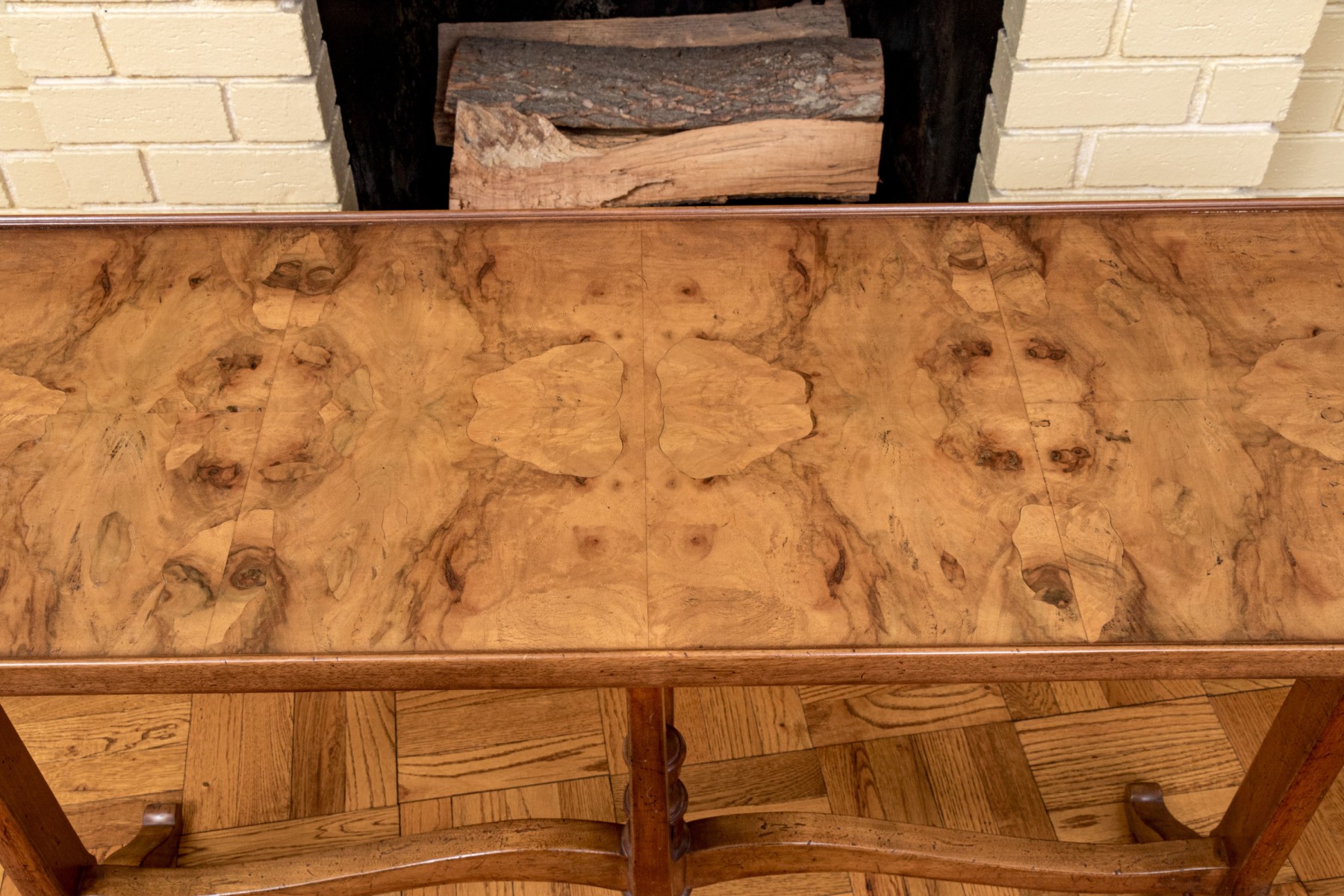 An excellent French console table displaying a light honeyed brown finish with a long, rectangular burlwood tilt-top over a trestle support with a rotating U-shaped support over an oval finial at the center of a serpentine stretcher.