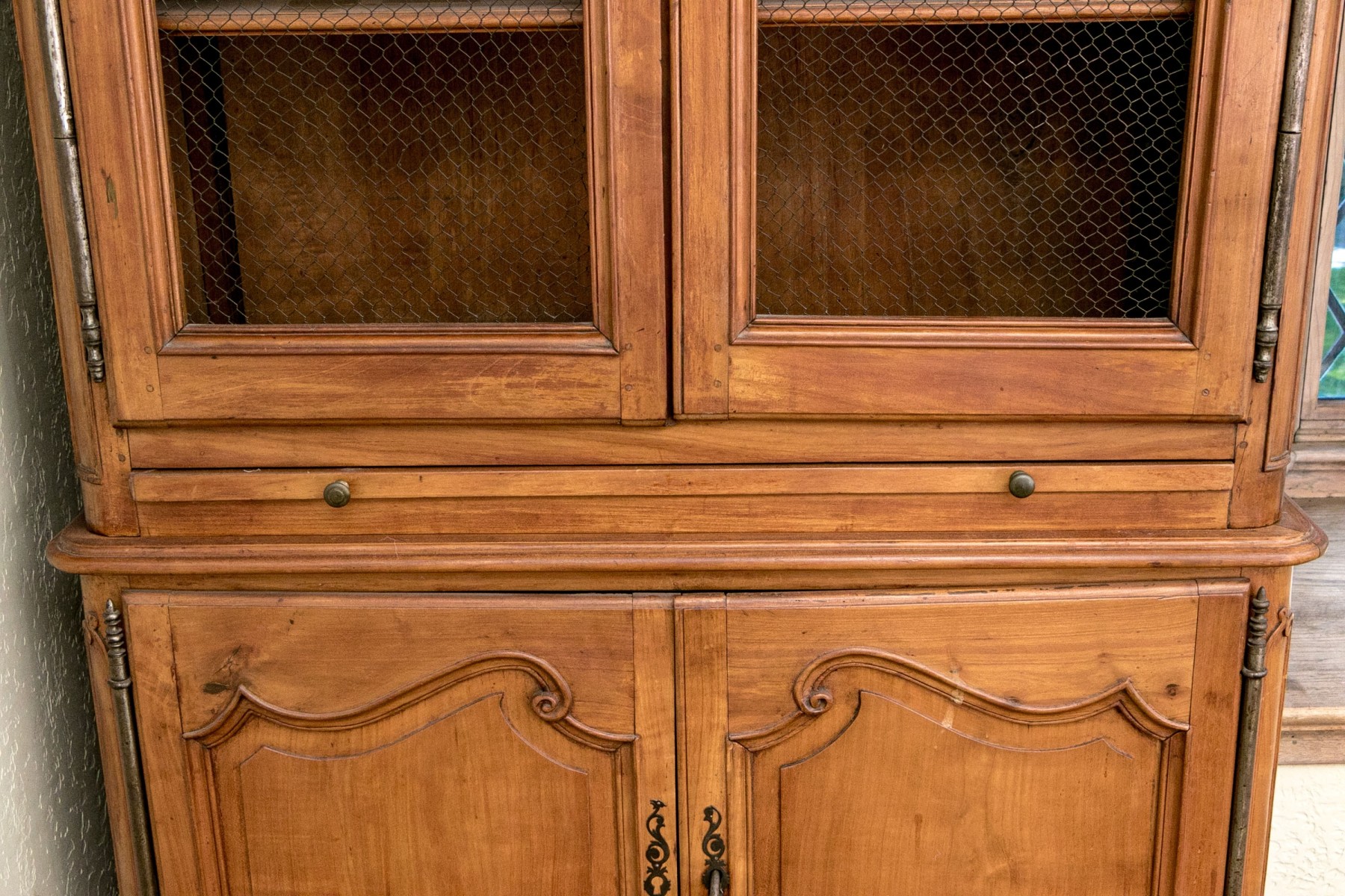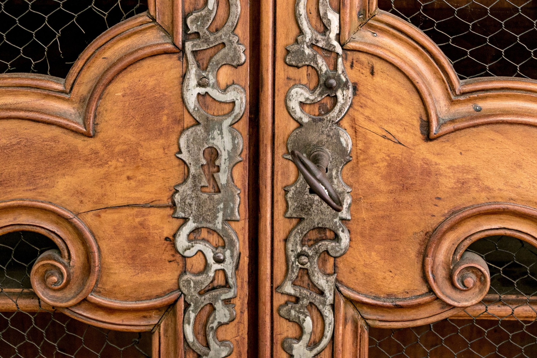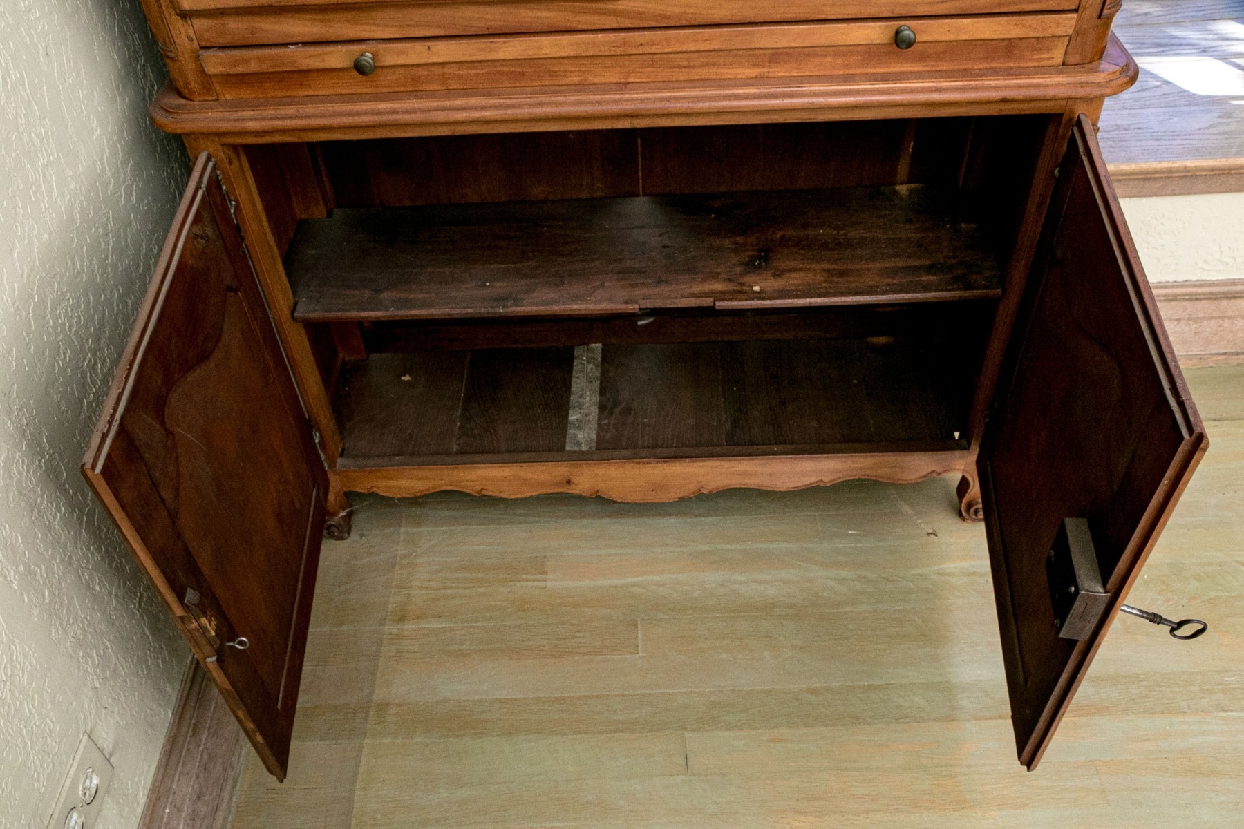 On short front scrolled legs, the case has a lower pair of doors opening to shelved interior with brass lock with key. Above there is a slide writing shelf. Above which is a pair of hinged doors with brass escutcheon with key to lock. Doors with caged fronts to see the shelved interior.