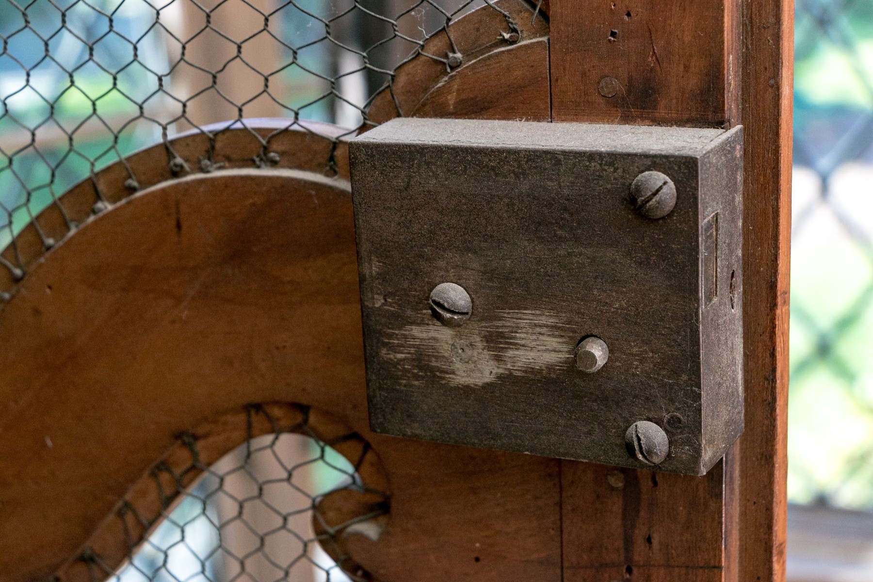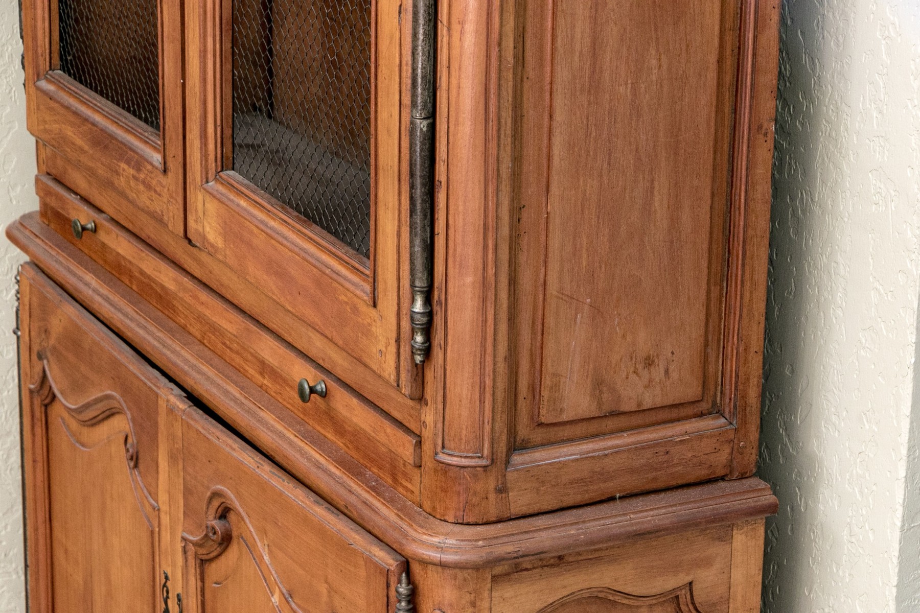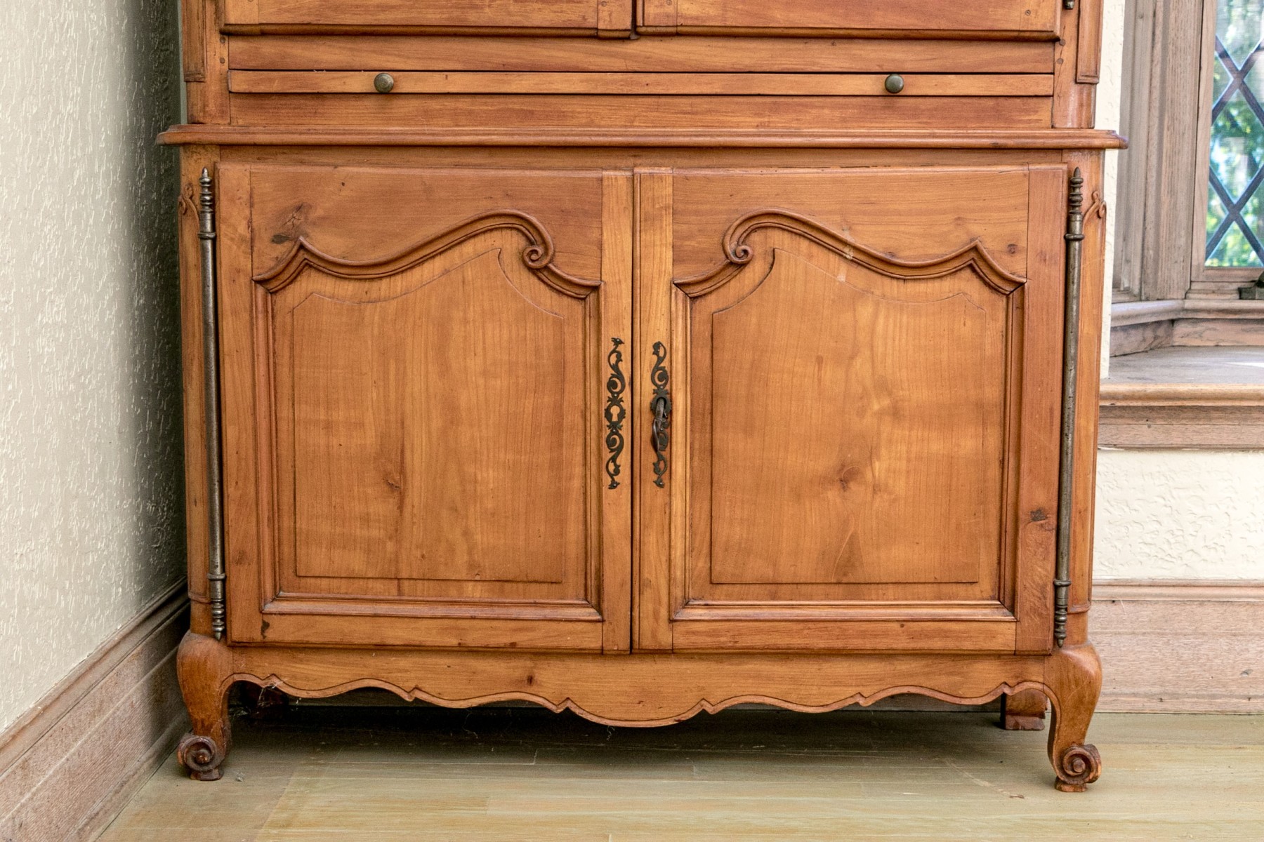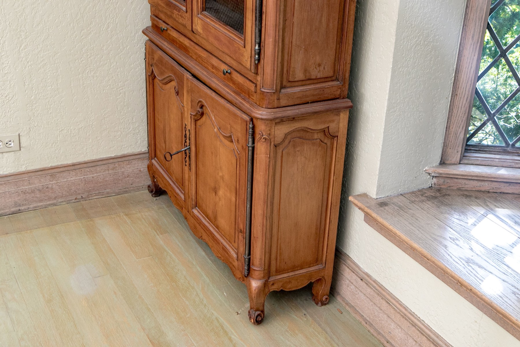 On short front scrolled legs, the case has a lower pair of doors opening to shelved interior with brass lock with key. Above there is a slide writing shelf. Above which is a pair of hinged doors with brass escutcheon with key to lock. Doors with caged fronts to see the shelved interior.