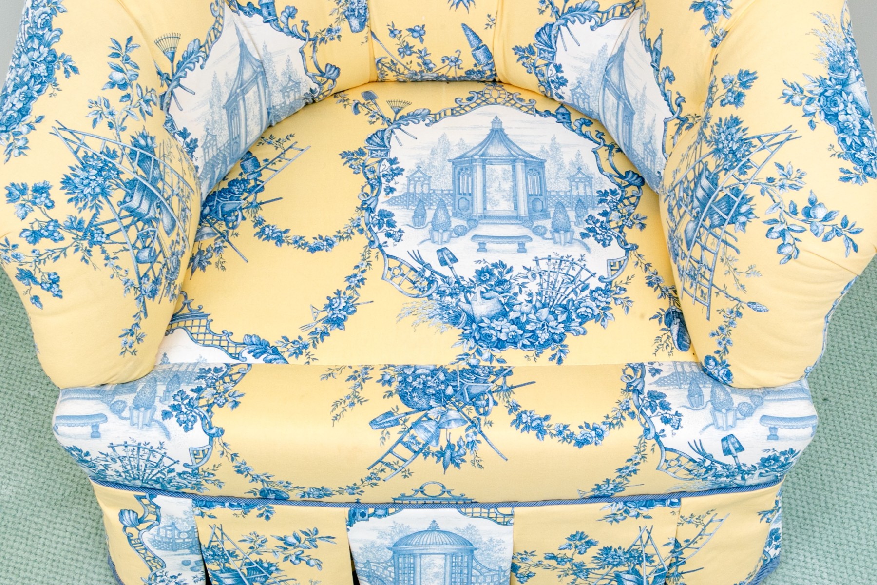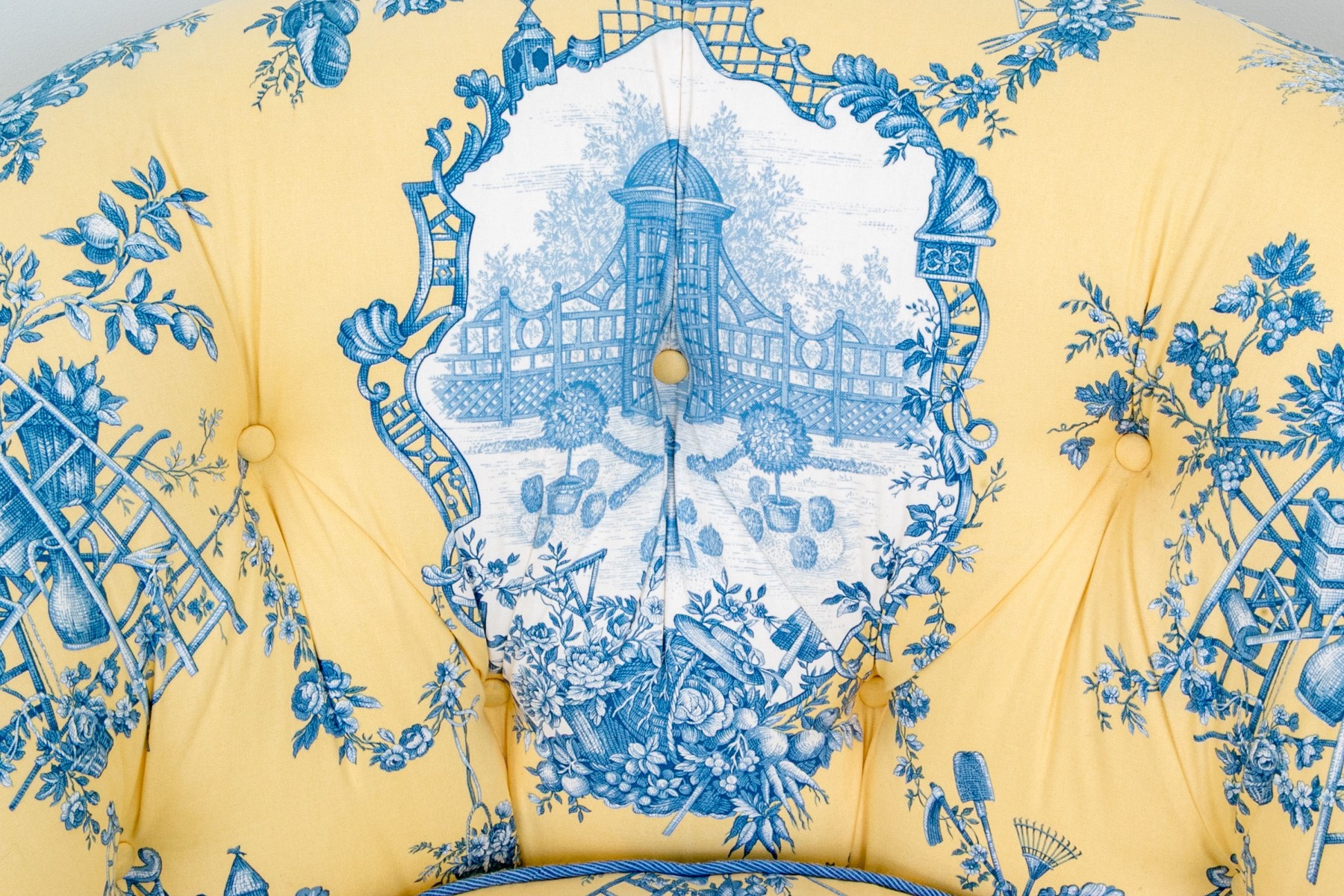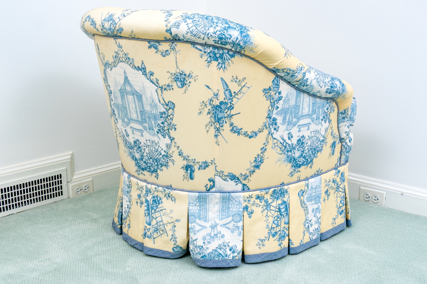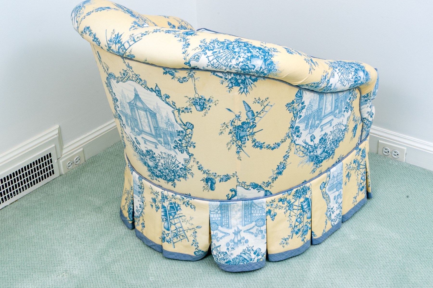 A delightful French country club chair featuring a barrel back design with sloped rolled arms, button tufted across the back and upholstered in eye-catching toile with blue and white neoclassical scenes against a cheerful yellow ground. Finished with piped trims and a pleated apron concealing the legs beneath.