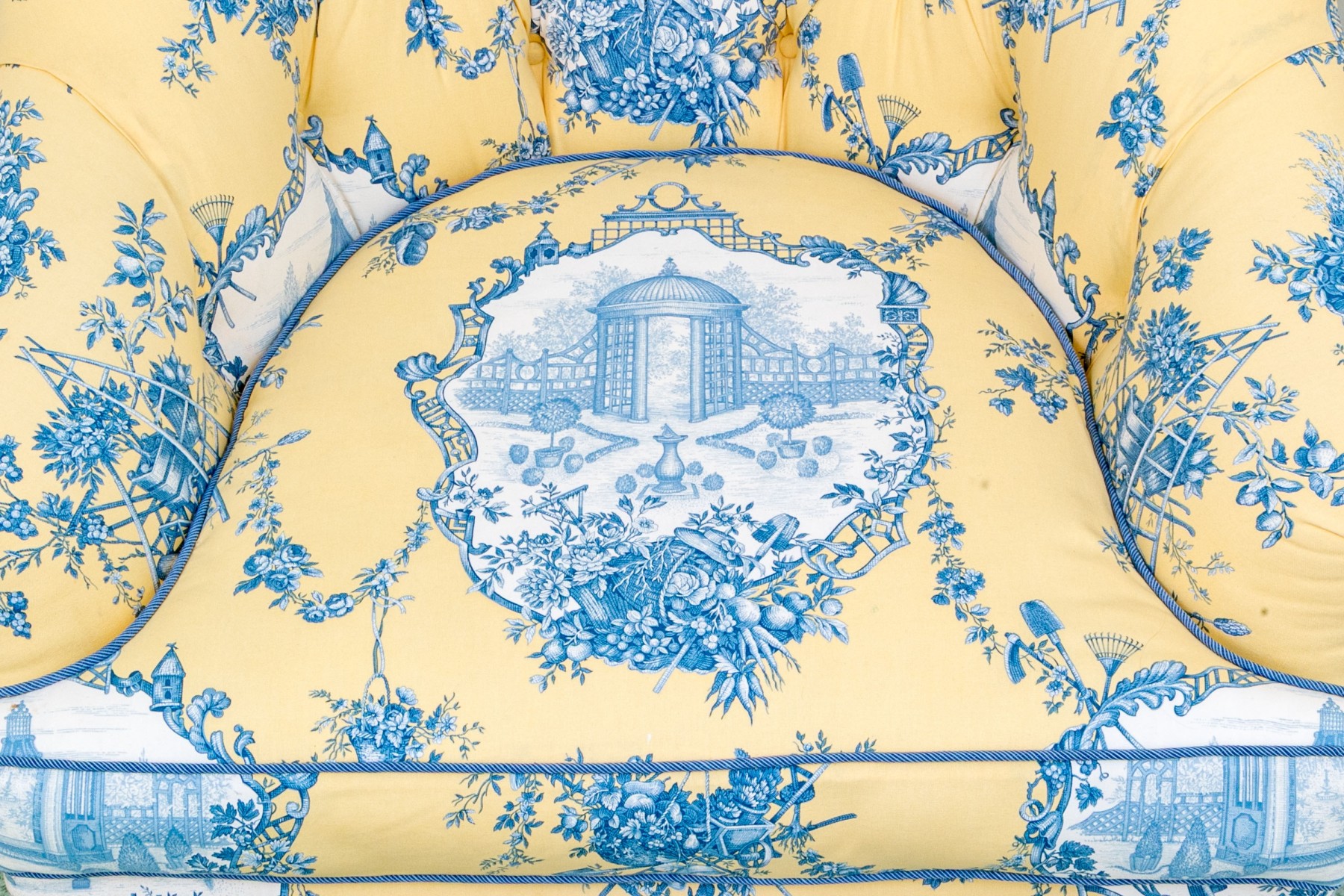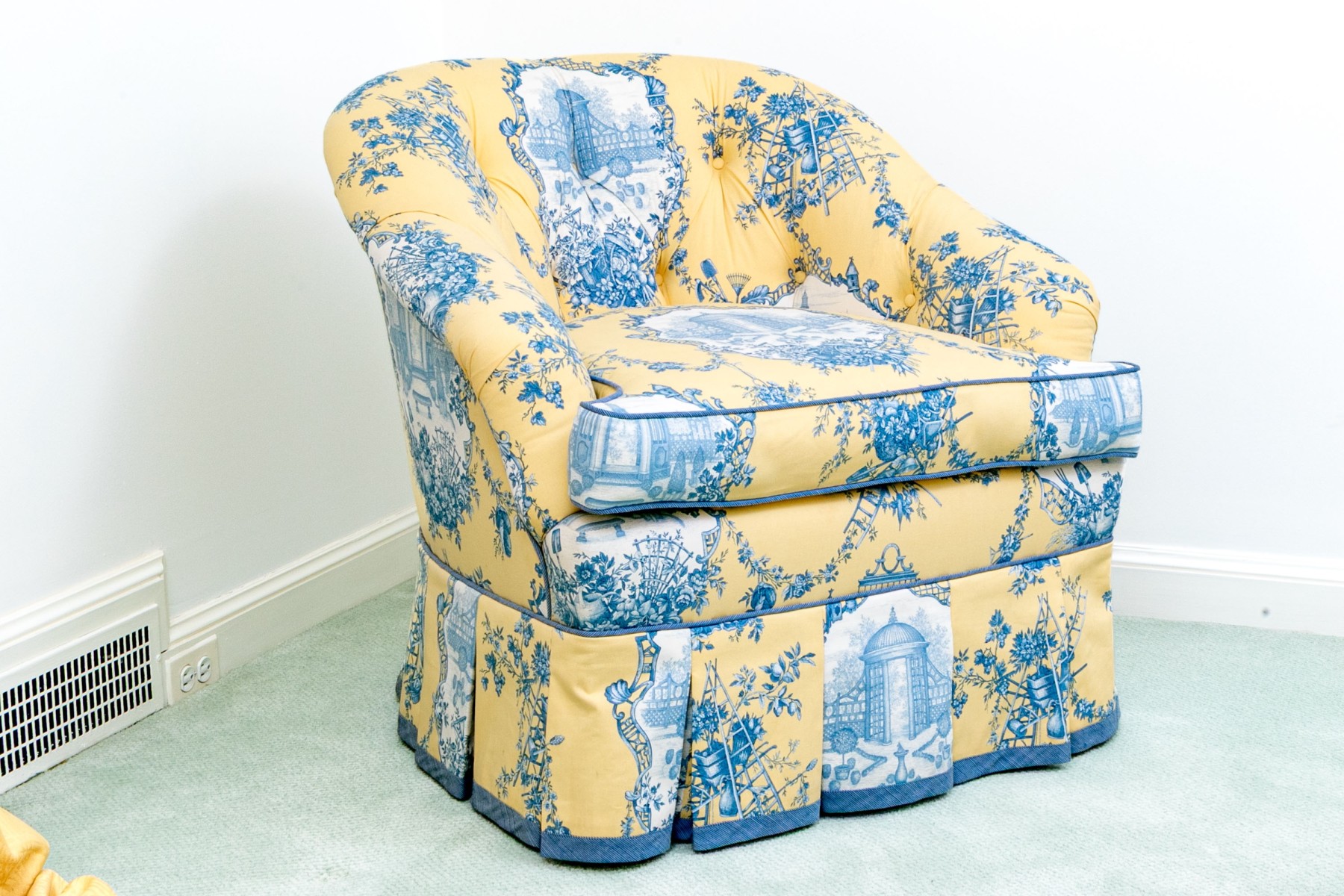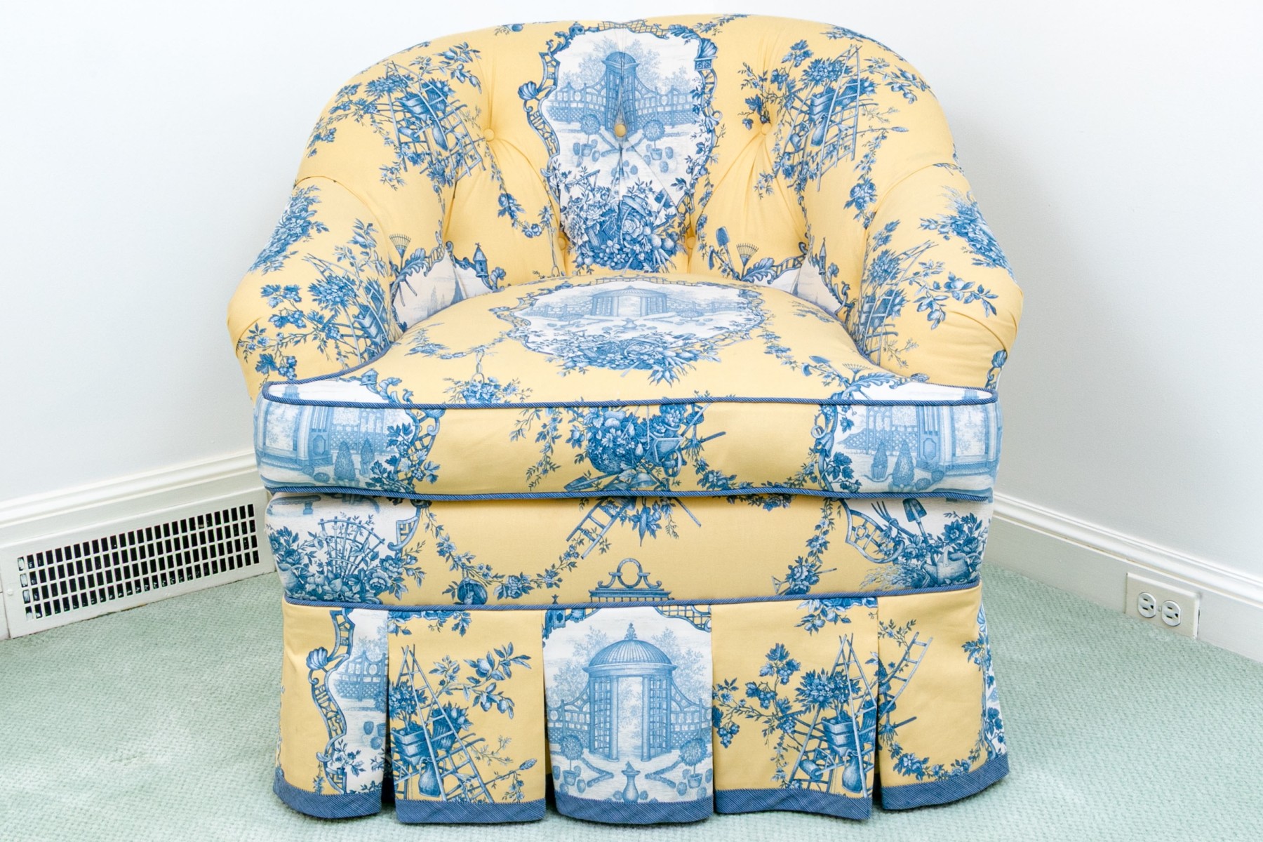A delightful French country club chair featuring a barrel back design with sloped rolled arms, button tufted across the back and upholstered in eye-catching toile with blue and white neoclassical scenes against a cheerful yellow ground. Finished with piped trims and a pleated apron concealing the legs beneath.