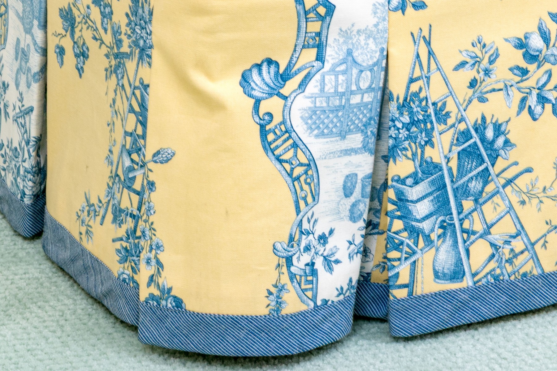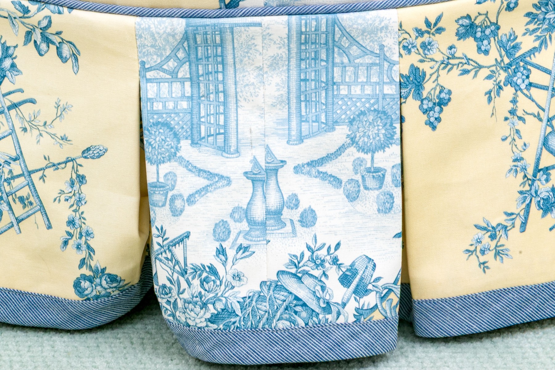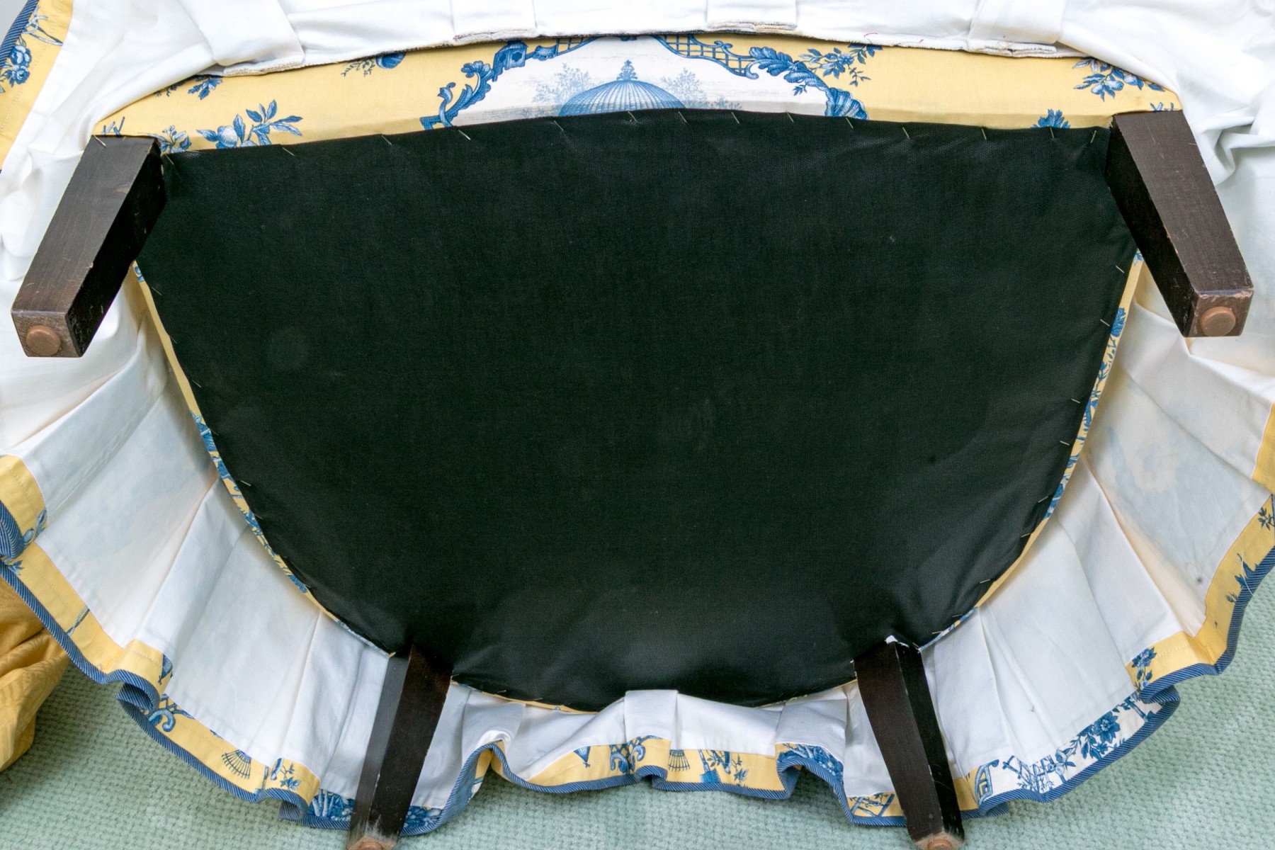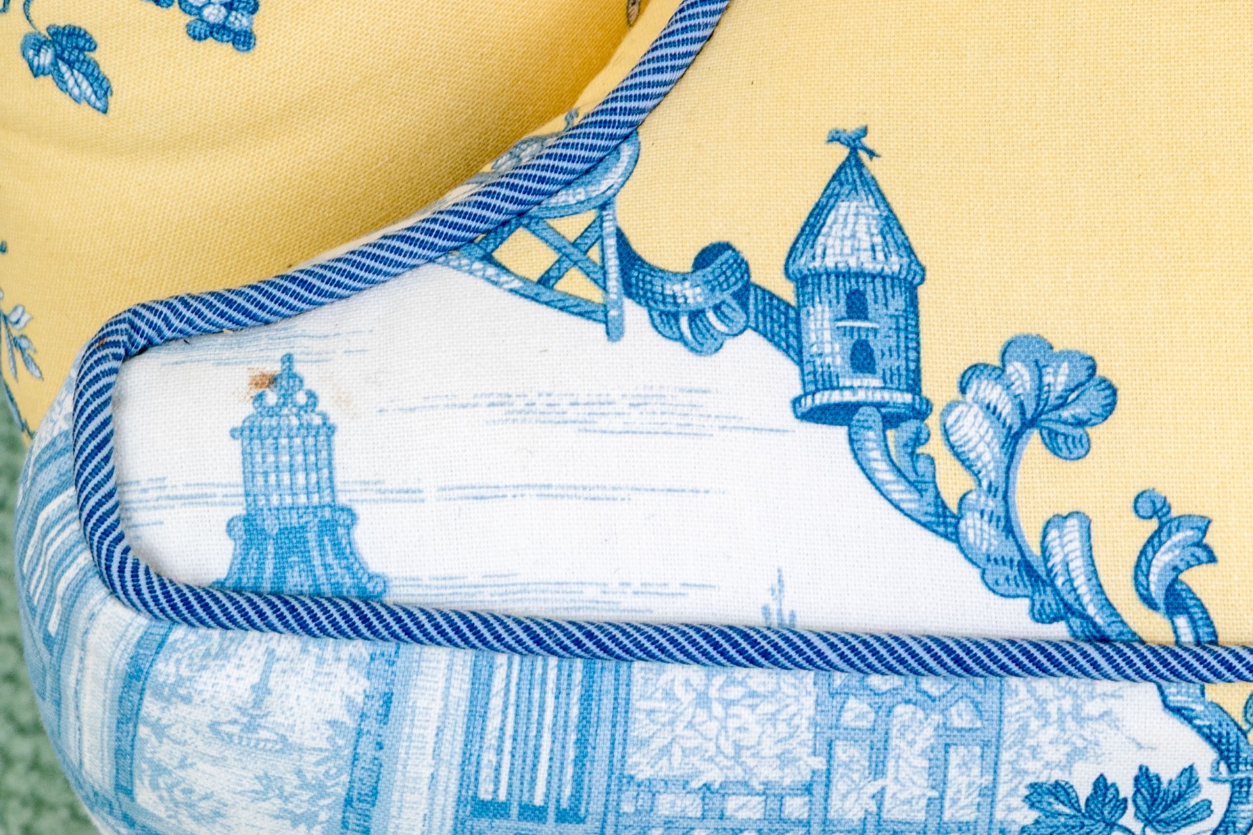 A delightful French country club chair featuring a barrel back design with sloped rolled arms, button tufted across the back and upholstered in eye-catching toile with blue and white neoclassical scenes against a cheerful yellow ground. Finished with piped trims and a pleated apron concealing the legs beneath.