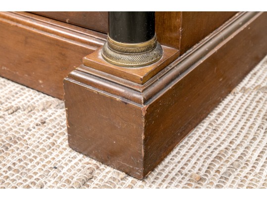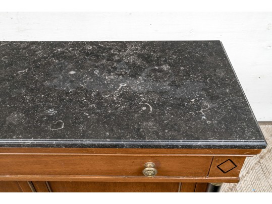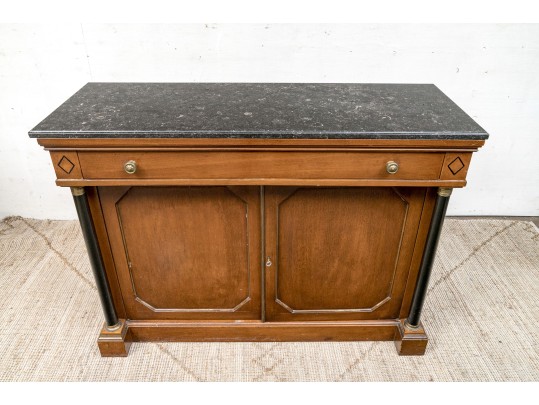 A classic Empire style credenza with a frieze drawer with fine rosette knob pulls and felt lined compartments. The double door cabinet with recessed panels and opening to two shelves, with a key. The supports with ebonized diamond inlays over ebonized columns with gilt chased capitals and bases. With a black marble top and raised on a carved projecting base.