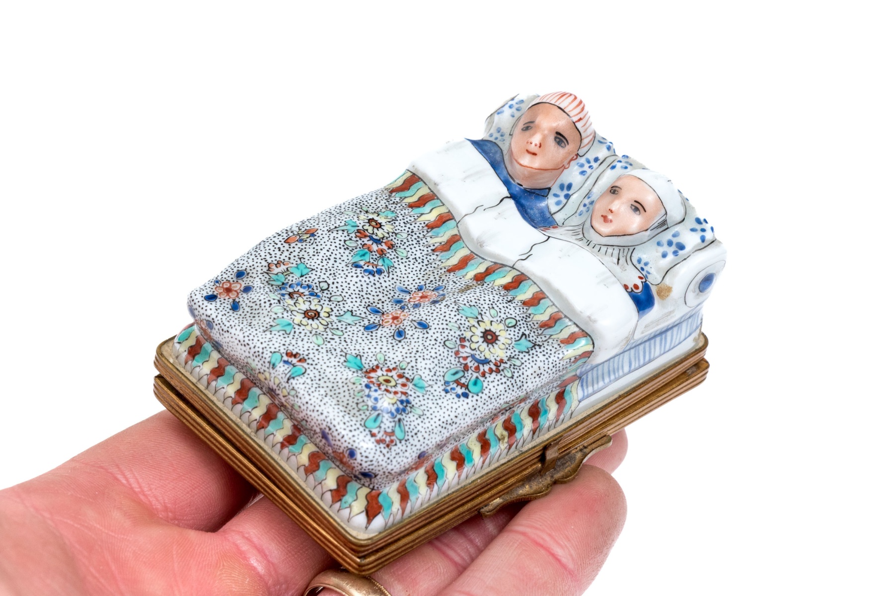 In the form of a man and woman in bed under the covers. Brass mounts and marked France inside.