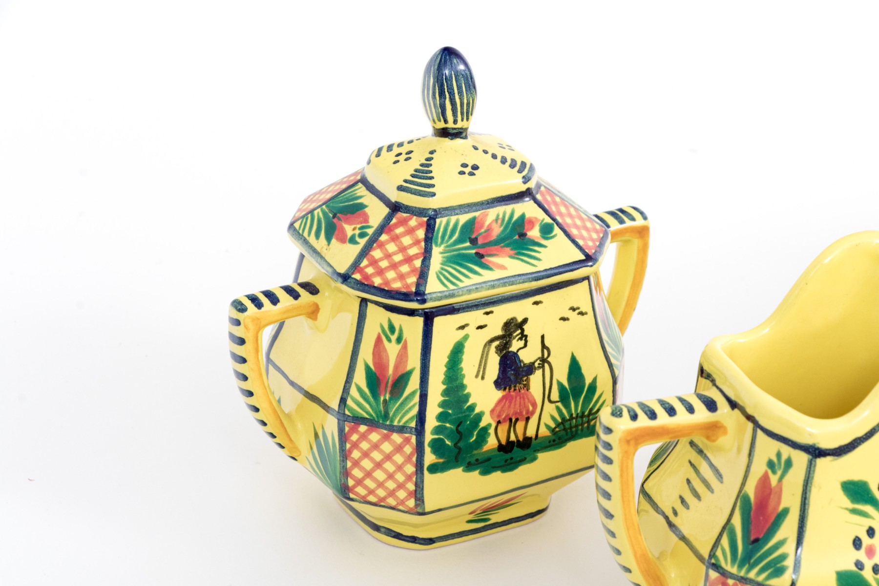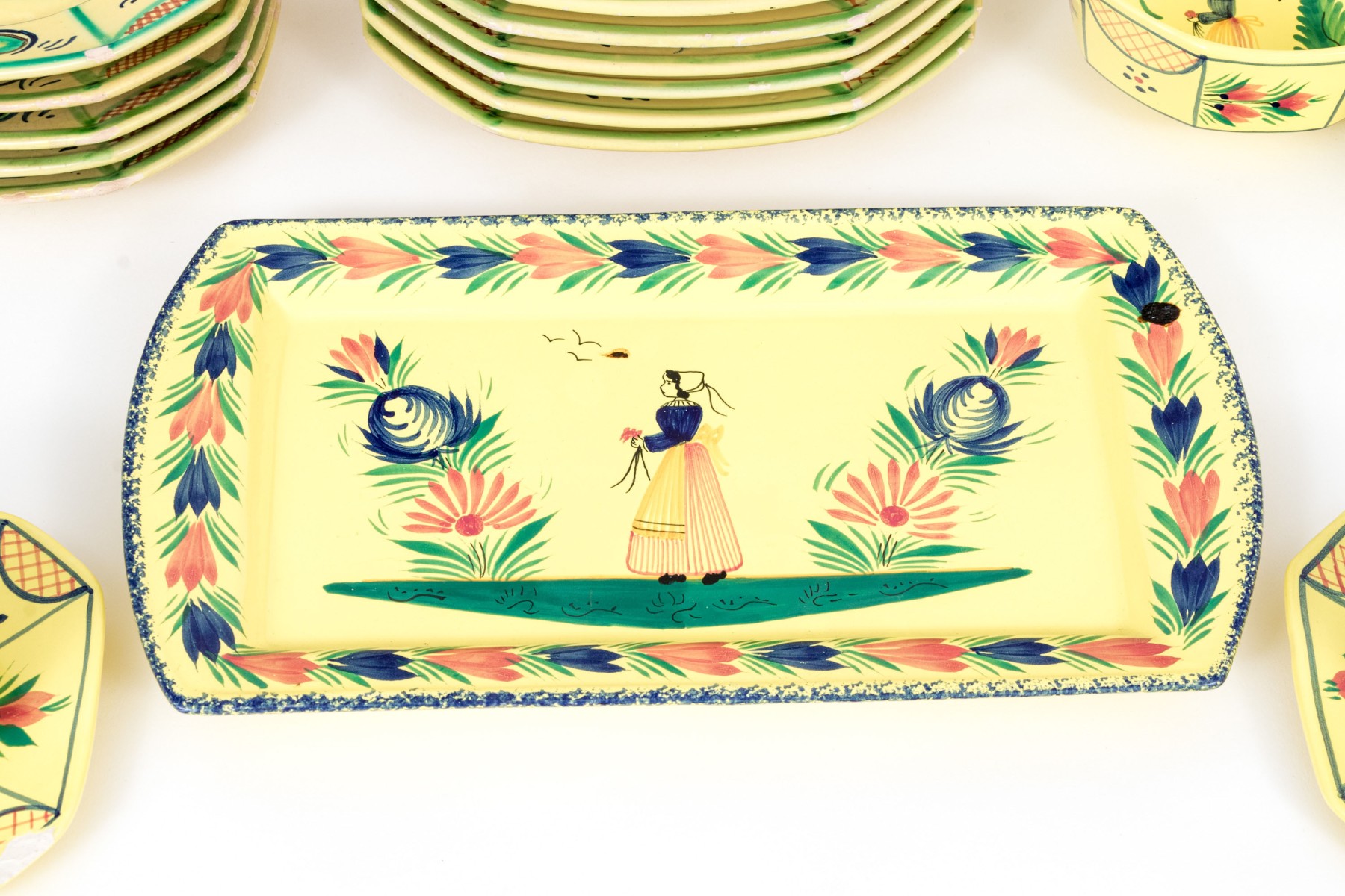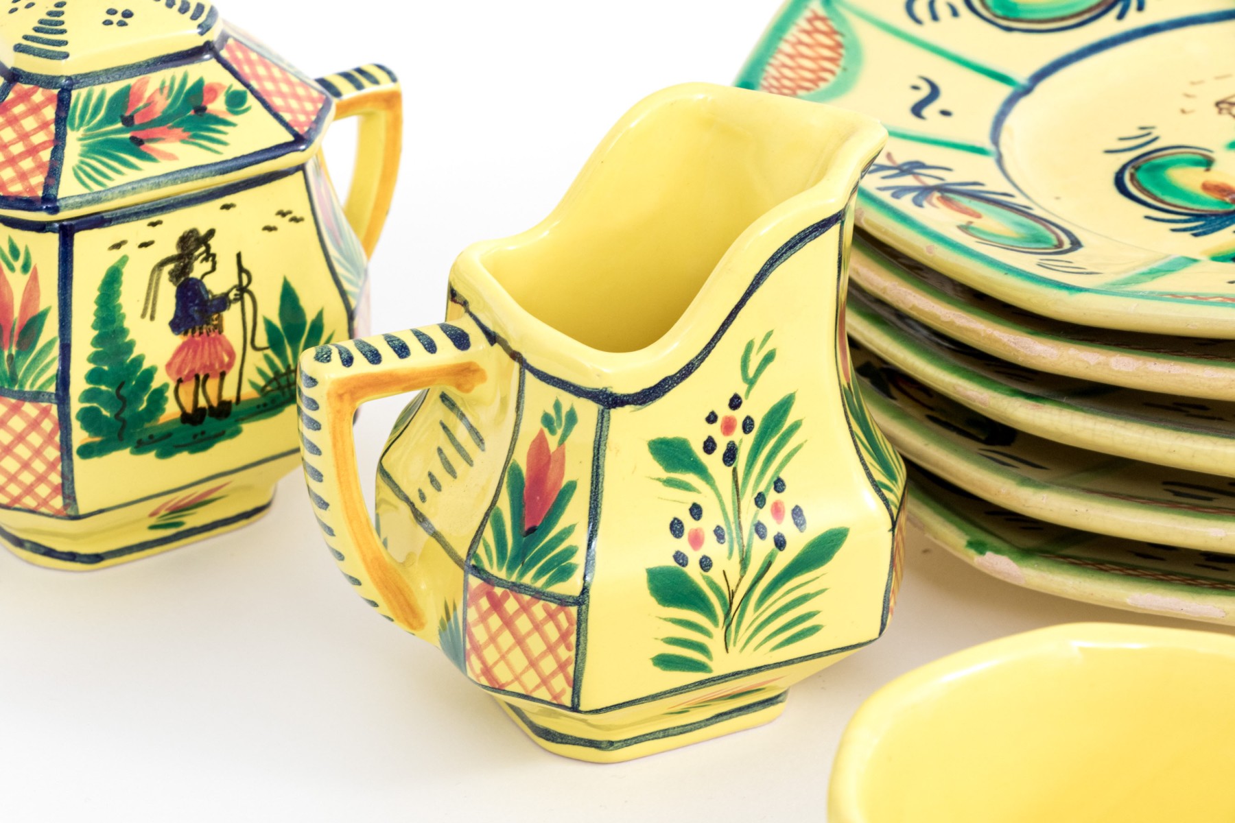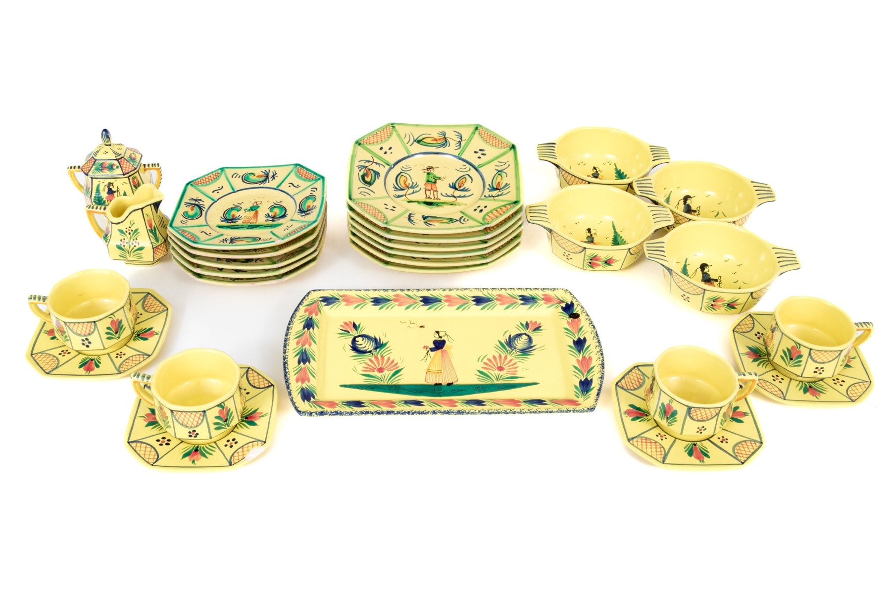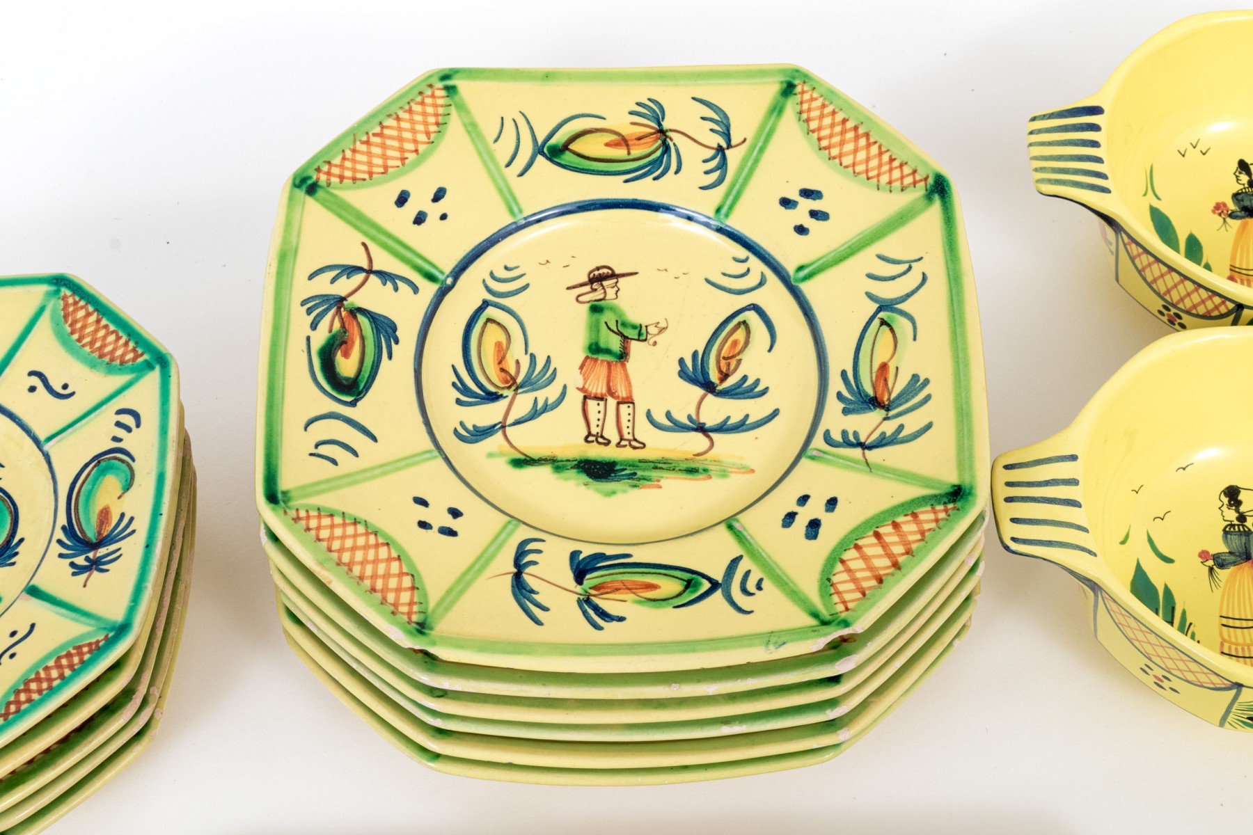 Each with yellow ground and classic Quimper figural and foliate embellishment.