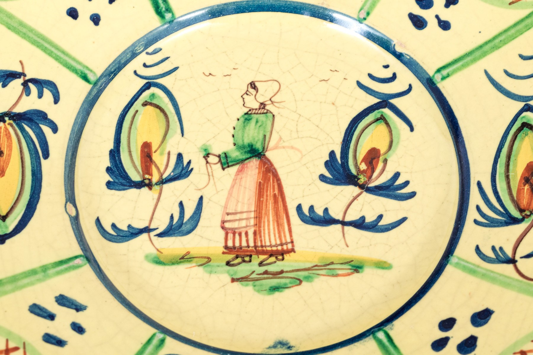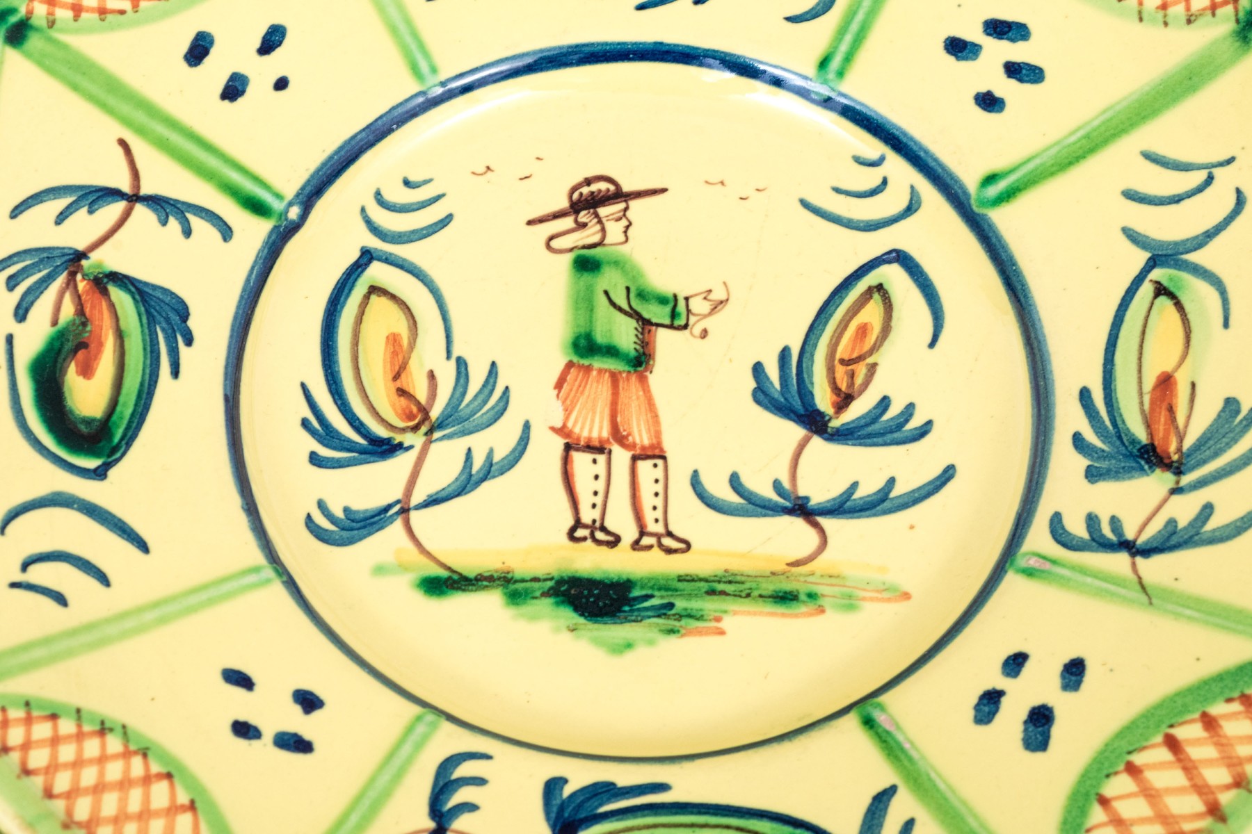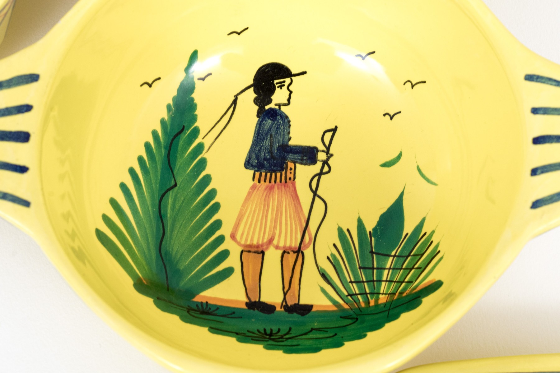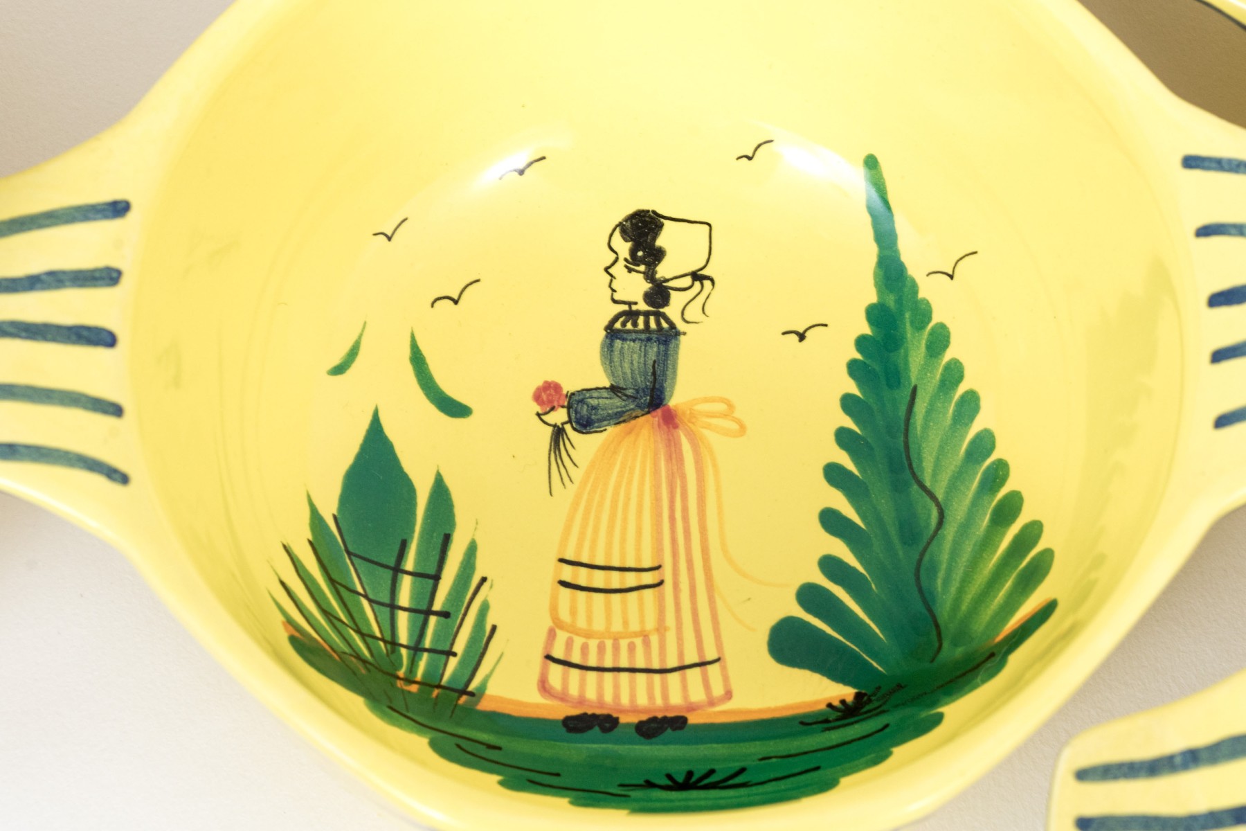 Each with yellow ground and classic Quimper figural and foliate embellishment.