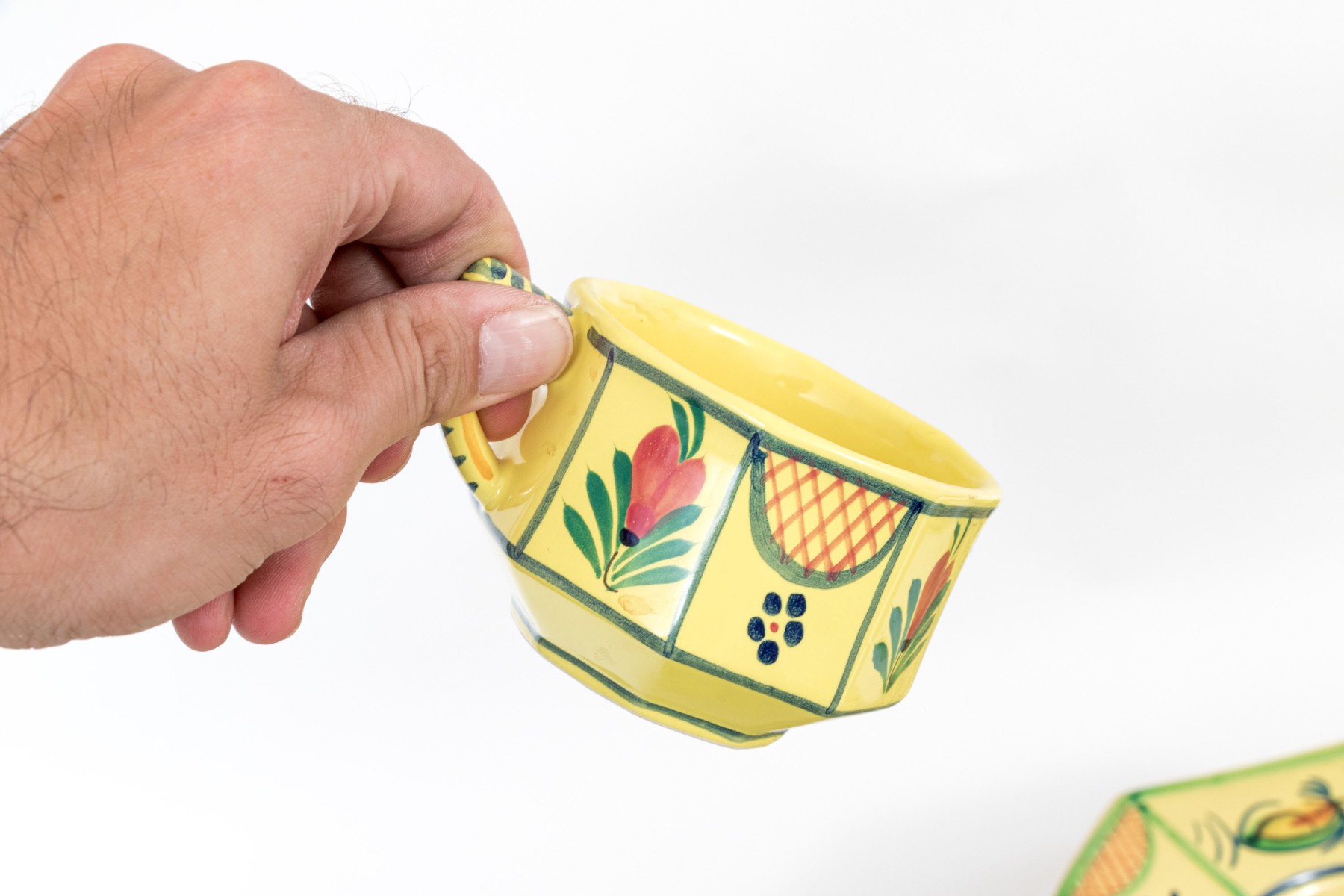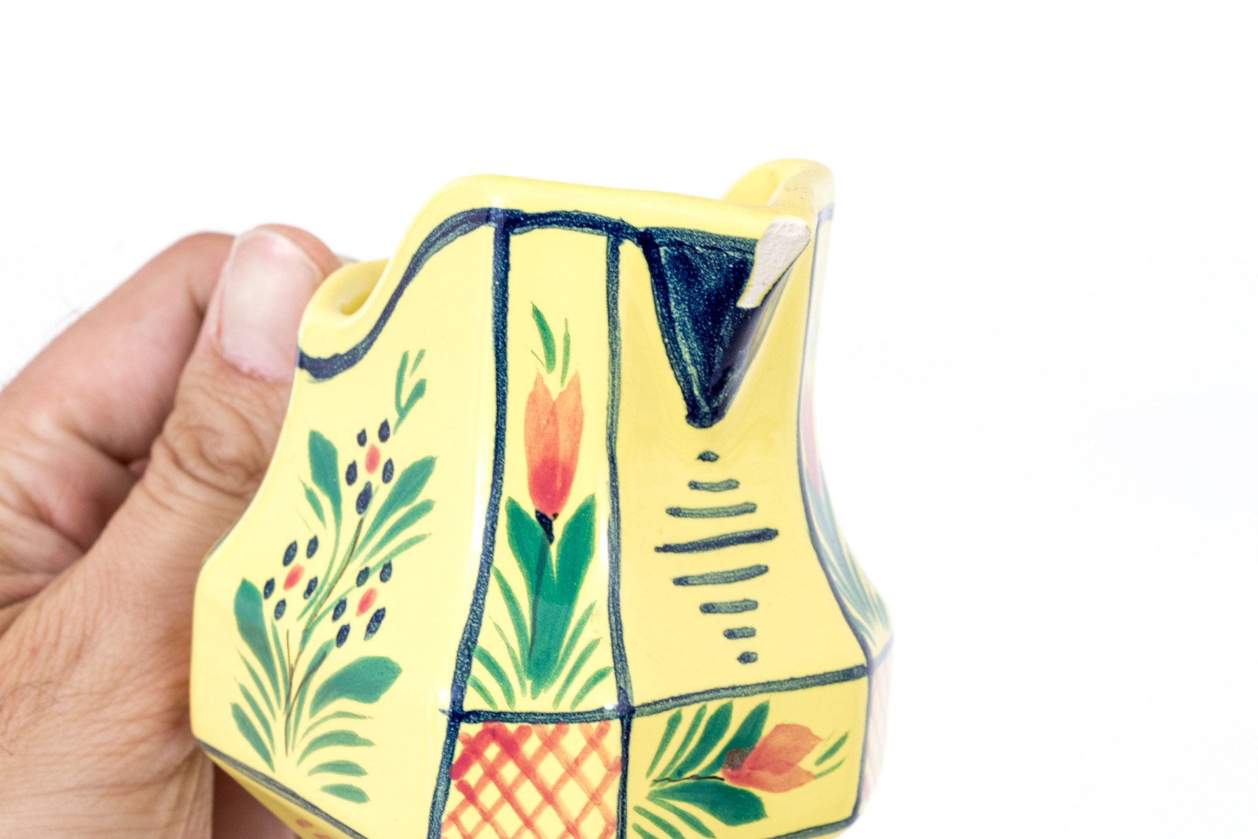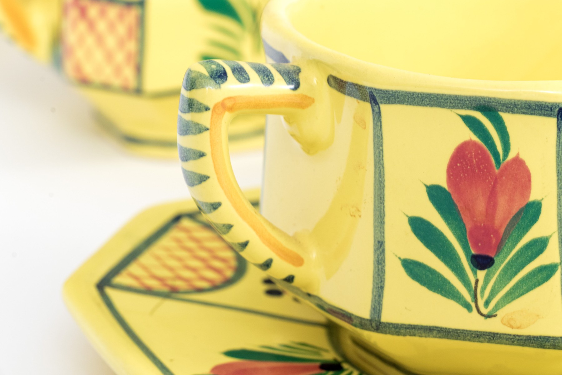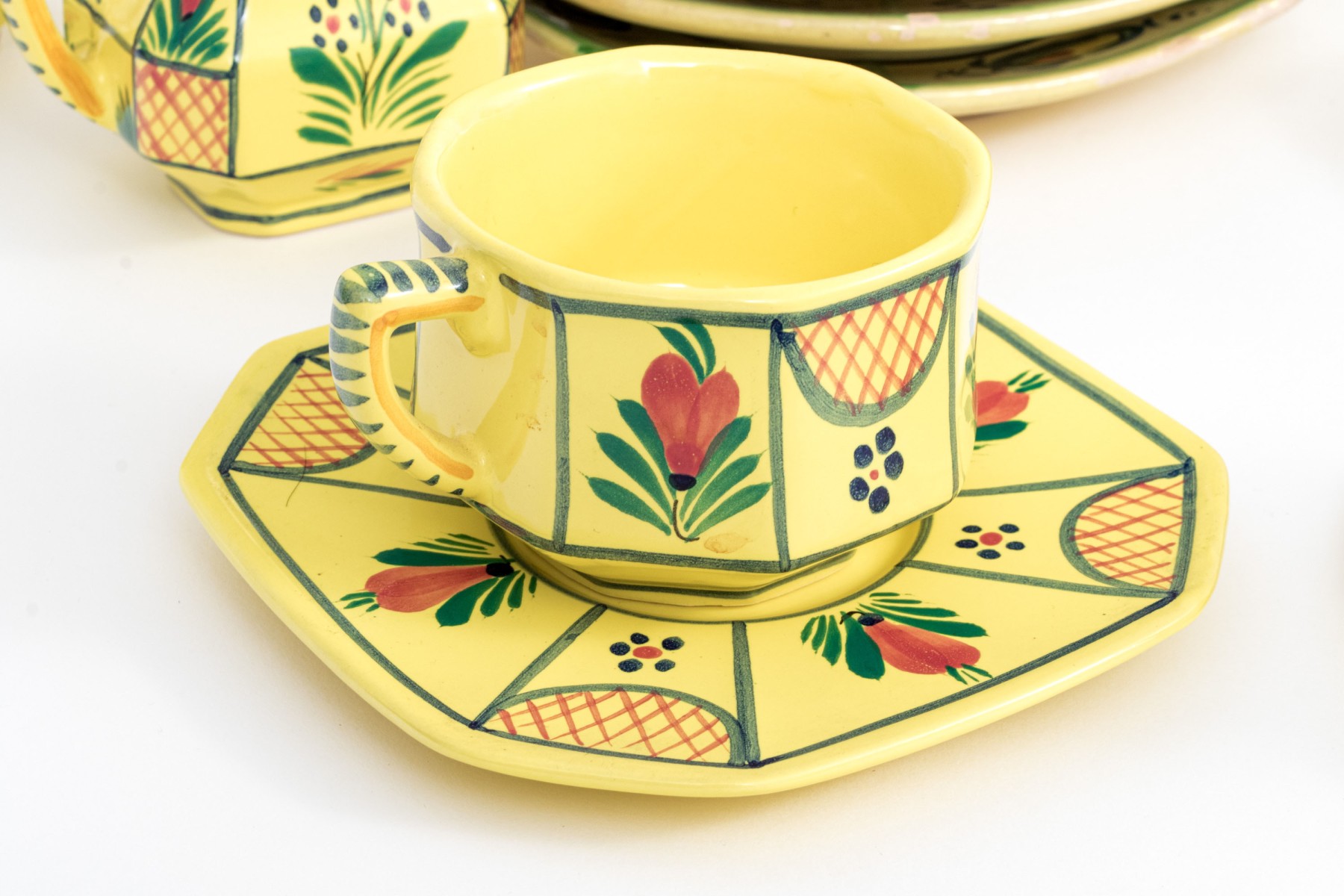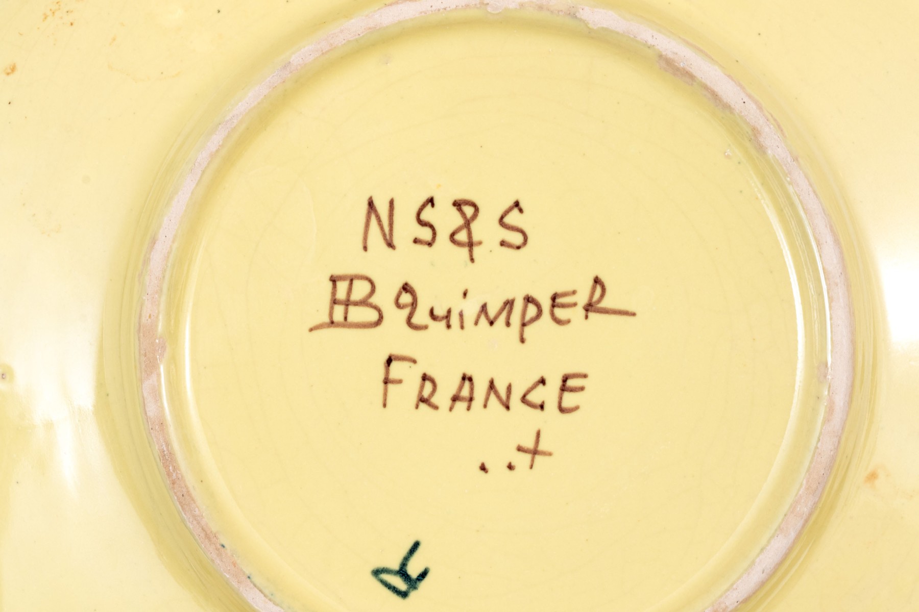Each with yellow ground and classic Quimper figural and foliate embellishment.