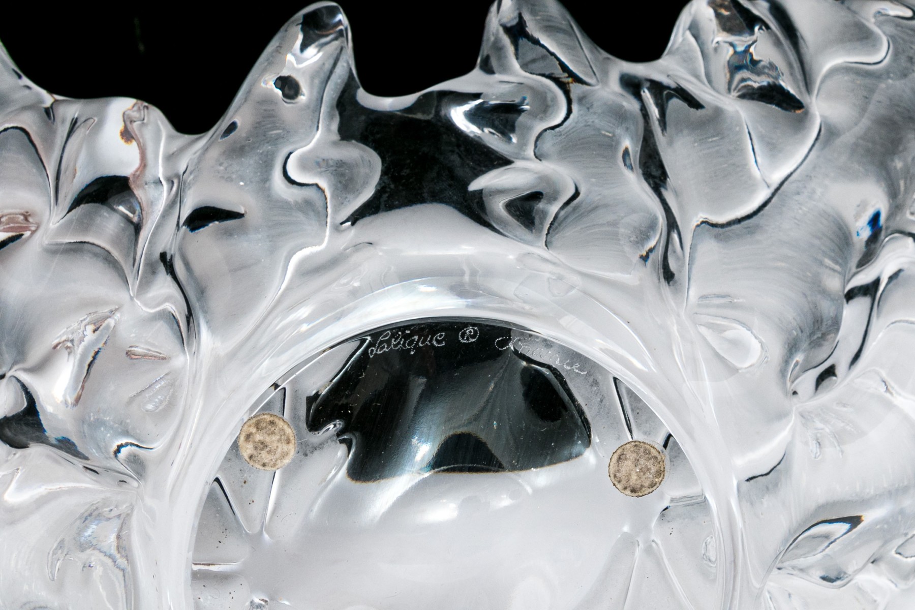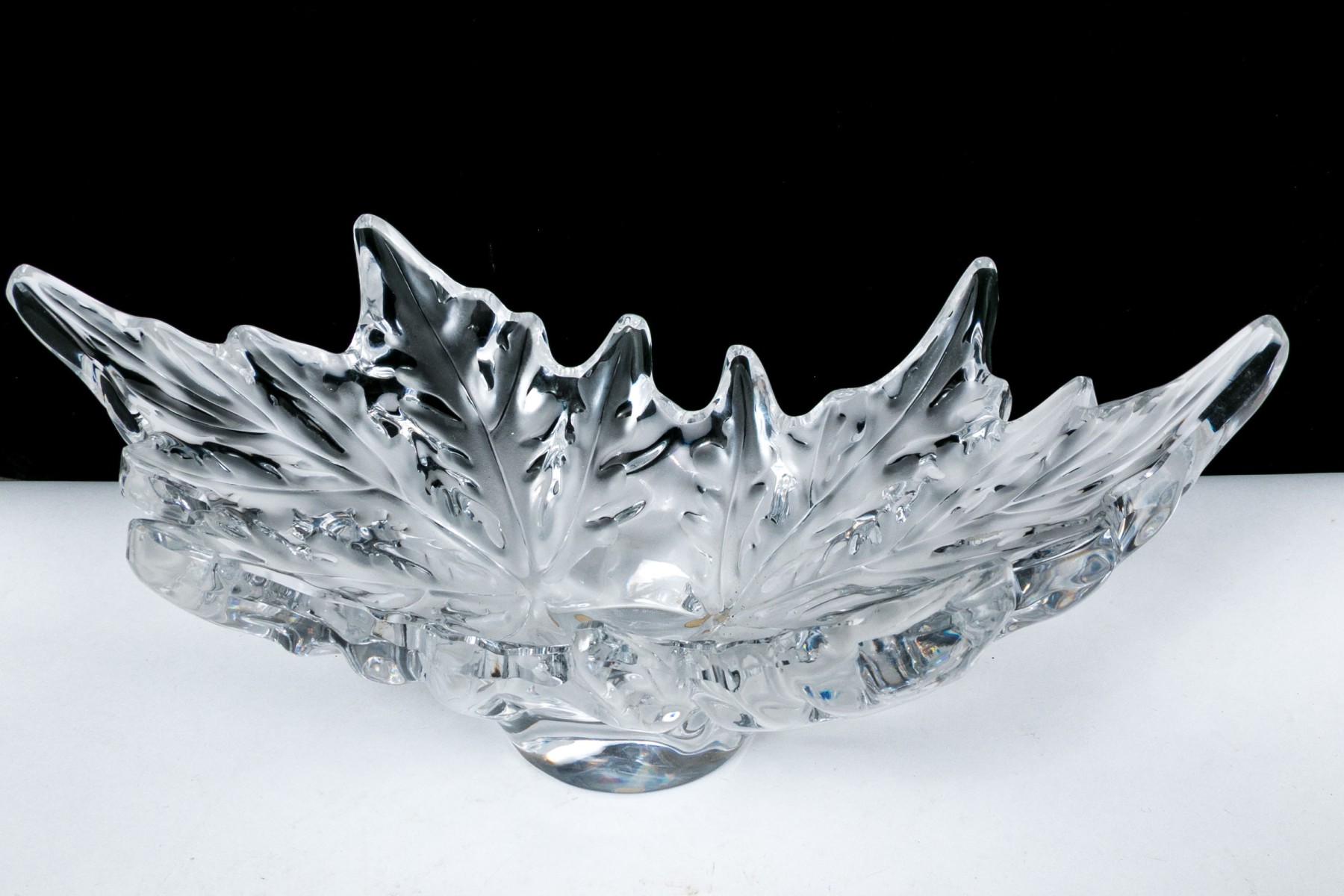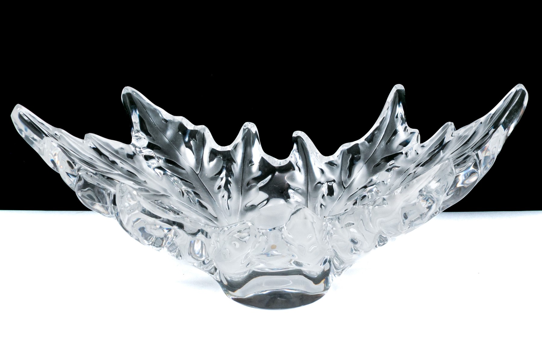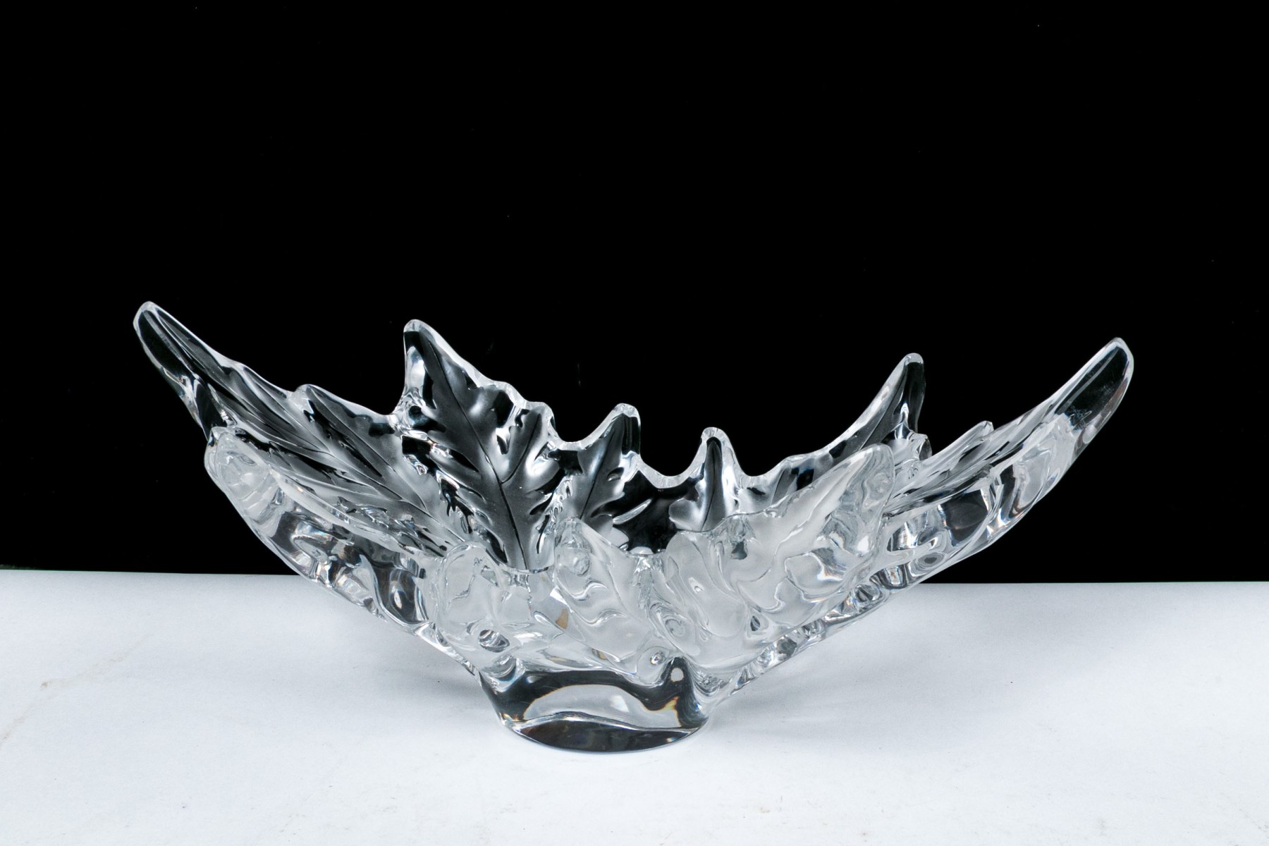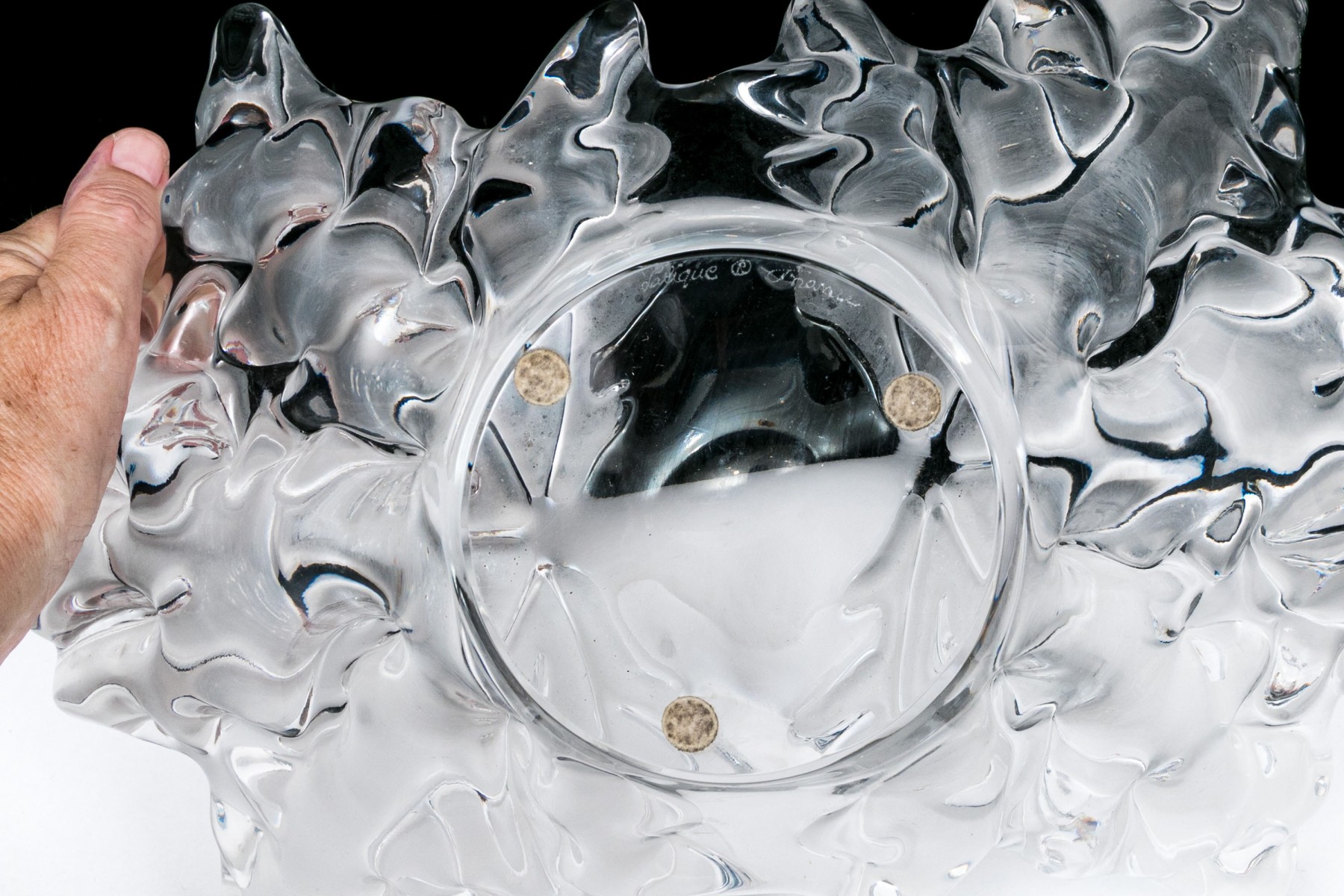 A gorgeous Lalique Crystal "Champs-Élysées" centerpiece bowl designed by Marc Lalique in 1951. The large oval bowl features a beautifully figured design with a dramatically scalloped rim incorporating relief oak leaf forms, creating an impactful and naturalistic aesthetic. Marked underfoot.