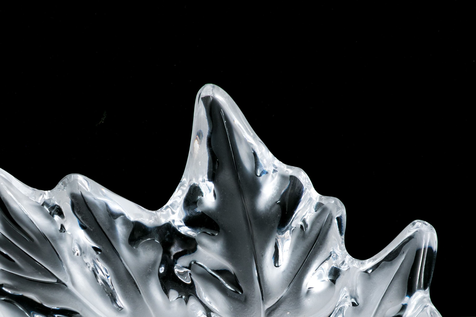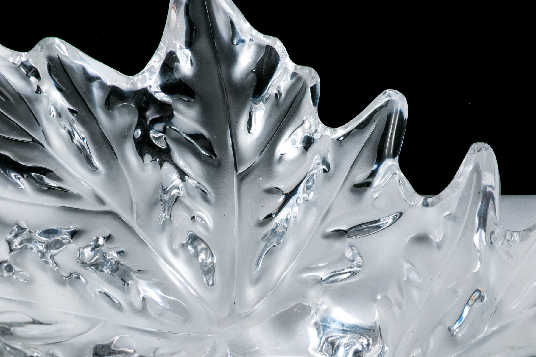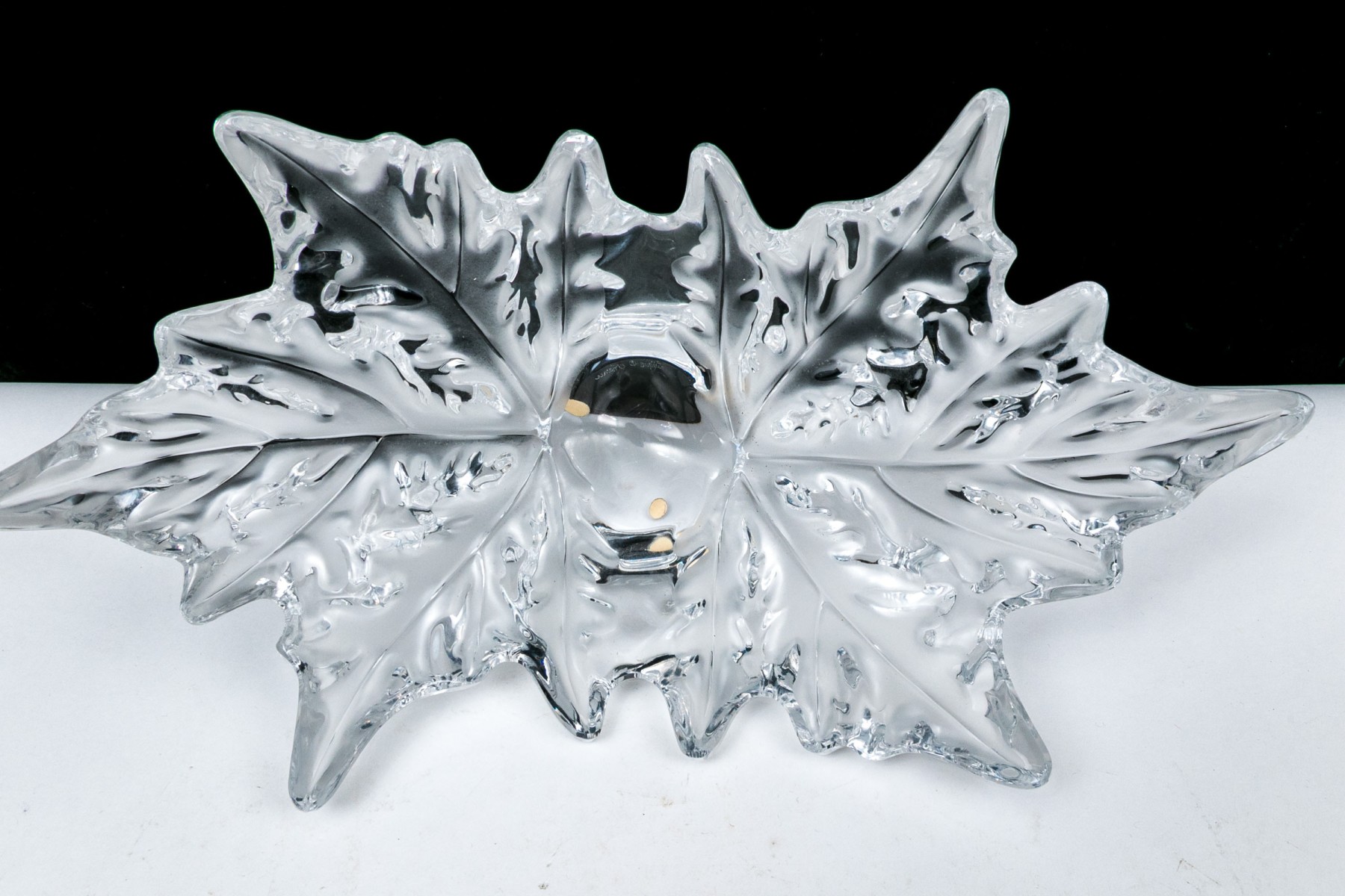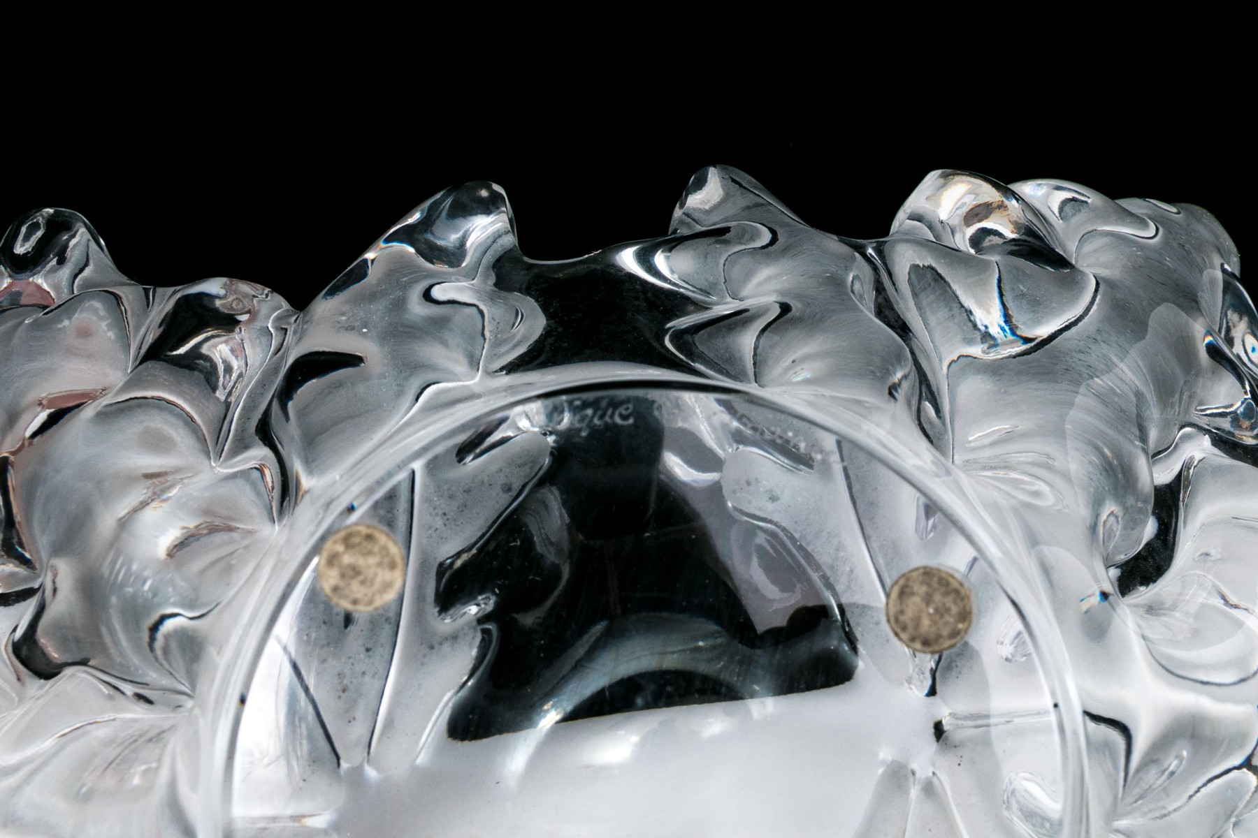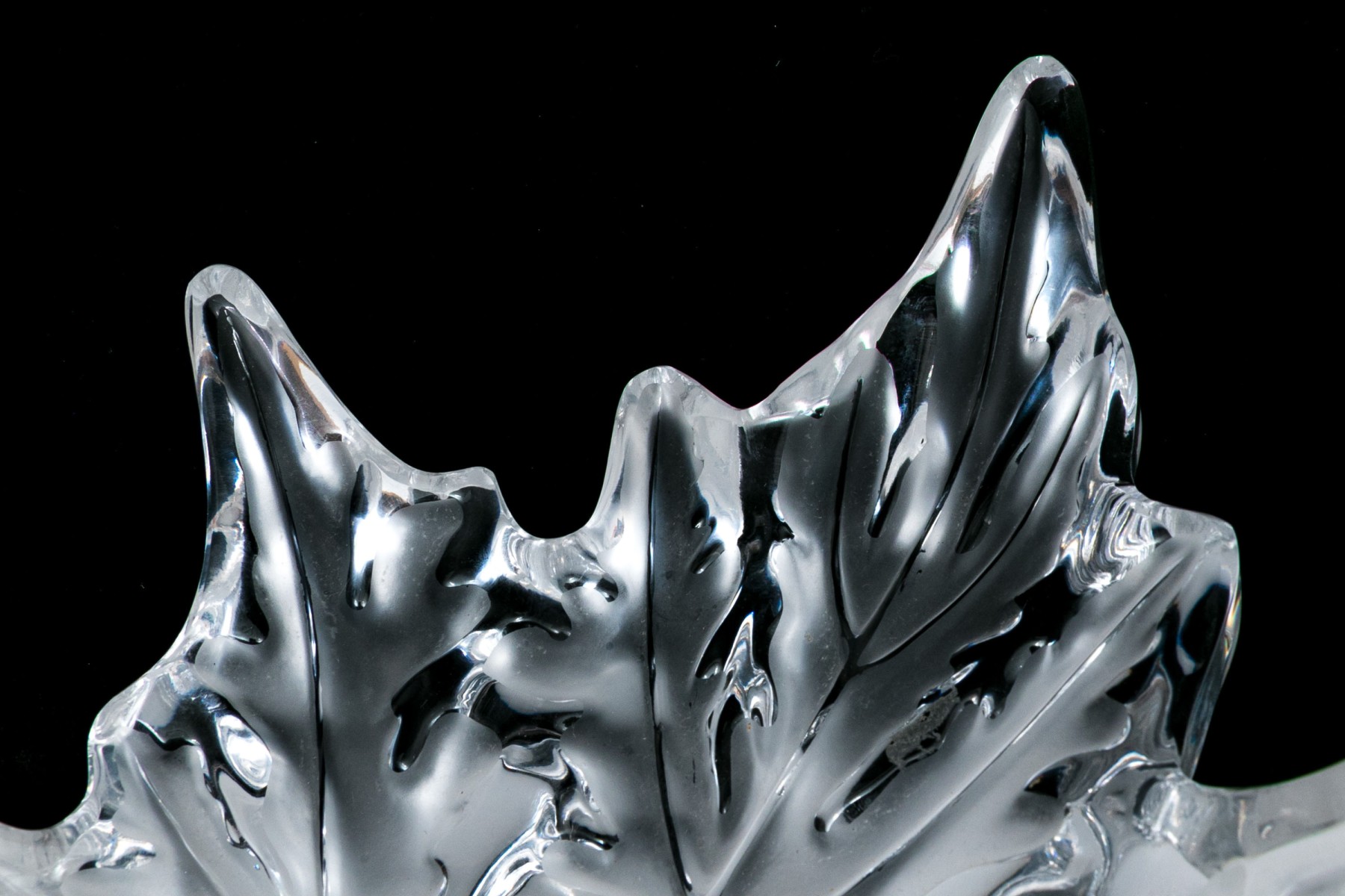 A gorgeous Lalique Crystal "Champs-Élysées" centerpiece bowl designed by Marc Lalique in 1951. The large oval bowl features a beautifully figured design with a dramatically scalloped rim incorporating relief oak leaf forms, creating an impactful and naturalistic aesthetic. Marked underfoot.