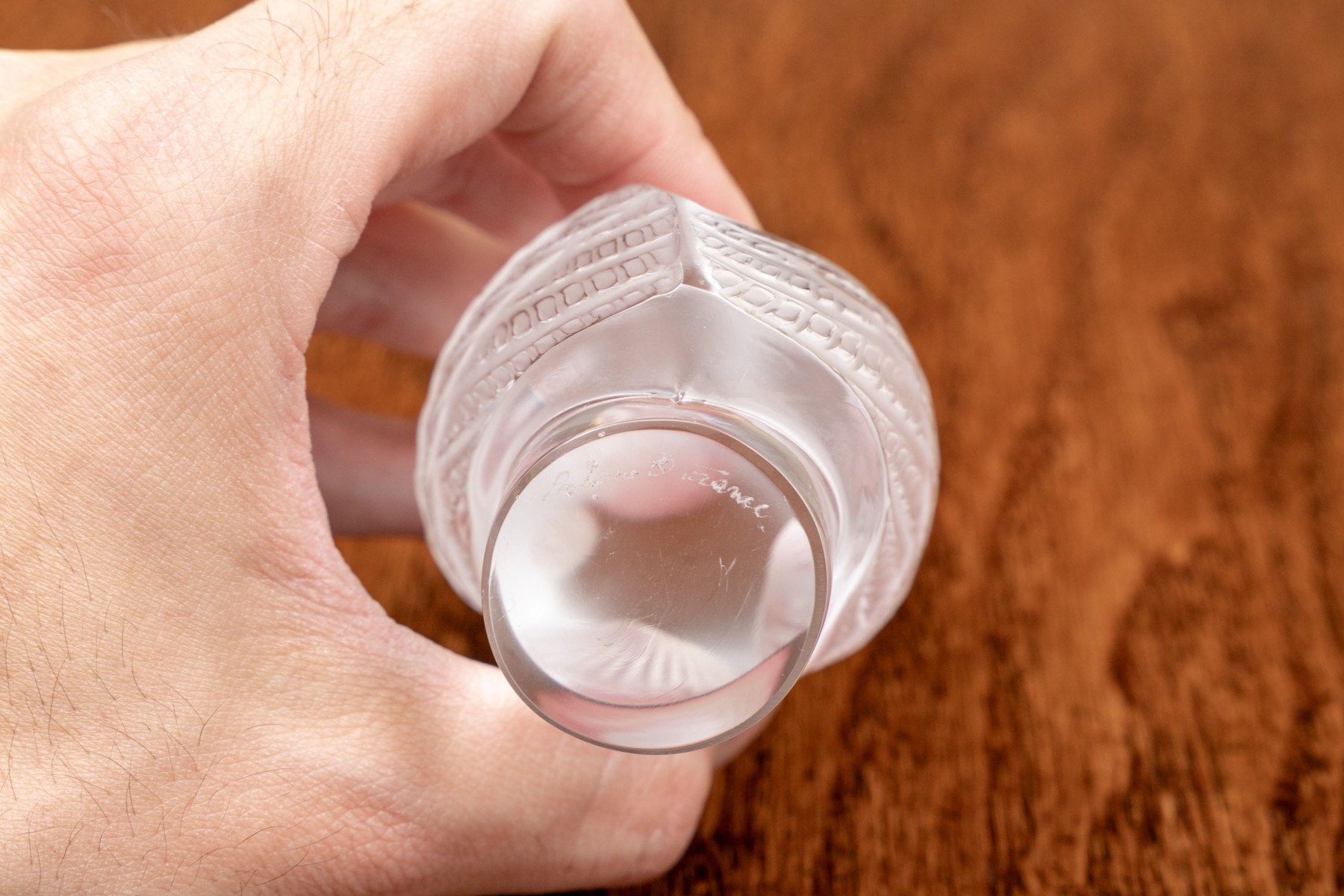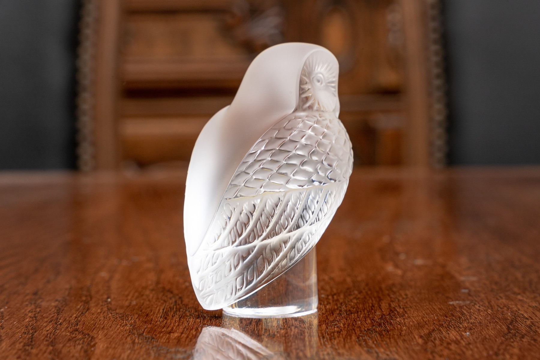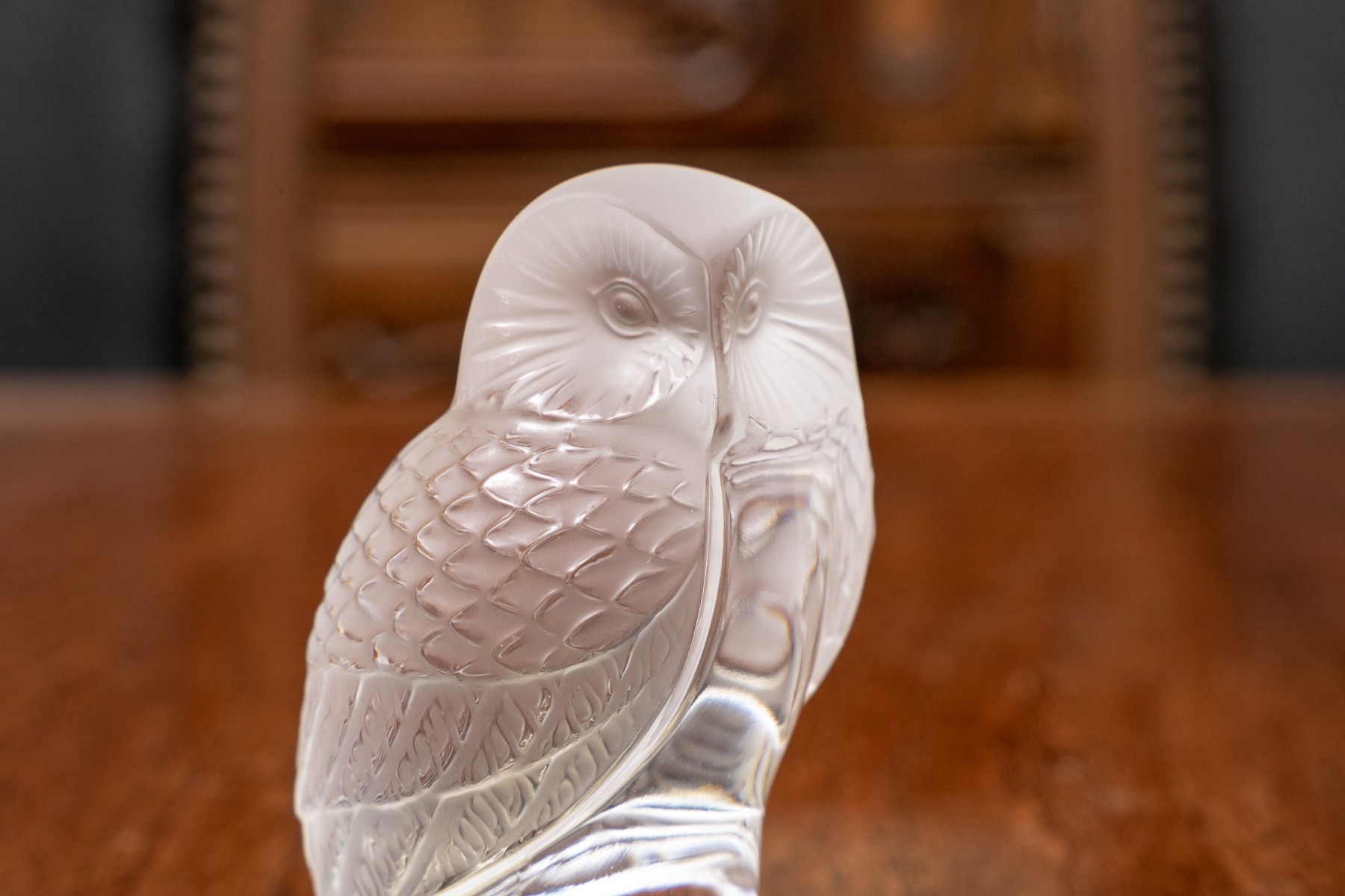 A chic French, Lalique crystal owl presented perched upon a cylindrical plinth.