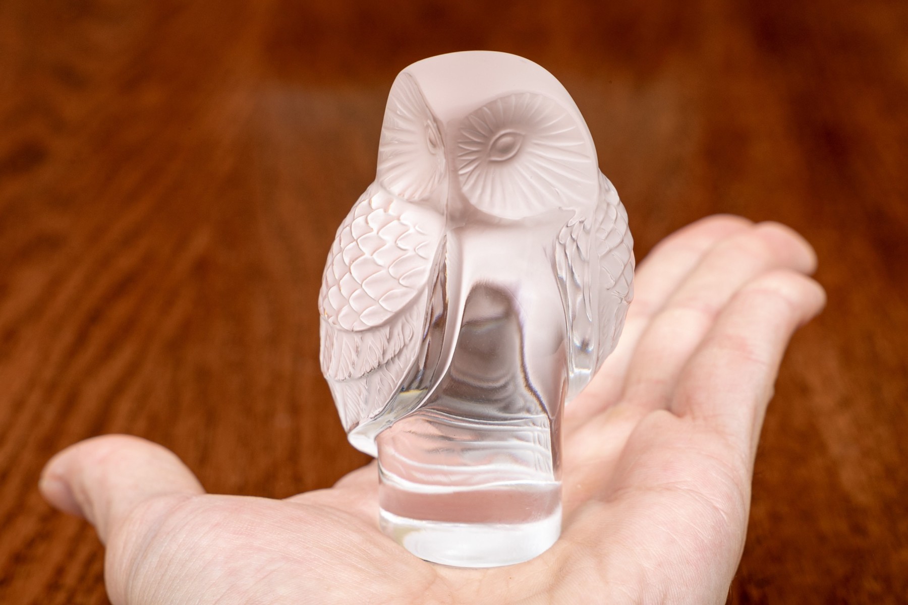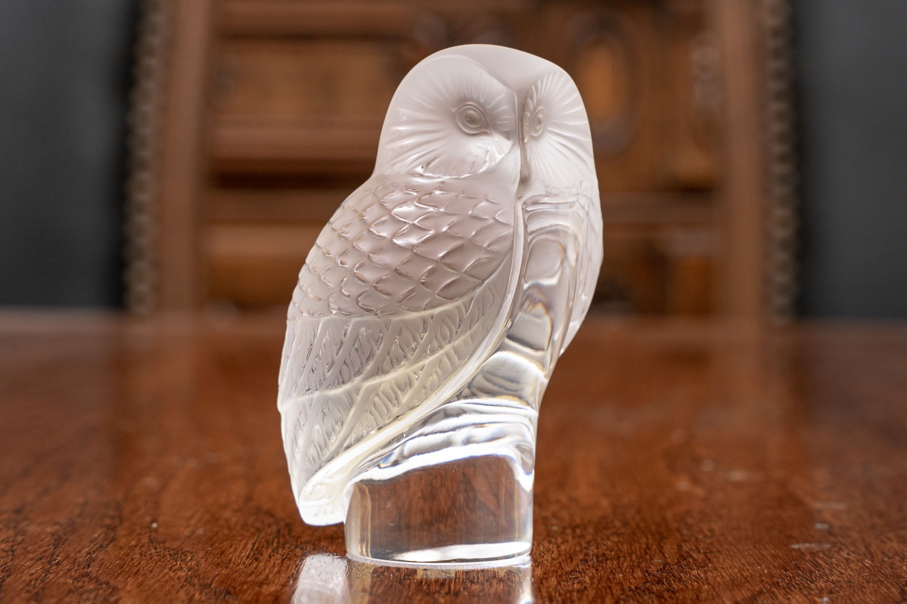 The owl with moulded and frosted finish, with delineated wings which are tucked in. The owl has its head tilted to the right hand side standing on a transparent finished, cylindrical plinth.