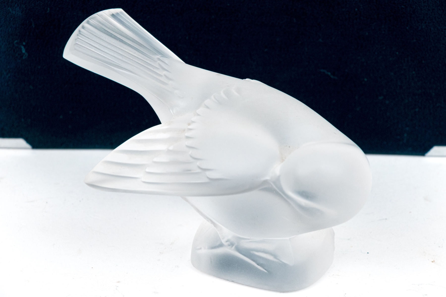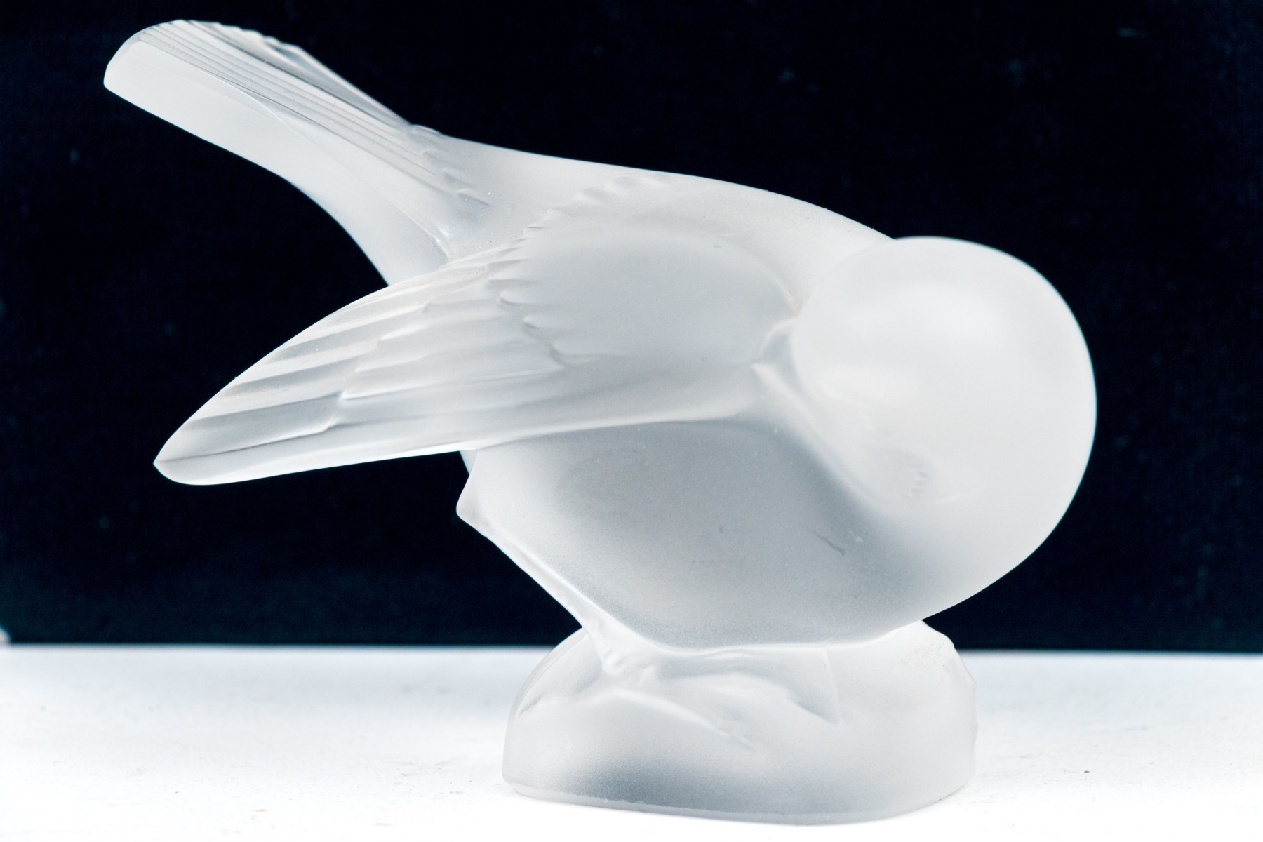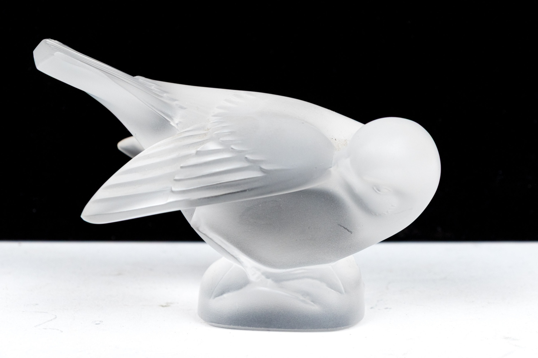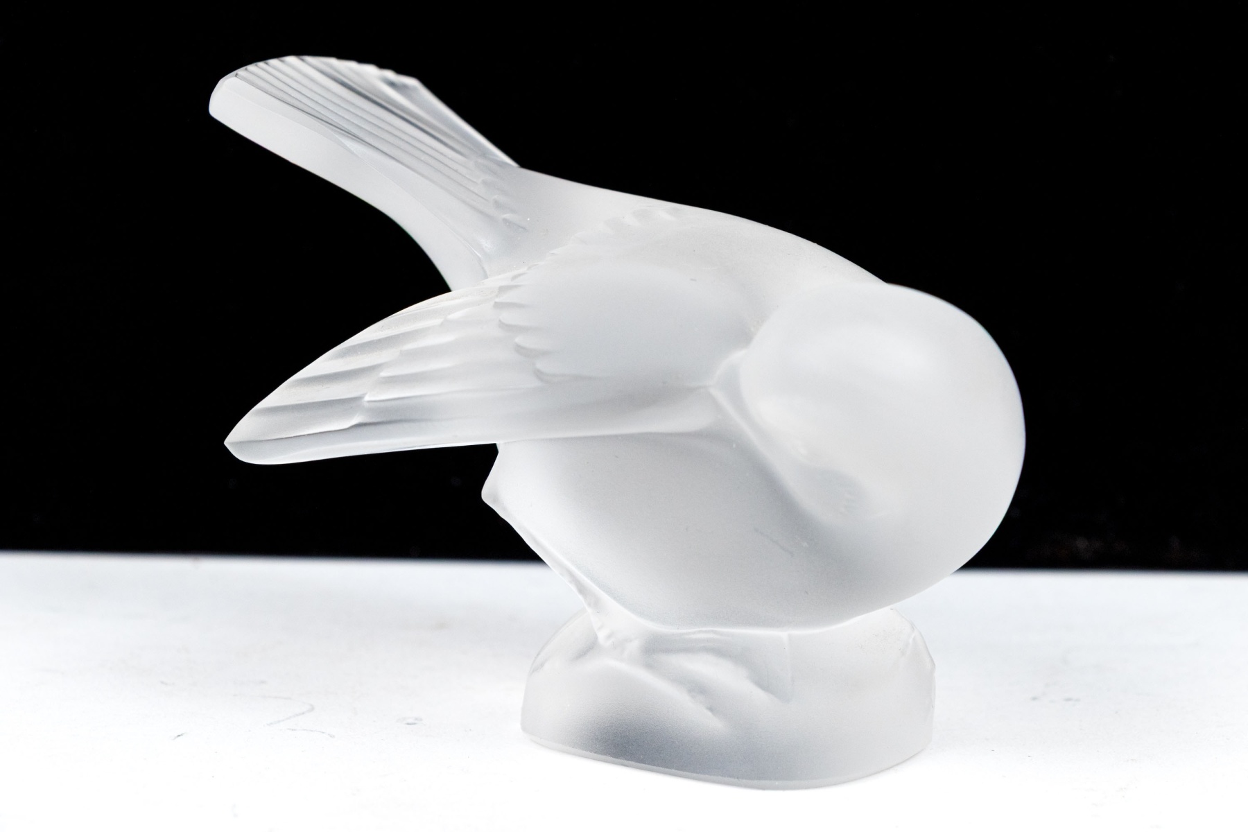 A charming and high quality Lalique frosted crystal figurine of an adorable sparrow tucking its beak under its wing, posed perched on a rounded naturalistic base with its tail held high. Signed on the base.