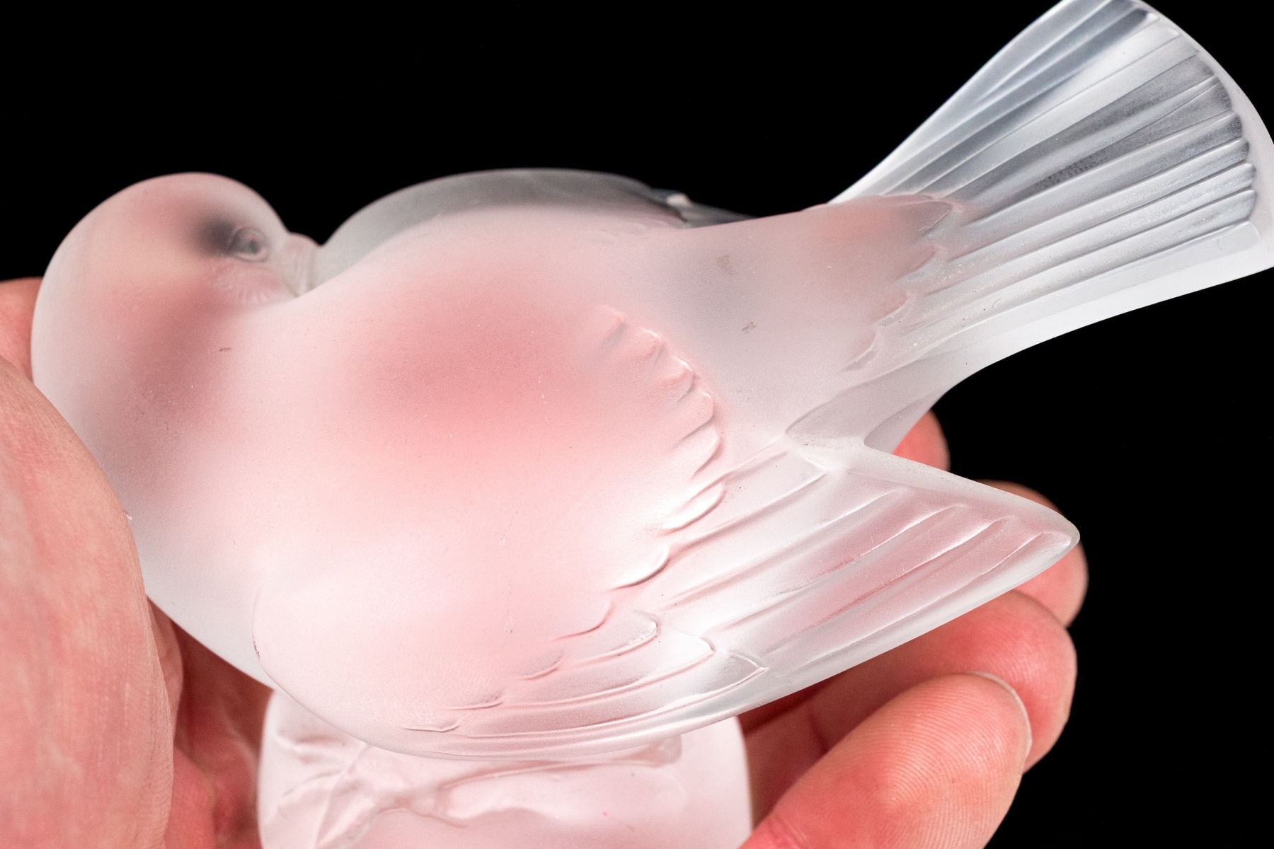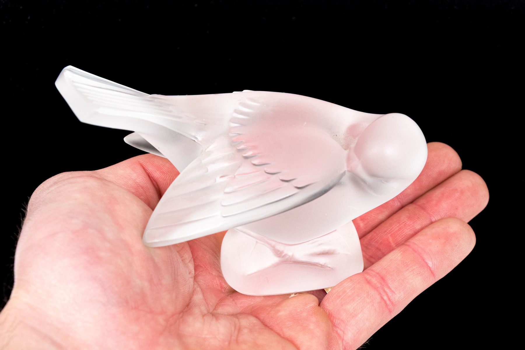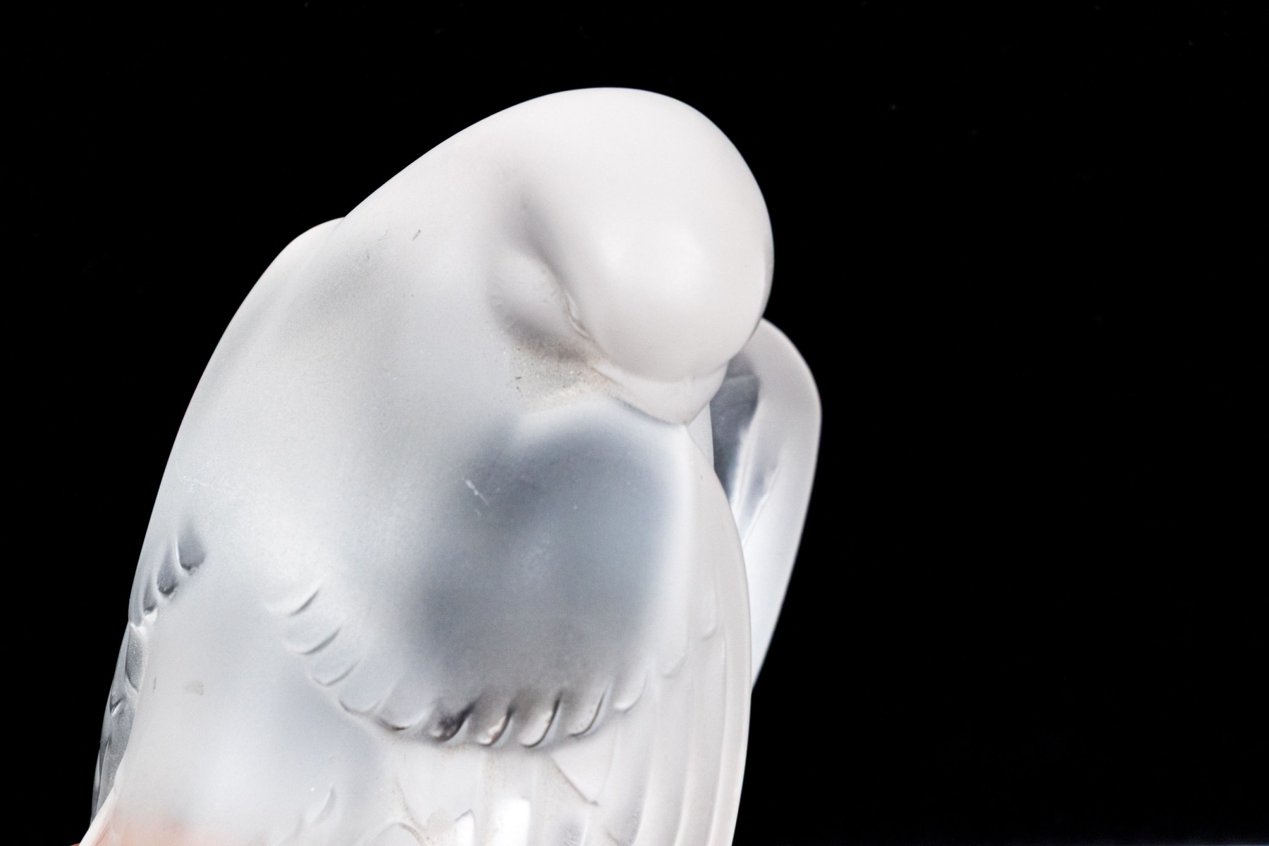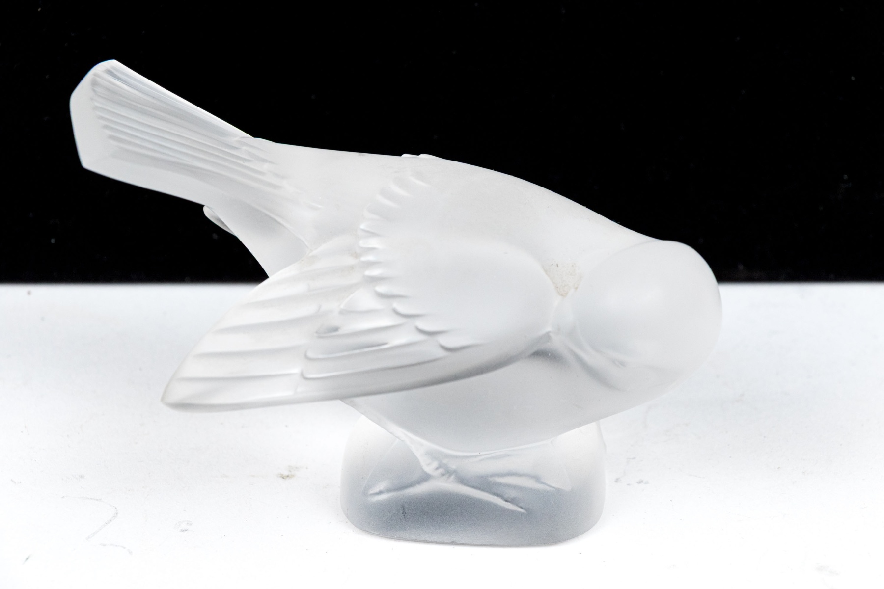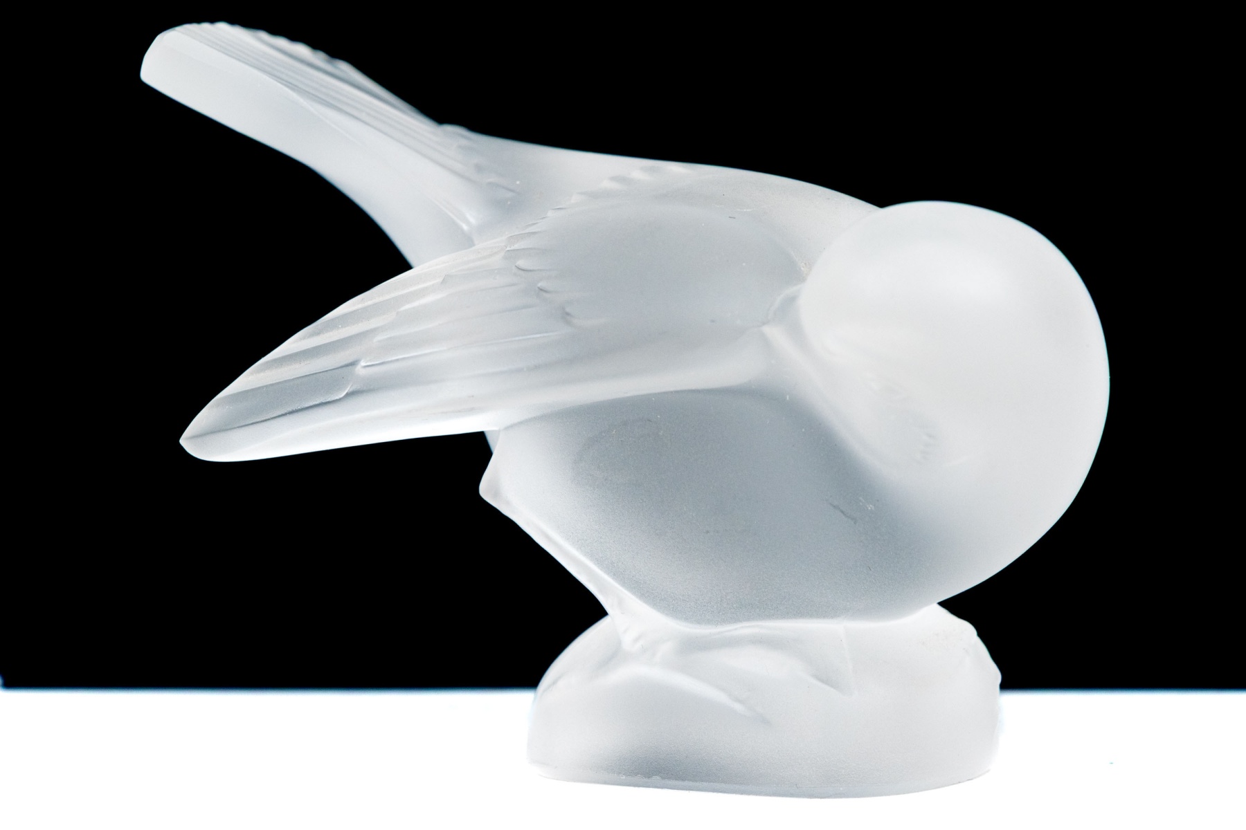 A charming and high quality Lalique frosted crystal figurine of an adorable sparrow tucking its beak under its wing, posed perched on a rounded naturalistic base with its tail held high. Signed on the base.