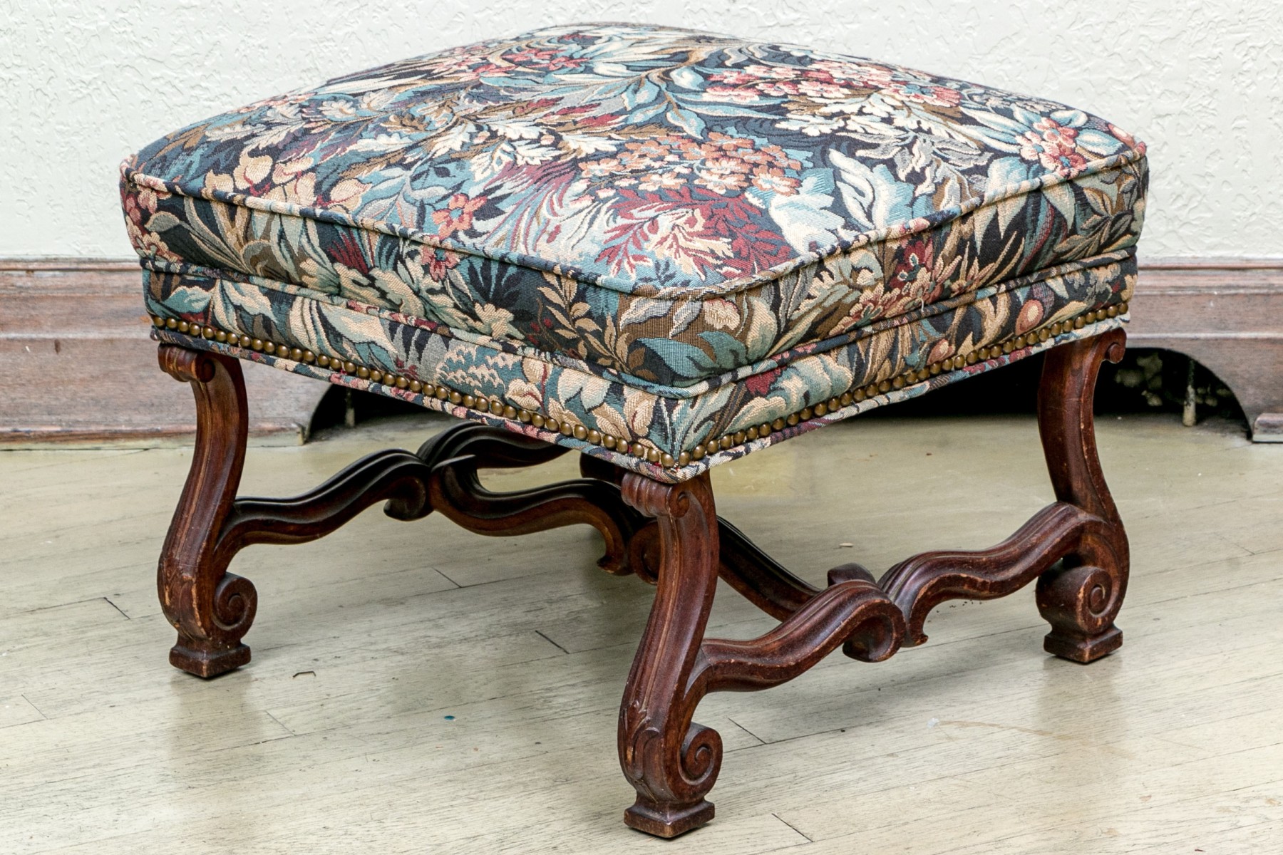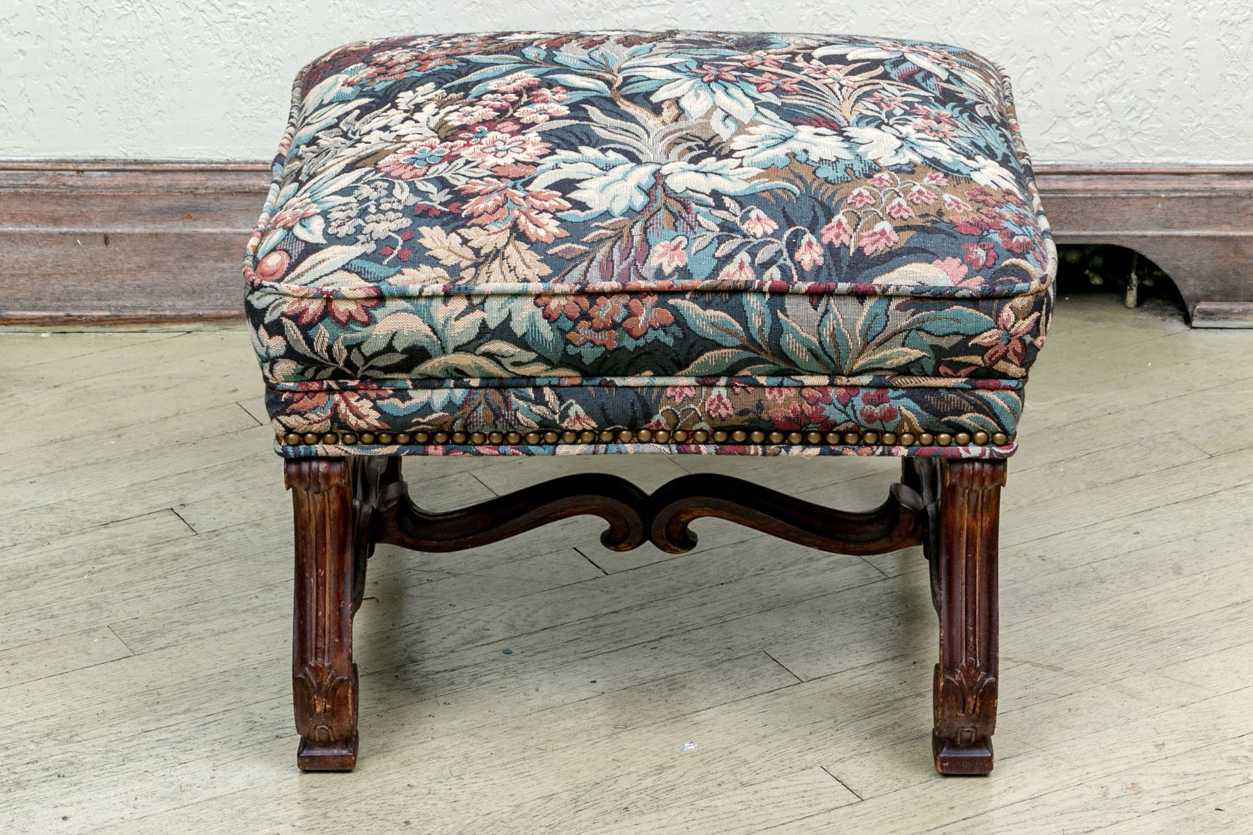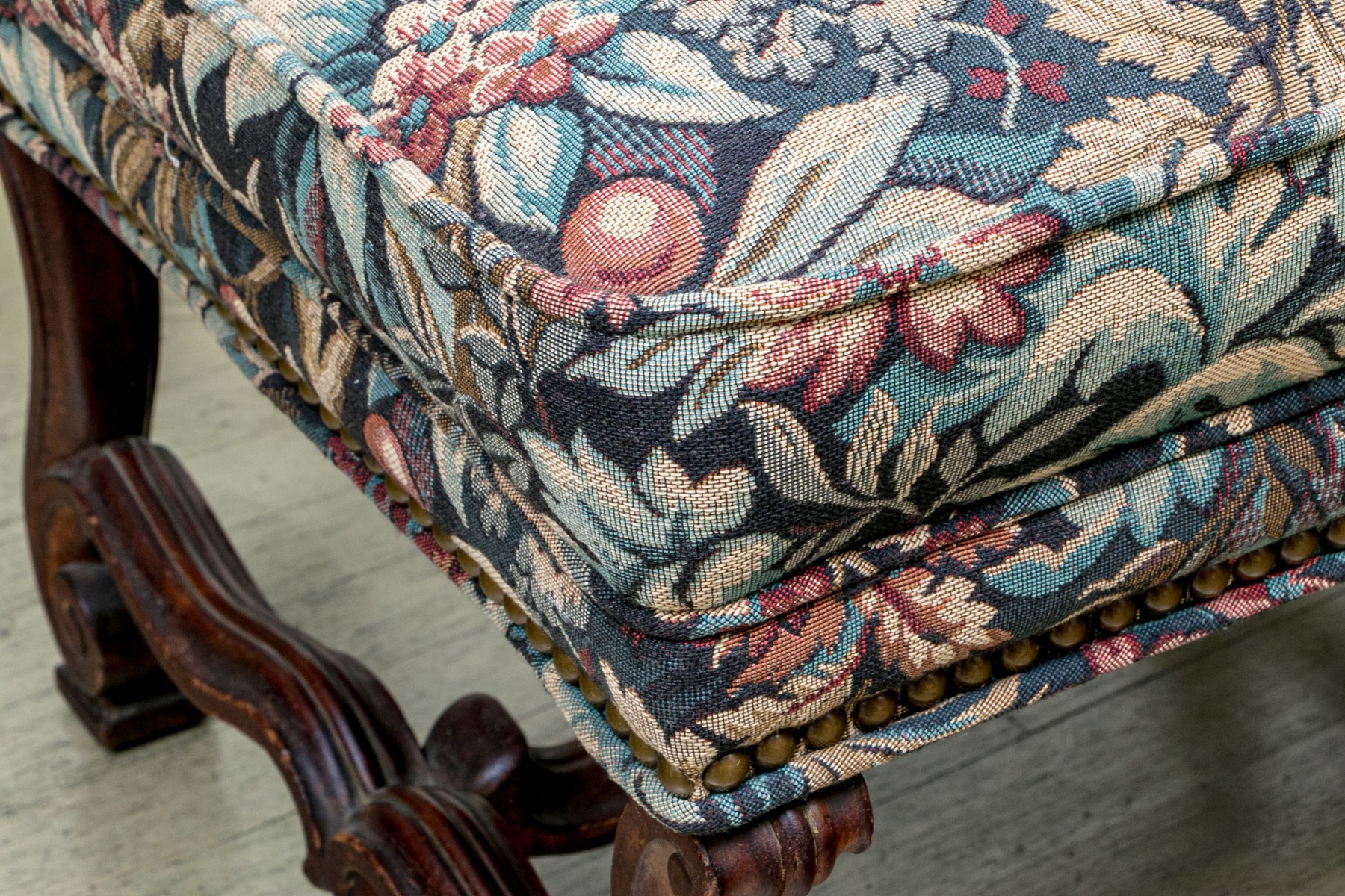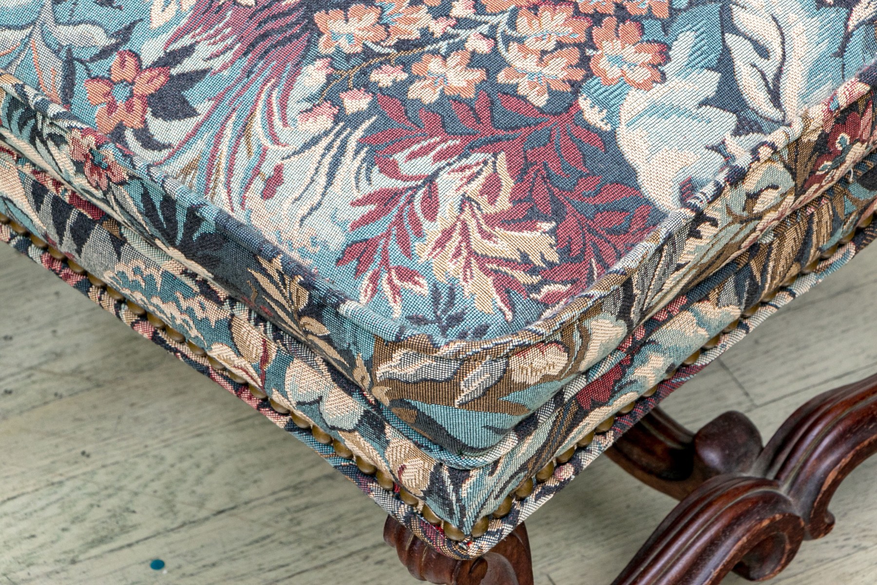 A fantastic French Louis XIV style bench with a rectangular top upholstered in tapestry style fabric with lush botanicals in blue, red, and yellow. Detailed with a nailhead trim and raised on a chocolate brown finished cared wood frame with elegant scrolled and curved legs surrounding a stately H-stretcher.
