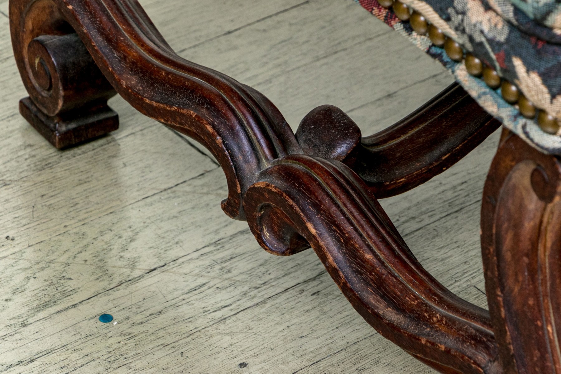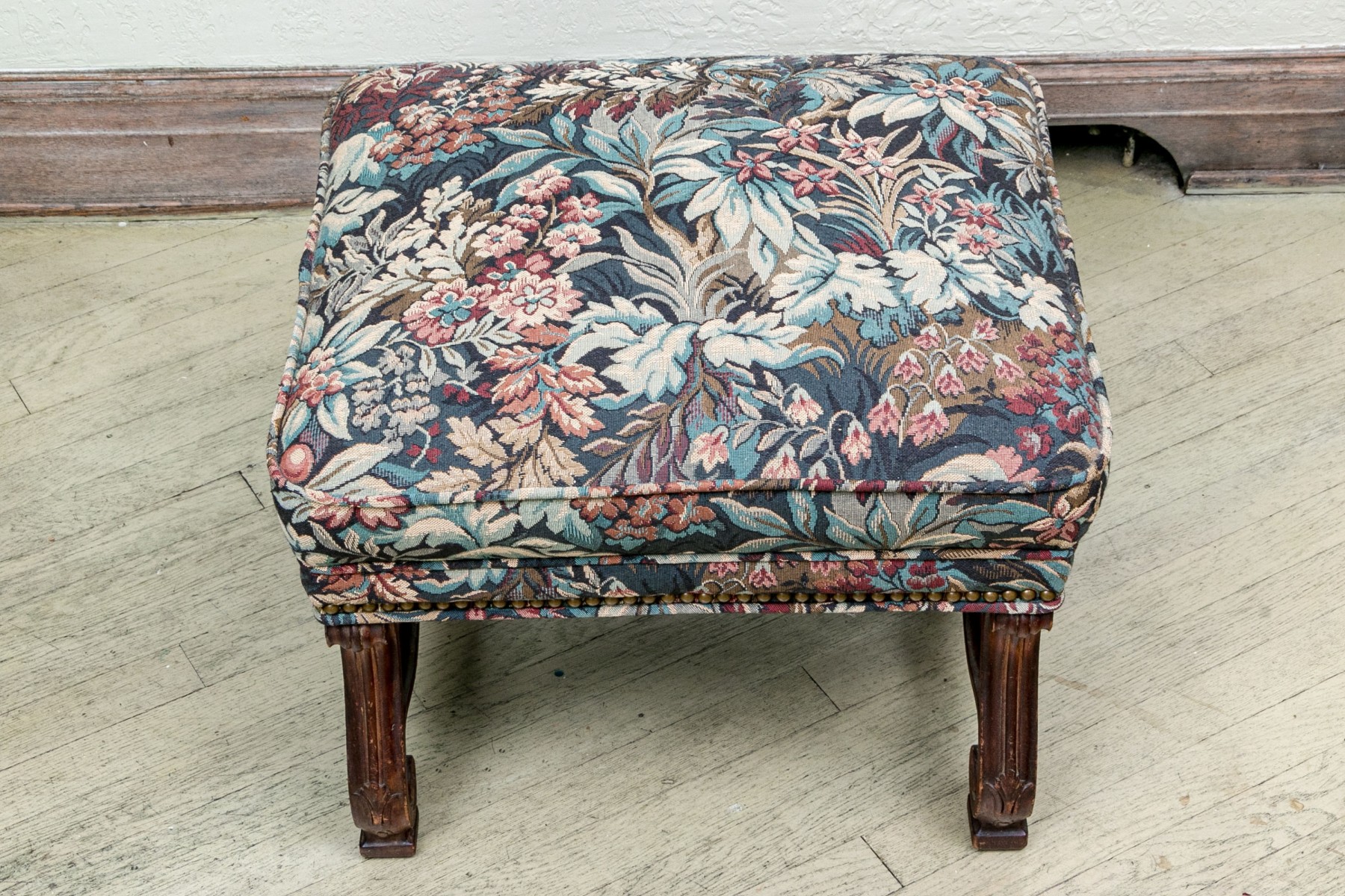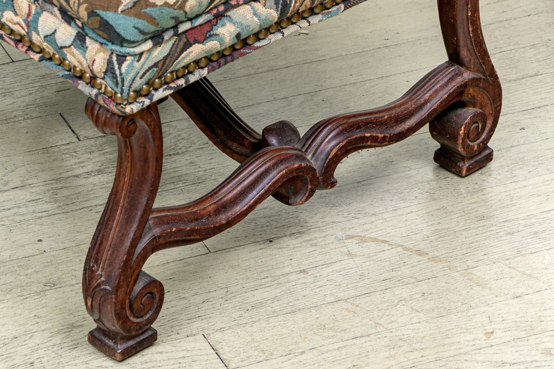 A fantastic French Louis XIV style bench with a rectangular top upholstered in tapestry style fabric with lush botanicals in blue, red, and yellow. Detailed with a nailhead trim and raised on a chocolate brown finished cared wood frame with elegant scrolled and curved legs surrounding a stately H-stretcher.