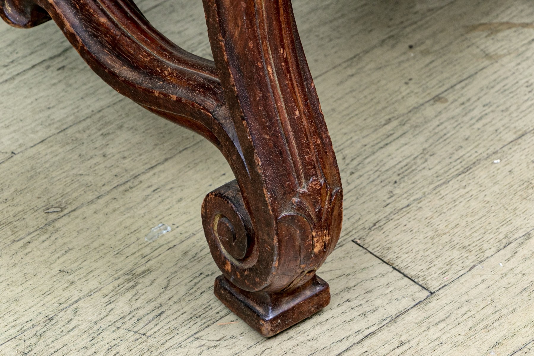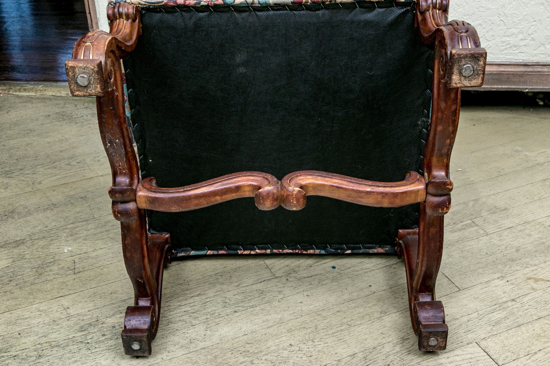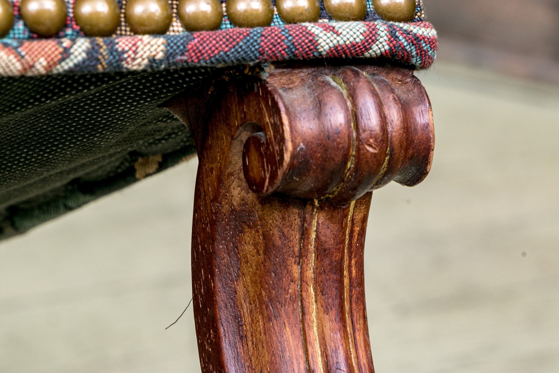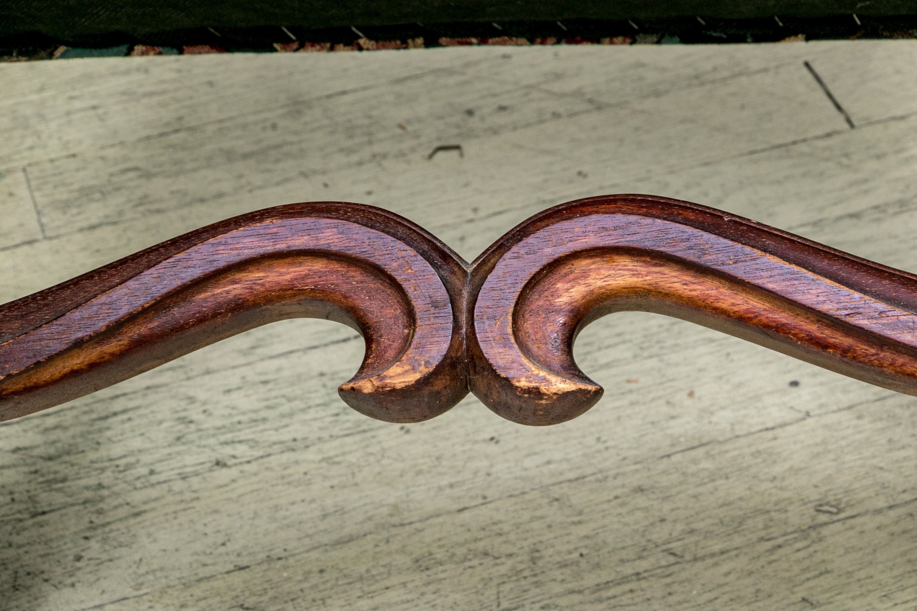 A fantastic French Louis XIV style bench with a rectangular top upholstered in tapestry style fabric with lush botanicals in blue, red, and yellow. Detailed with a nailhead trim and raised on a chocolate brown finished cared wood frame with elegant scrolled and curved legs surrounding a stately H-stretcher.