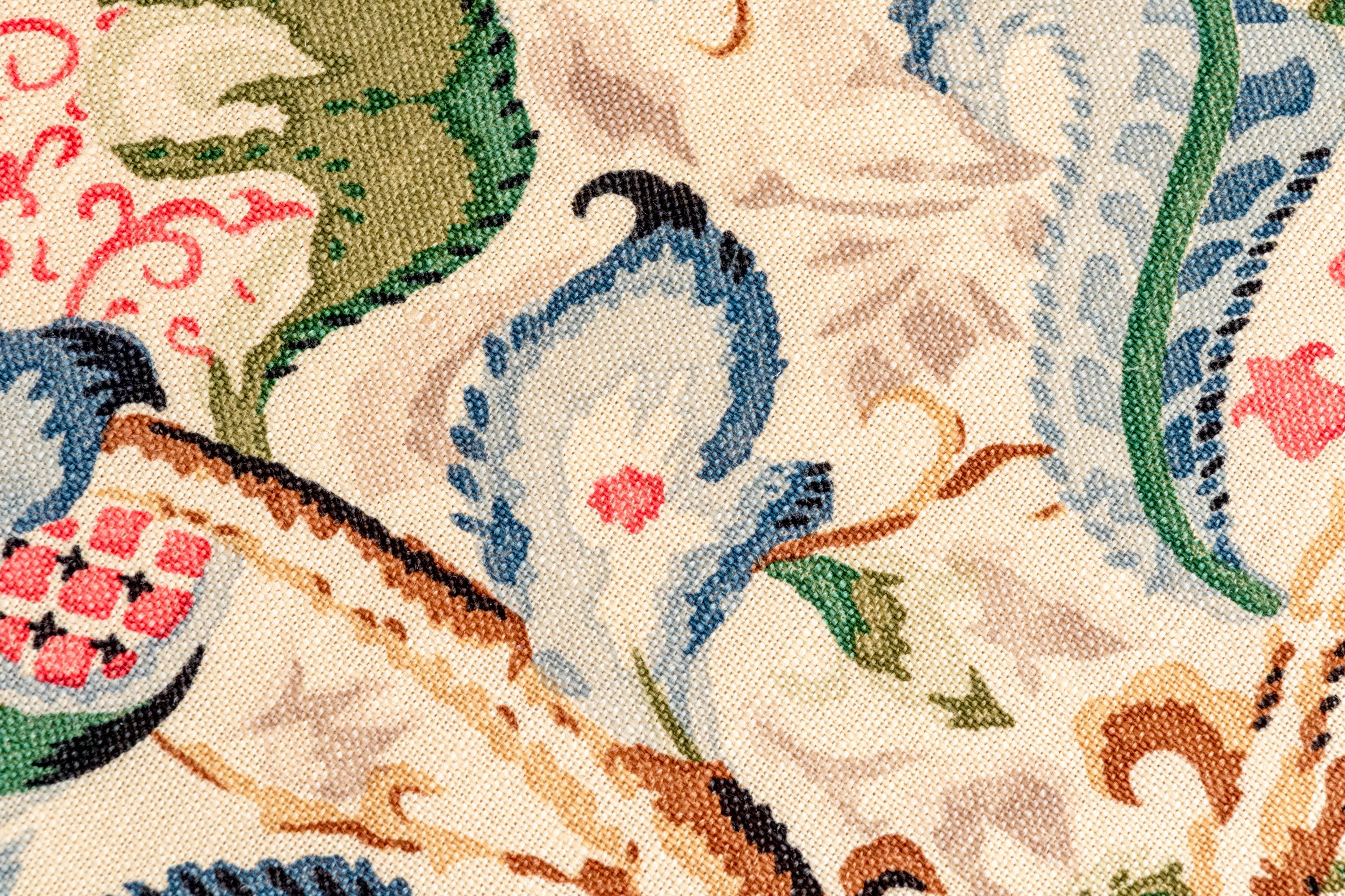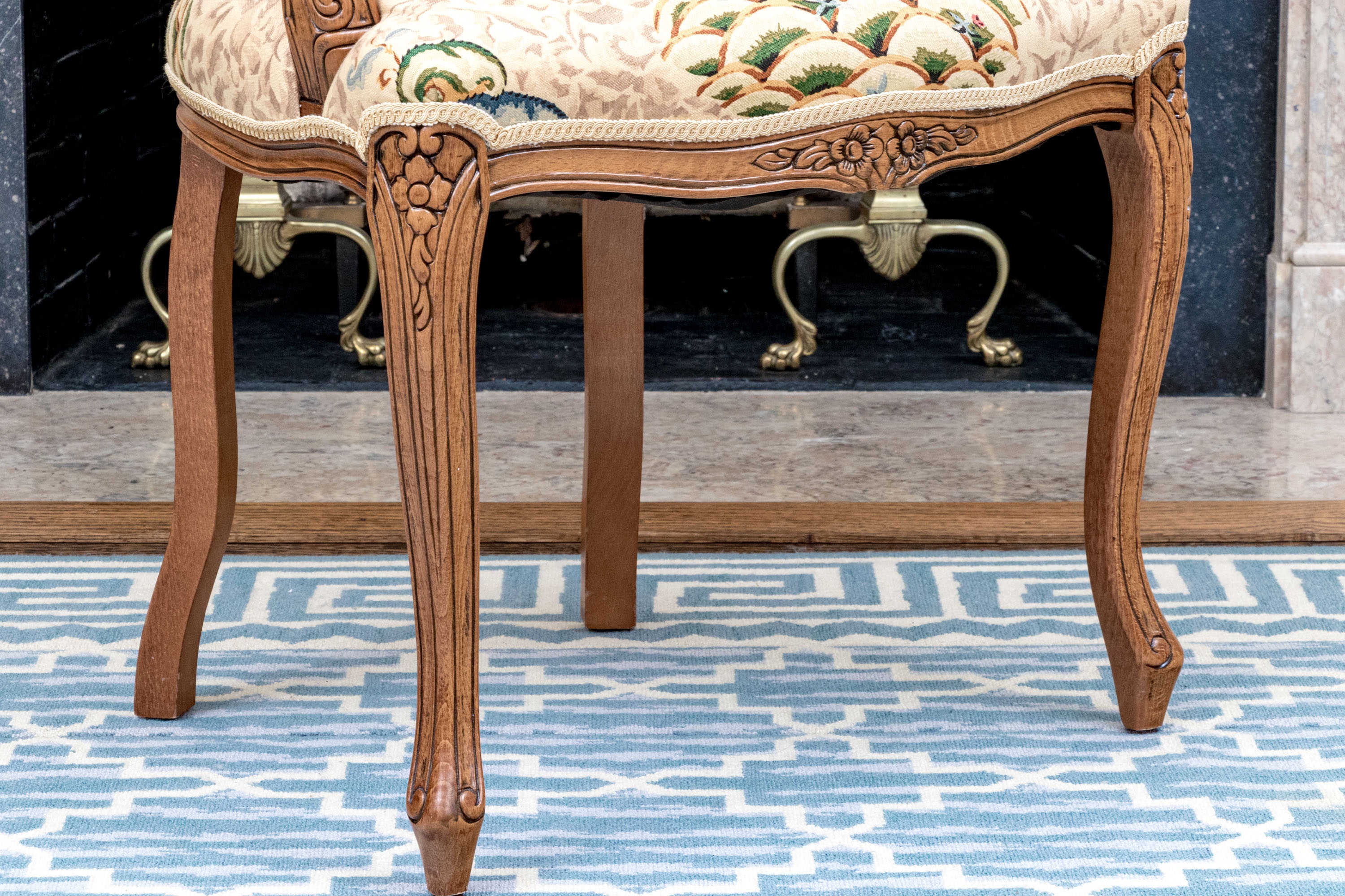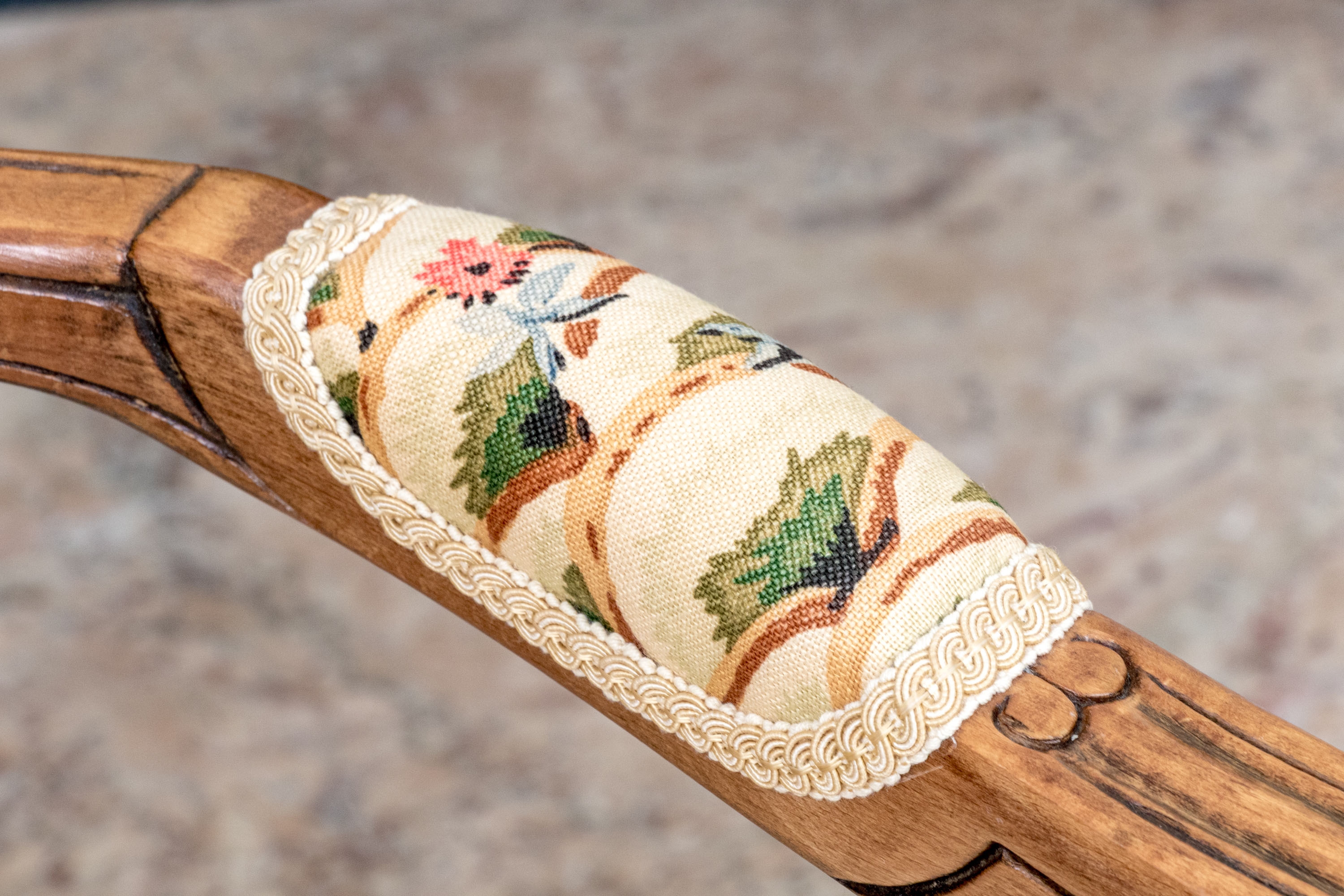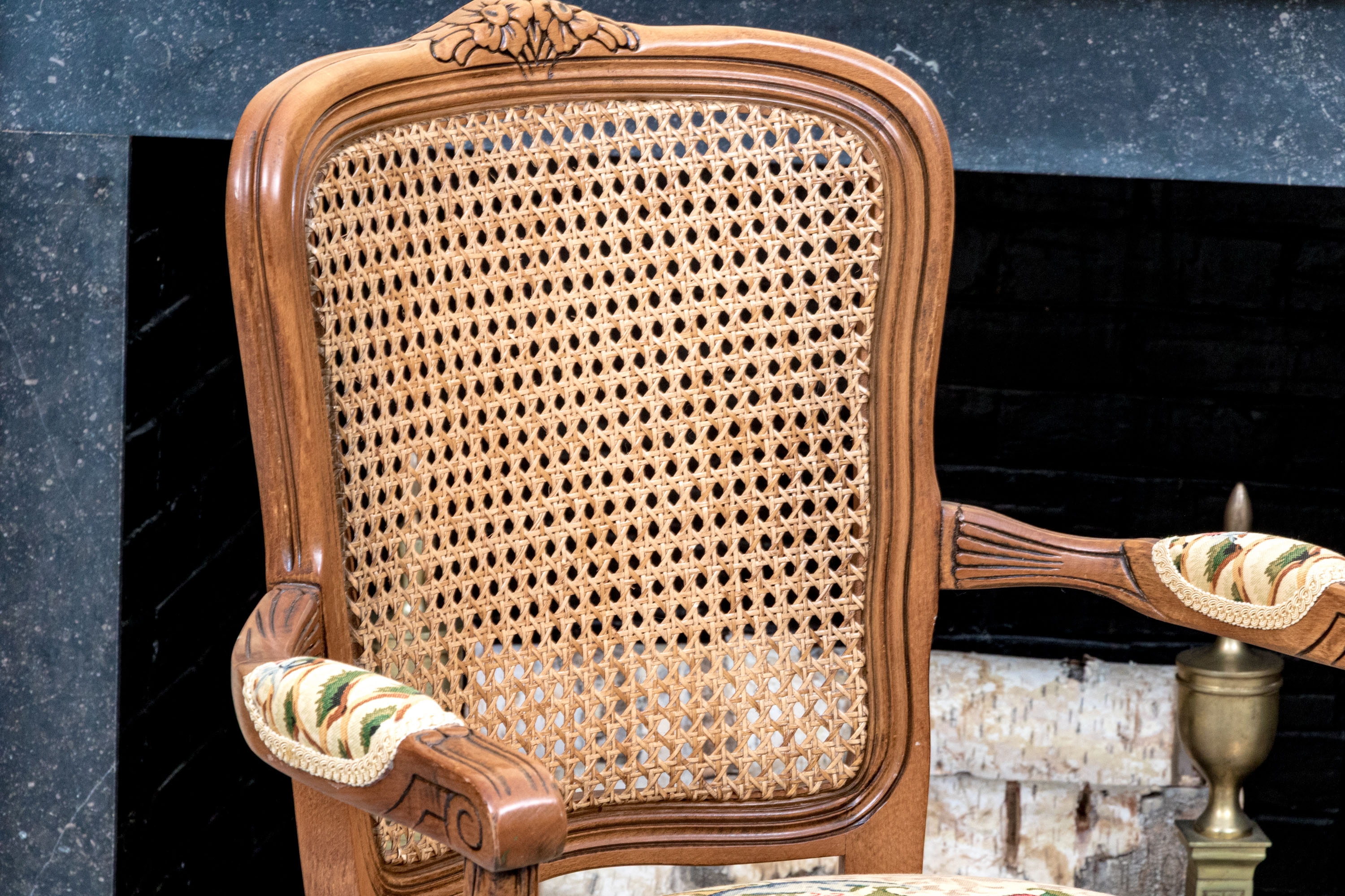 A handsome French Louis XV style fauteuil showcasing a honeyed brown frame with a carved crest at the top of a caned back, leading to nicely carved arms with scrolled and gadrooned motifs leading to arm supports with foliate designs. The seat is nicely upholstered in stately needlepoint styled fabric with colorful foliate sprays against a subtle beige and brown leafy design on a cream ground. Finished with a serpentine apron and gently curved cabriole legs carved around the top.