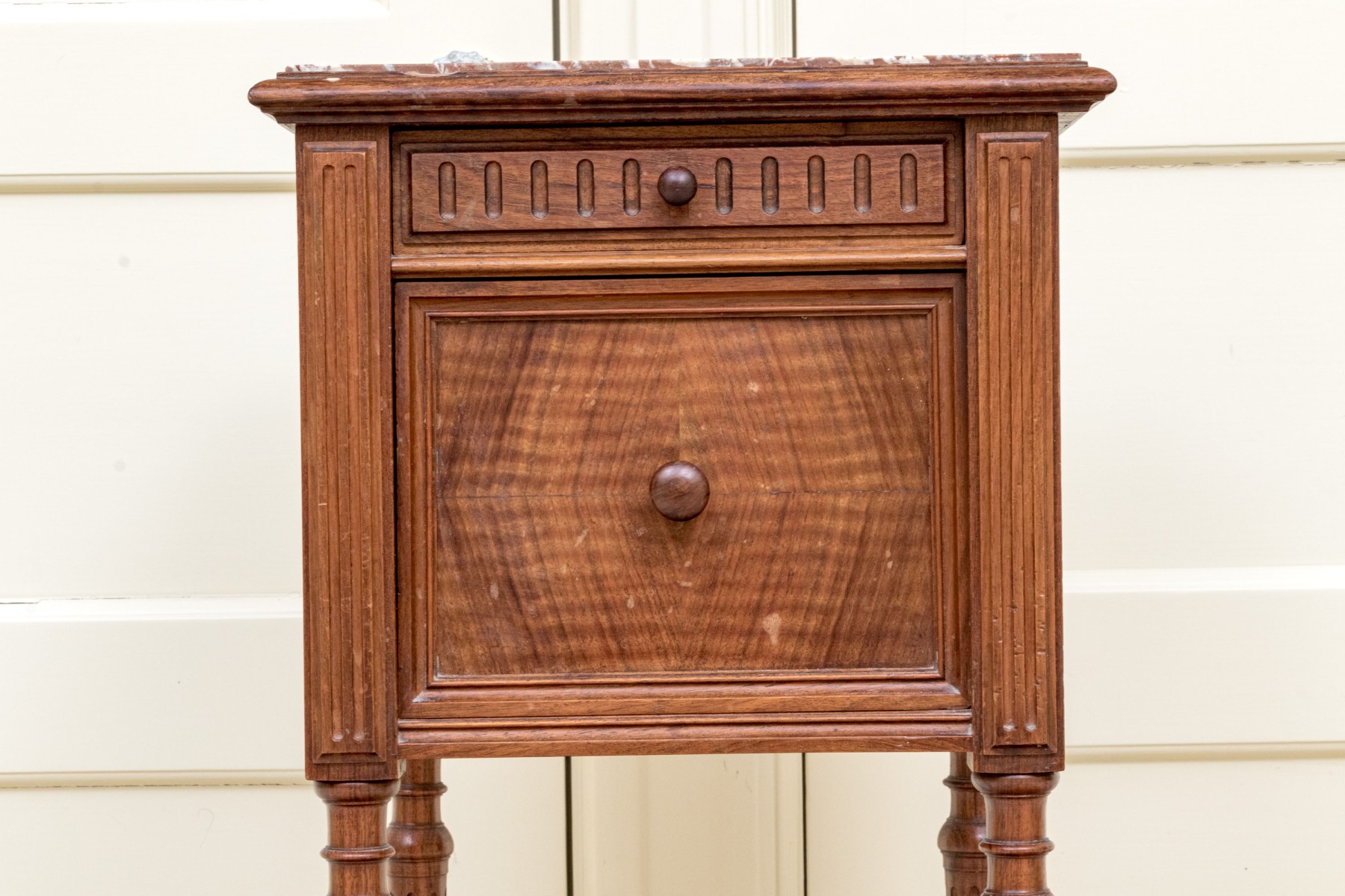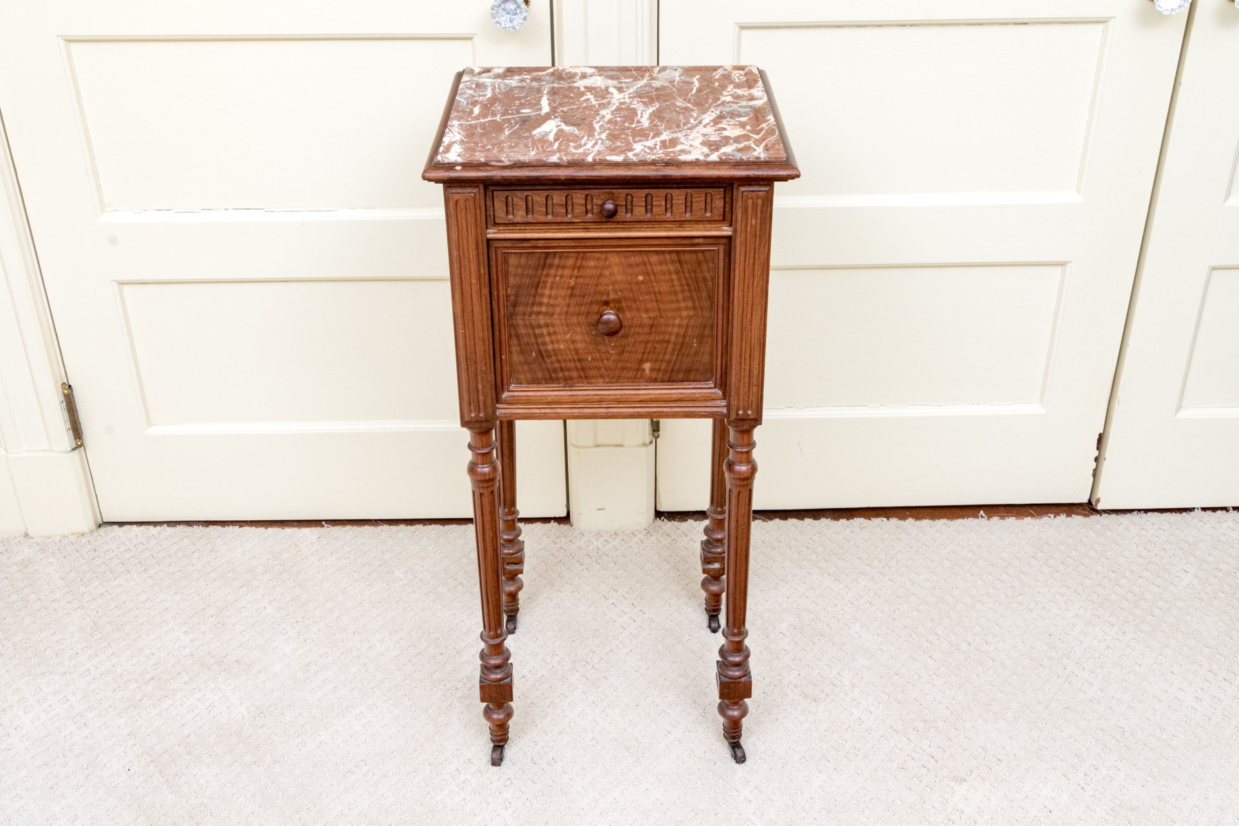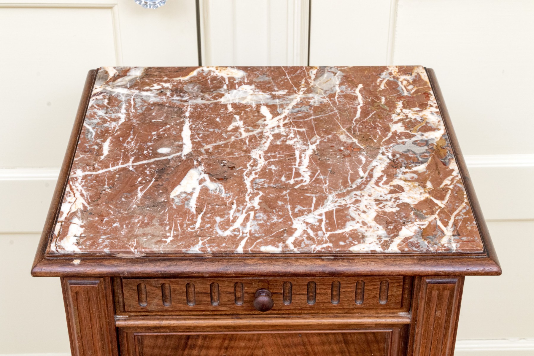 A delightful French style commode nightstand in warm-toned medium brown, featuring an orange marble top over a short drawer overhanging a single cabinet door with a figured exterior and a marble lined interior. Supported by tapered and fluted legs over caster feet.