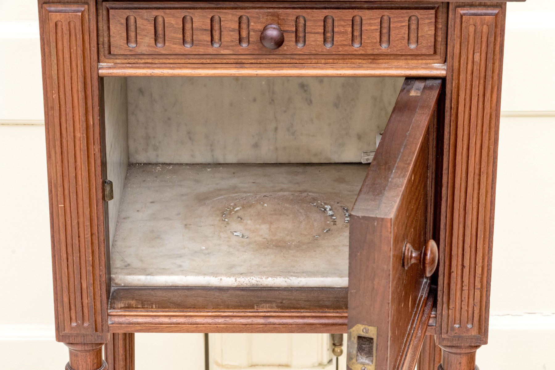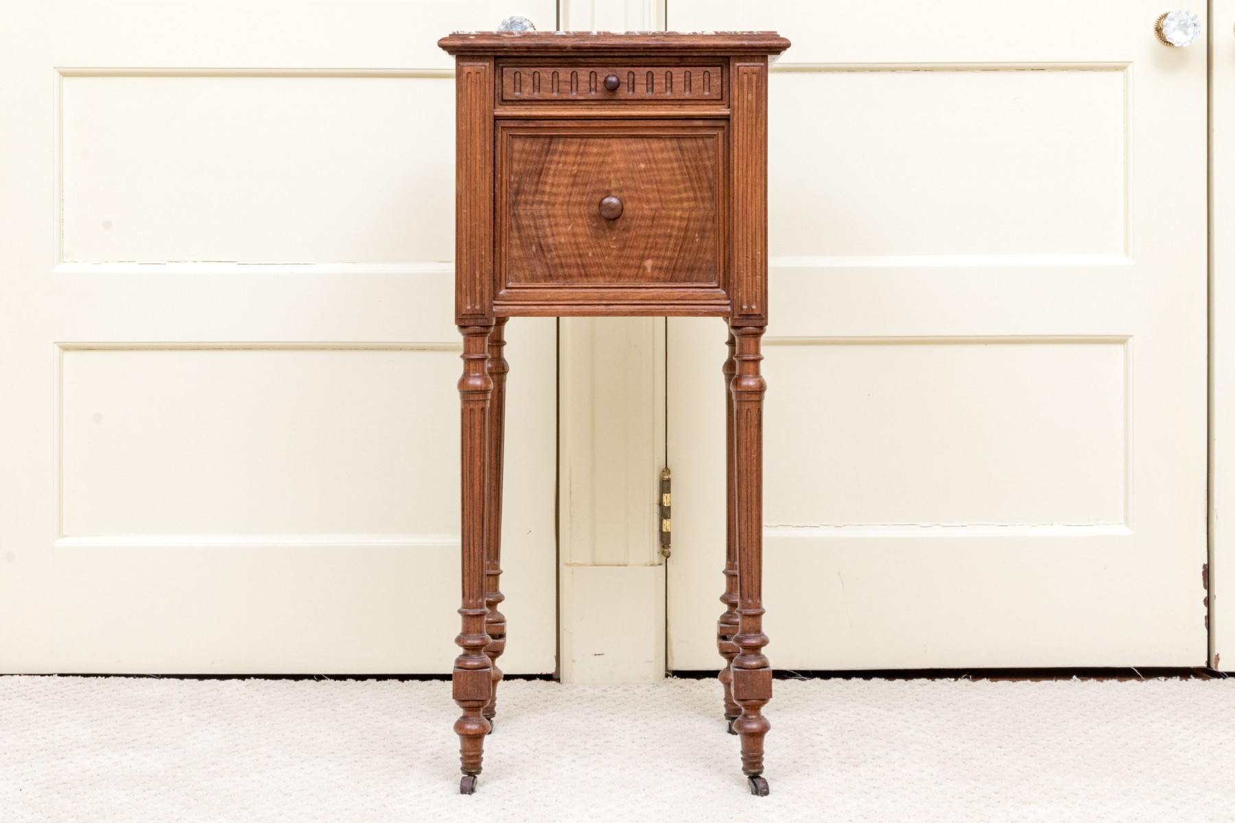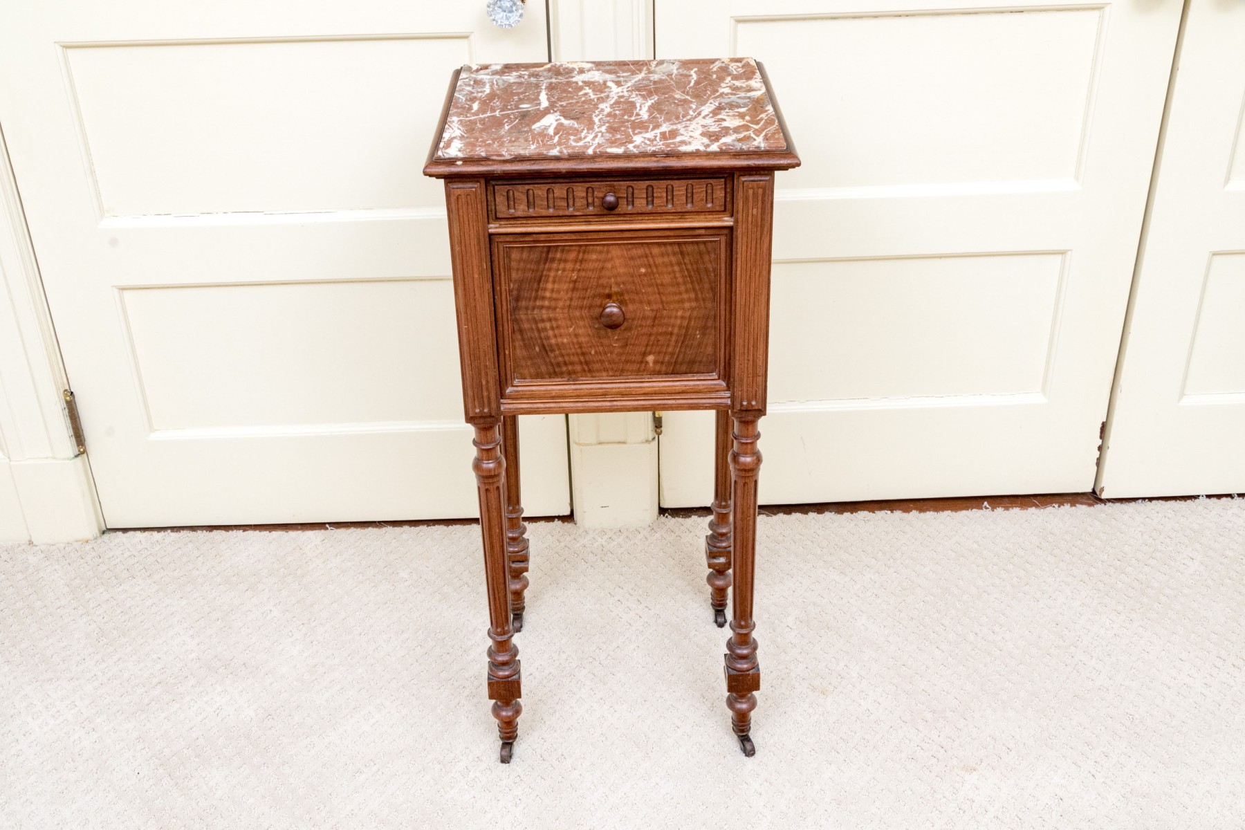 A delightful French style commode nightstand in warm-toned medium brown, featuring an orange marble top over a short drawer overhanging a single cabinet door with a figured exterior and a marble lined interior. Supported by tapered and fluted legs over caster feet.