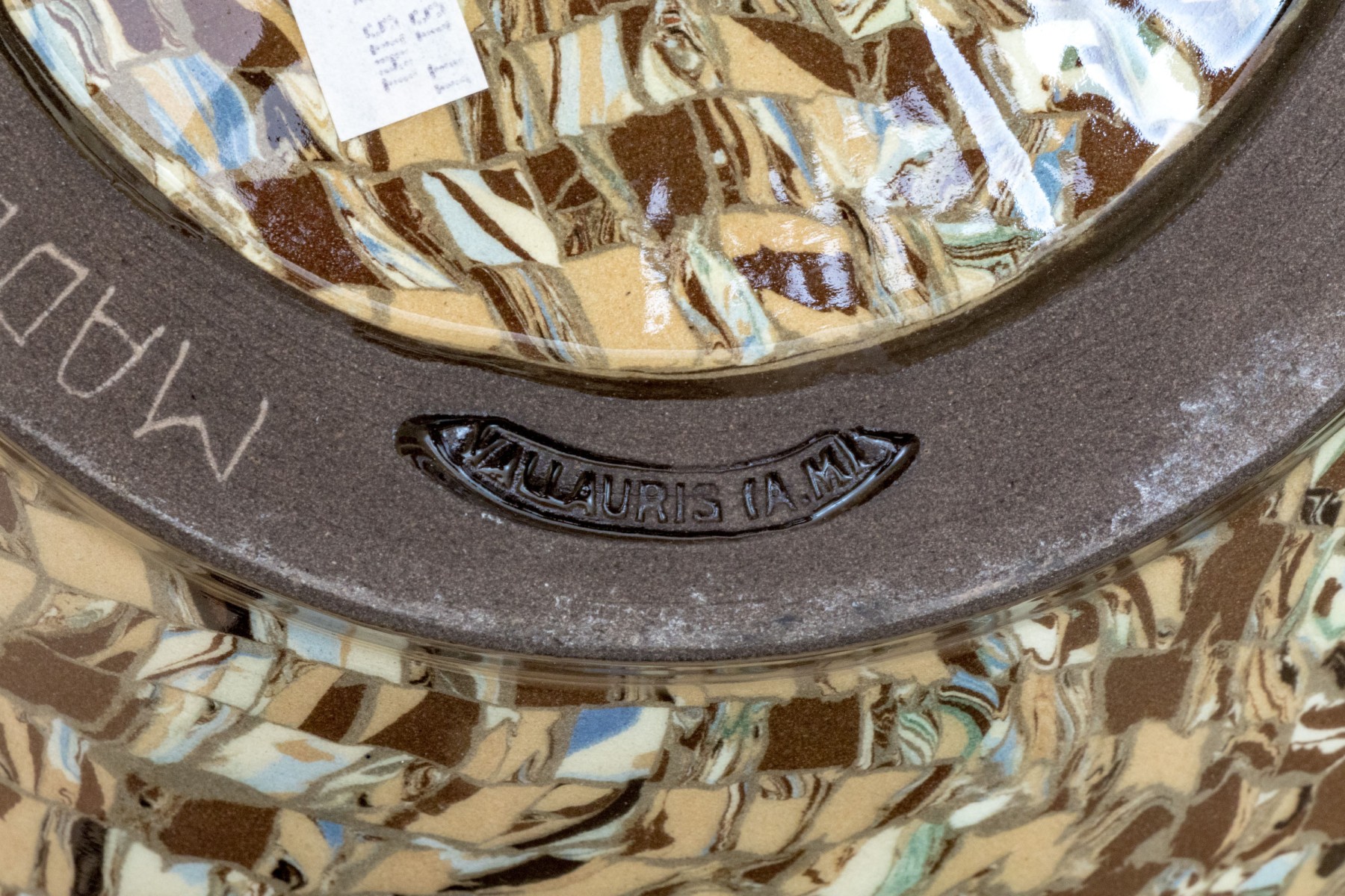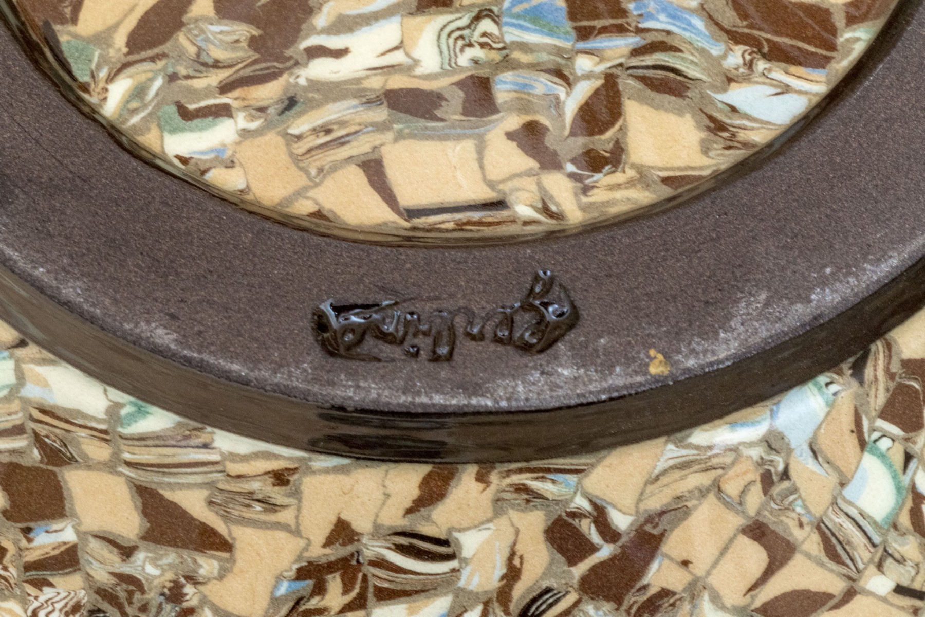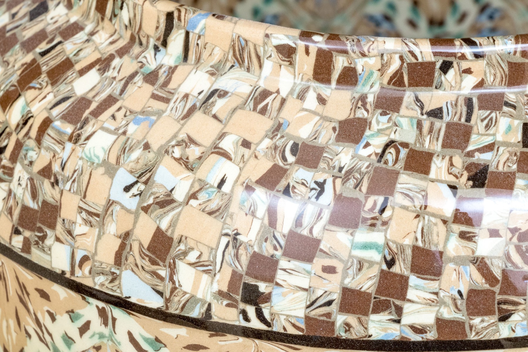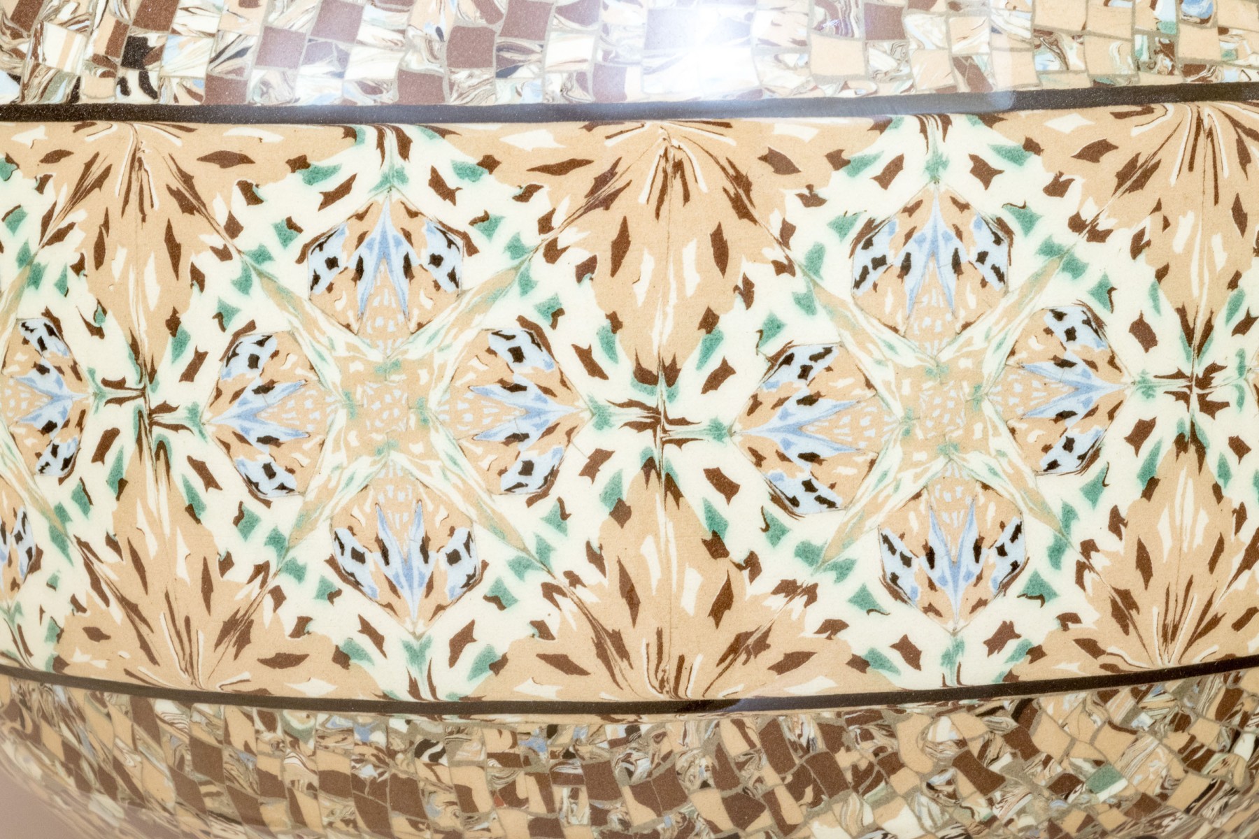 A fabulous ceramic bowl from Vallauris, France, attributed to Jean Gerbino (Italian-French, 1876-1966). Showcases an ornate micro-mosaic design with in warm cream, brown, green, and light blue. A center band around the apple form features repeating navette medallions with concentrically patterned starbursts. Marked underfoot.