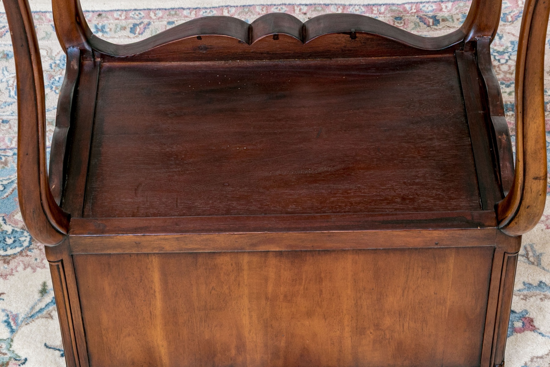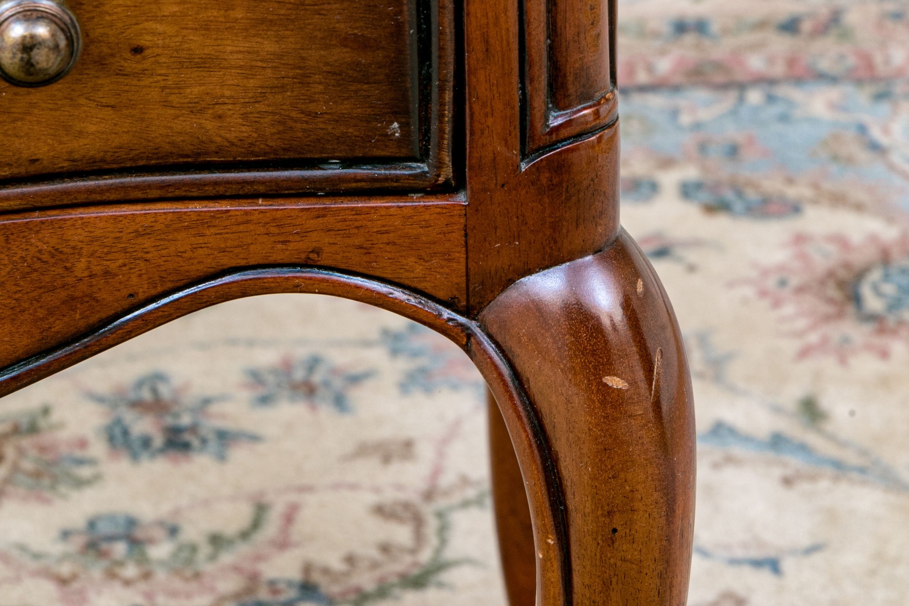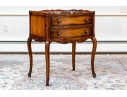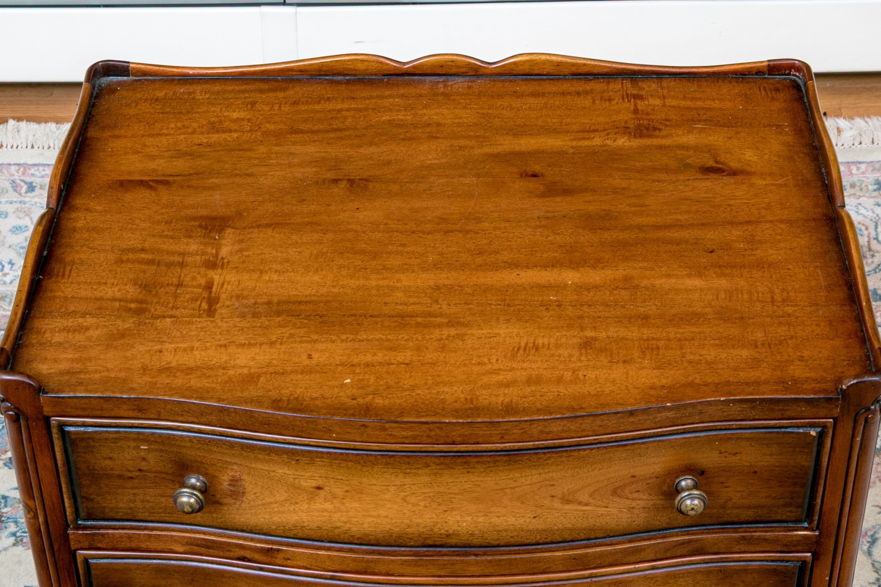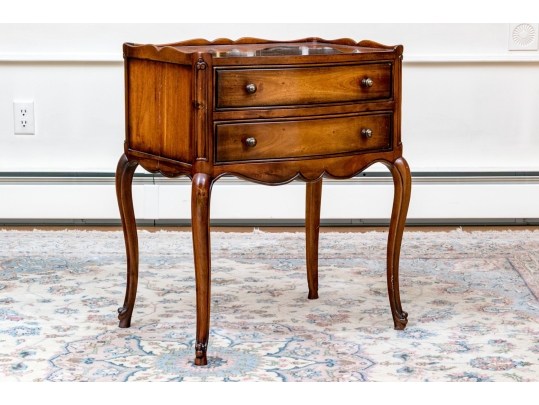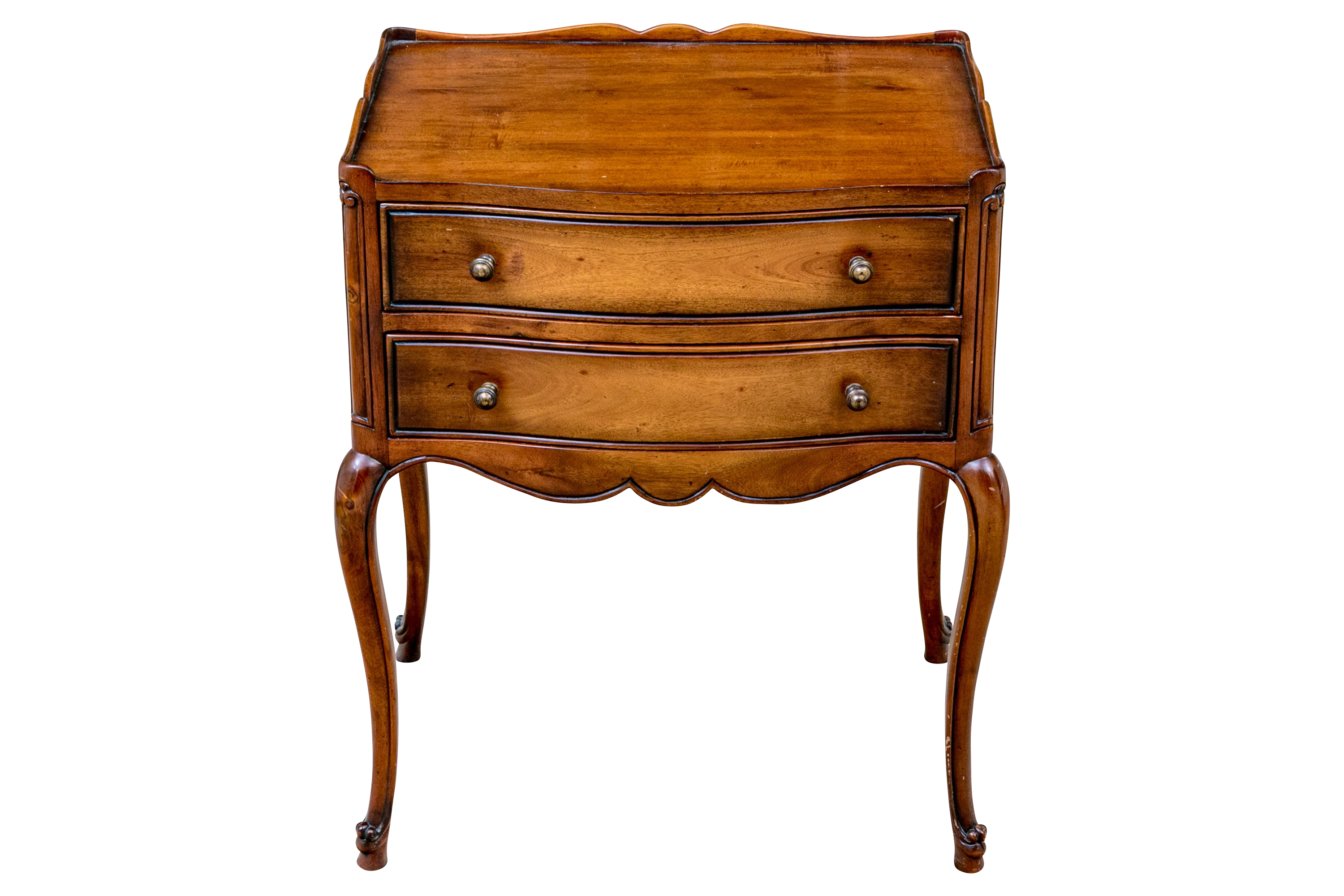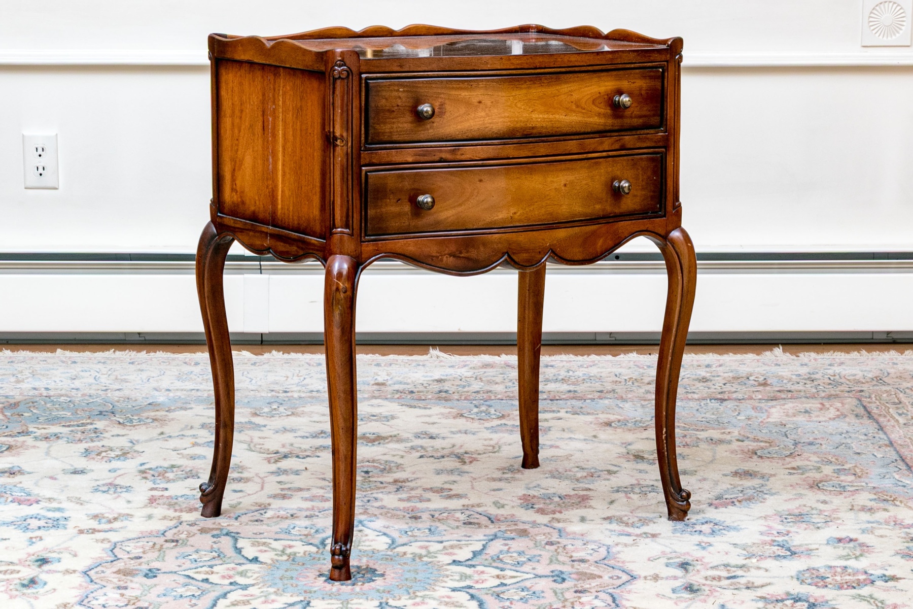 French Provincial night stand with 2 drawers, scalloped gallery, cabriole legs, serpentine front, scalloped frieze.