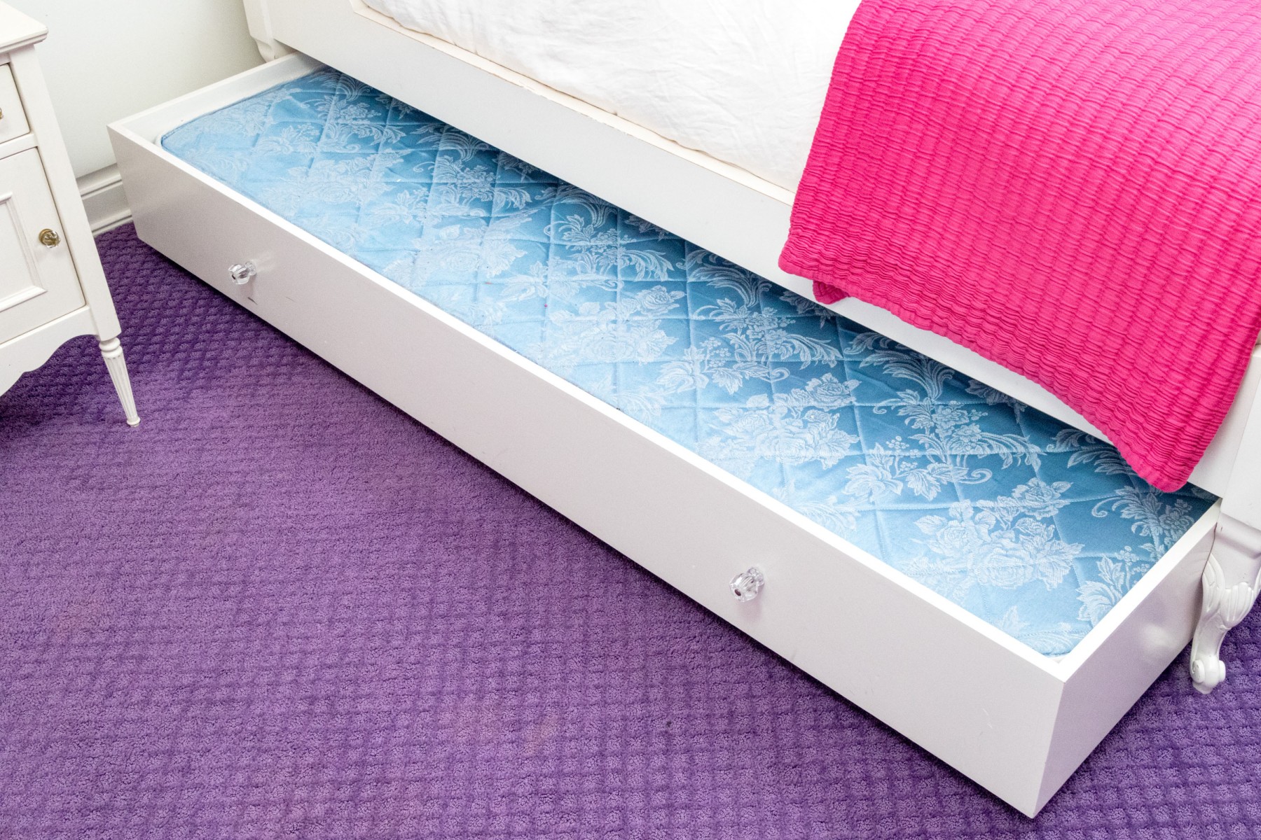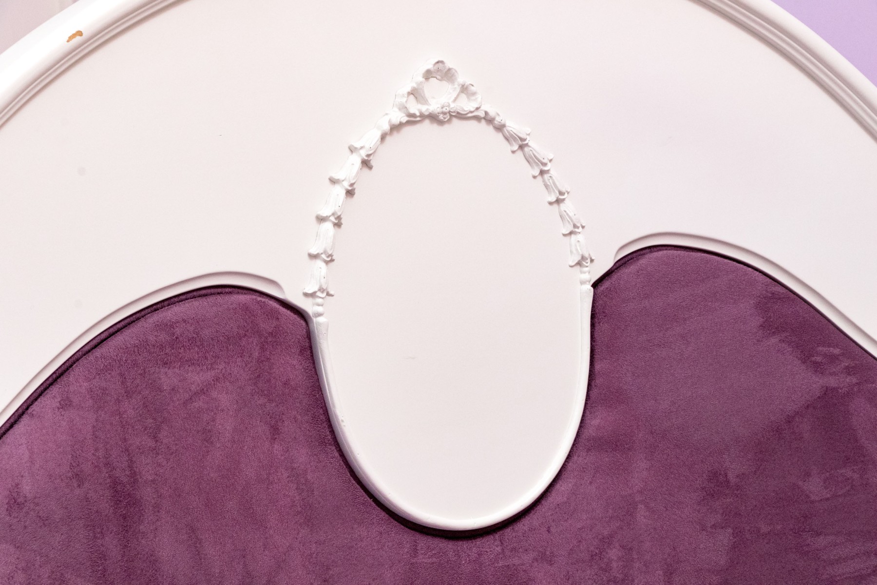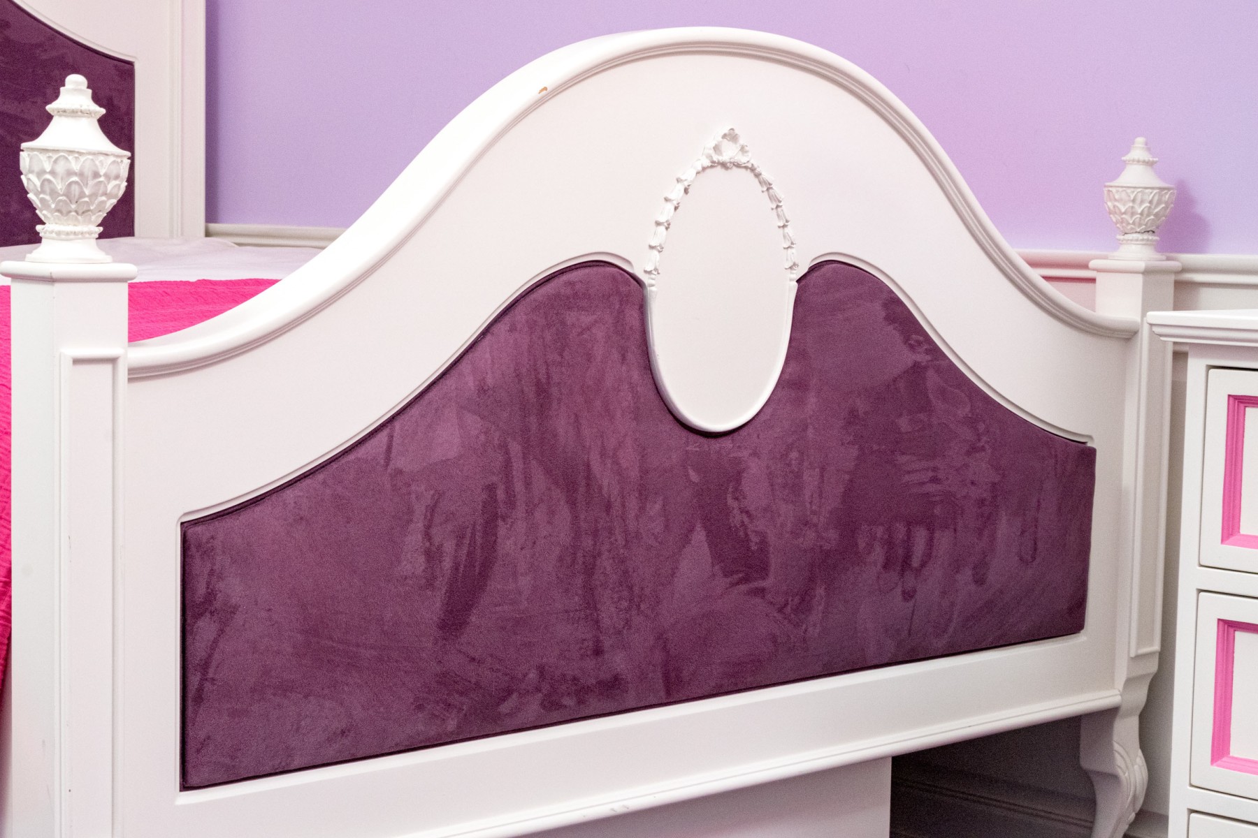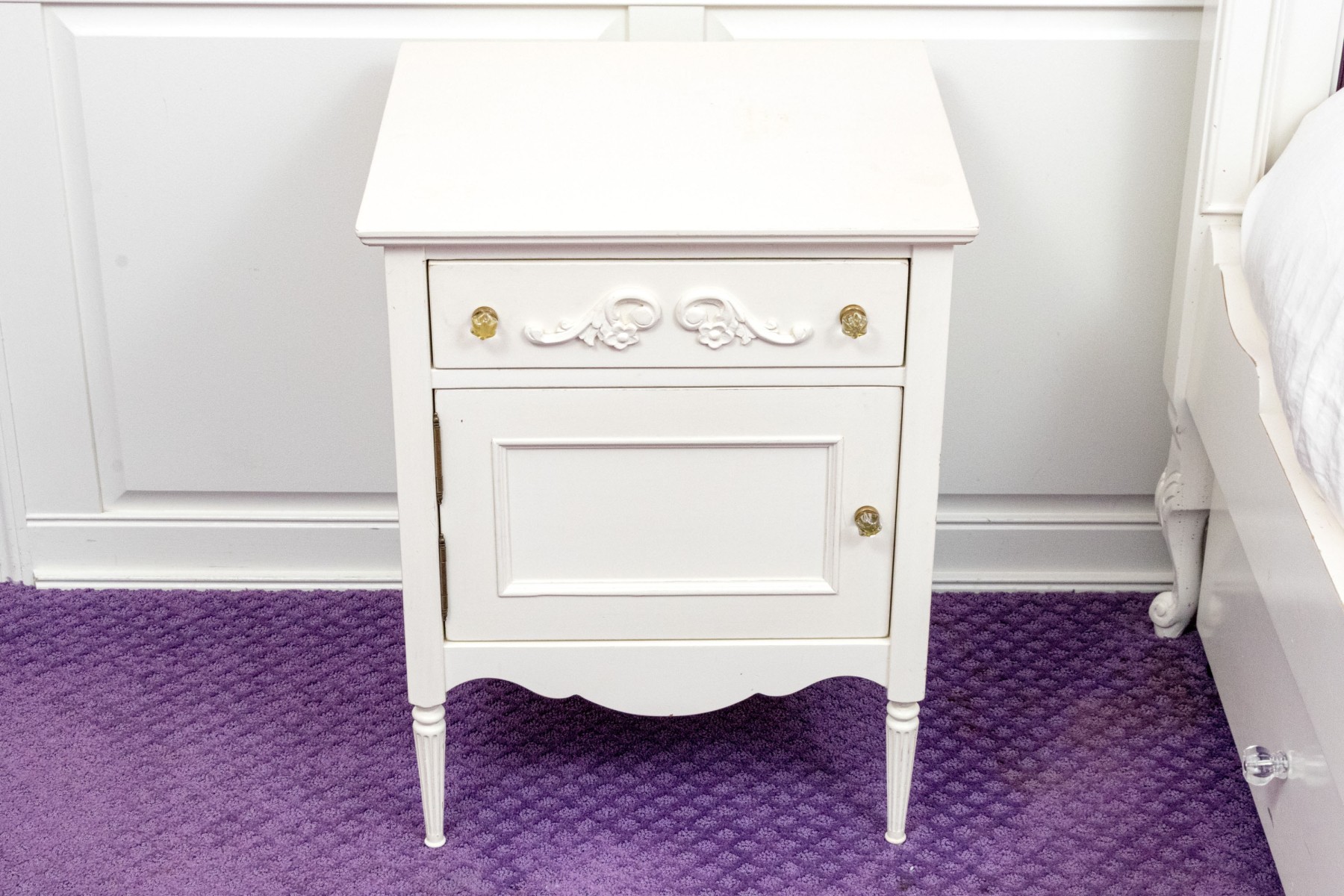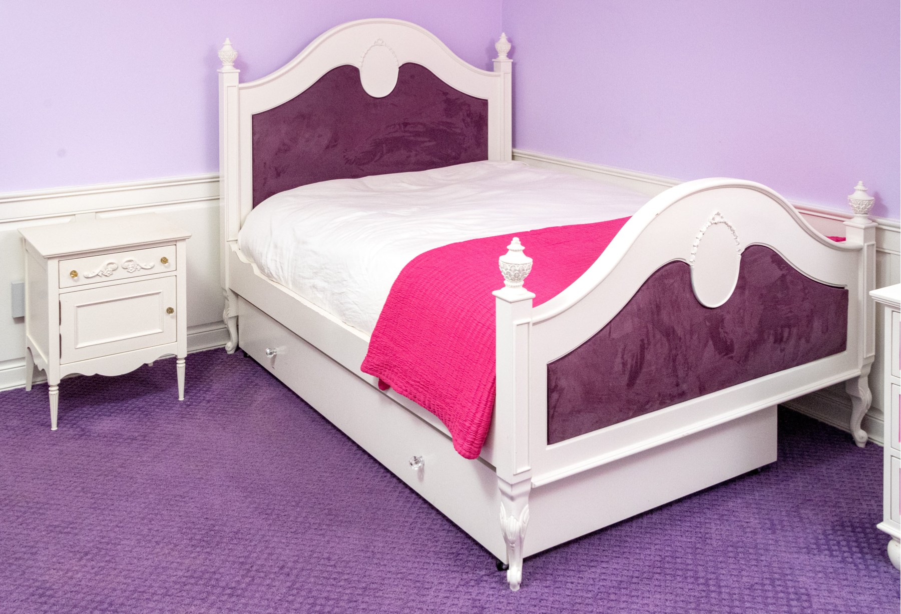 A chic French provincial full size trundle bed frame in a white painted finish, displaying a camelback headboard and footboard with purple upholstered centers and wreath relief. Accompanied by a matching bedside table with a drawer and cabinet.