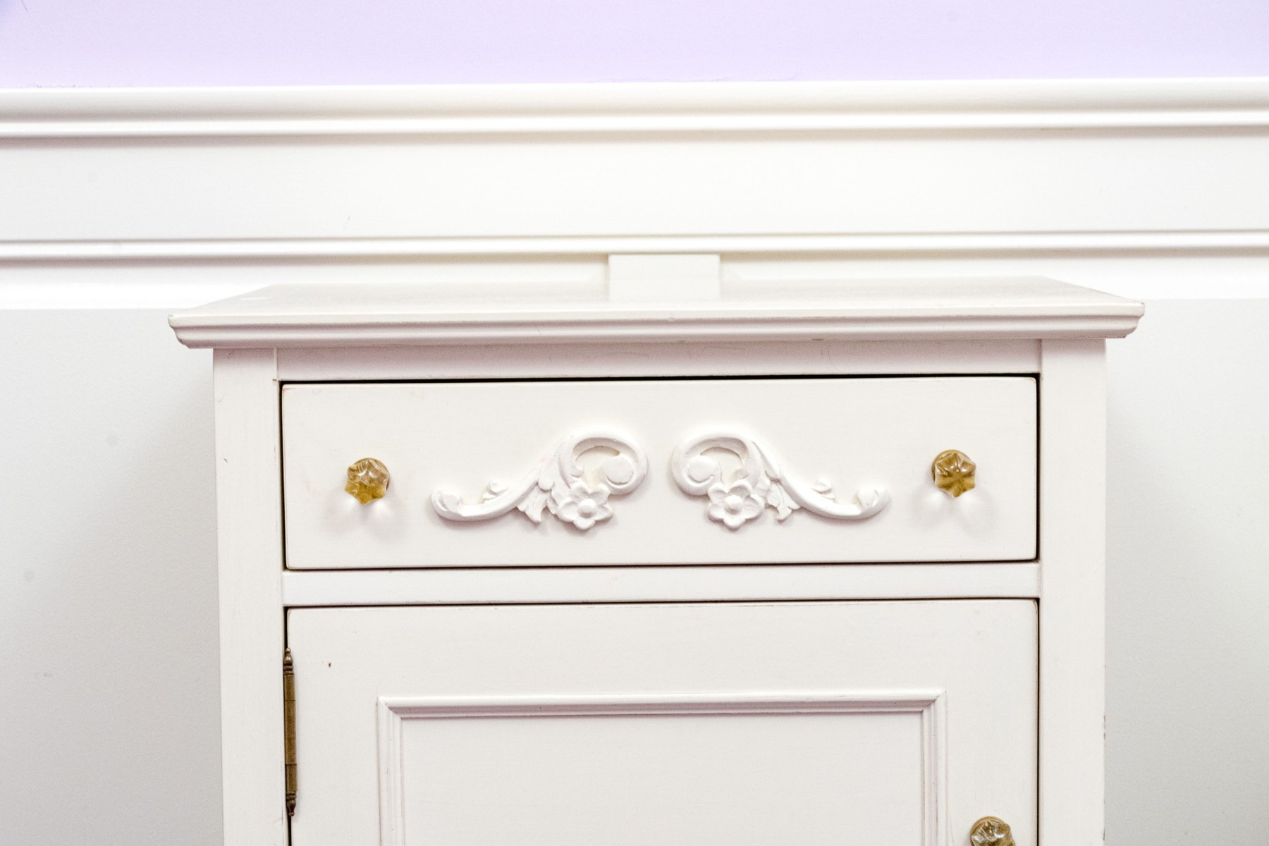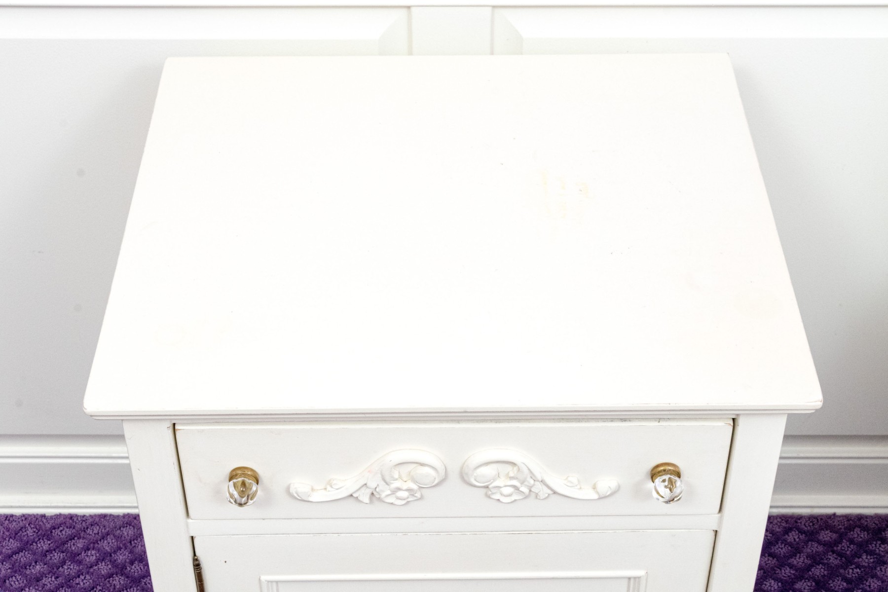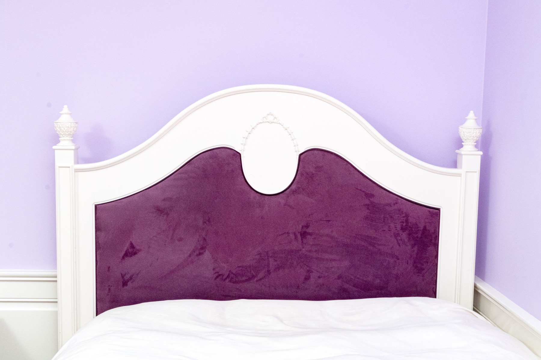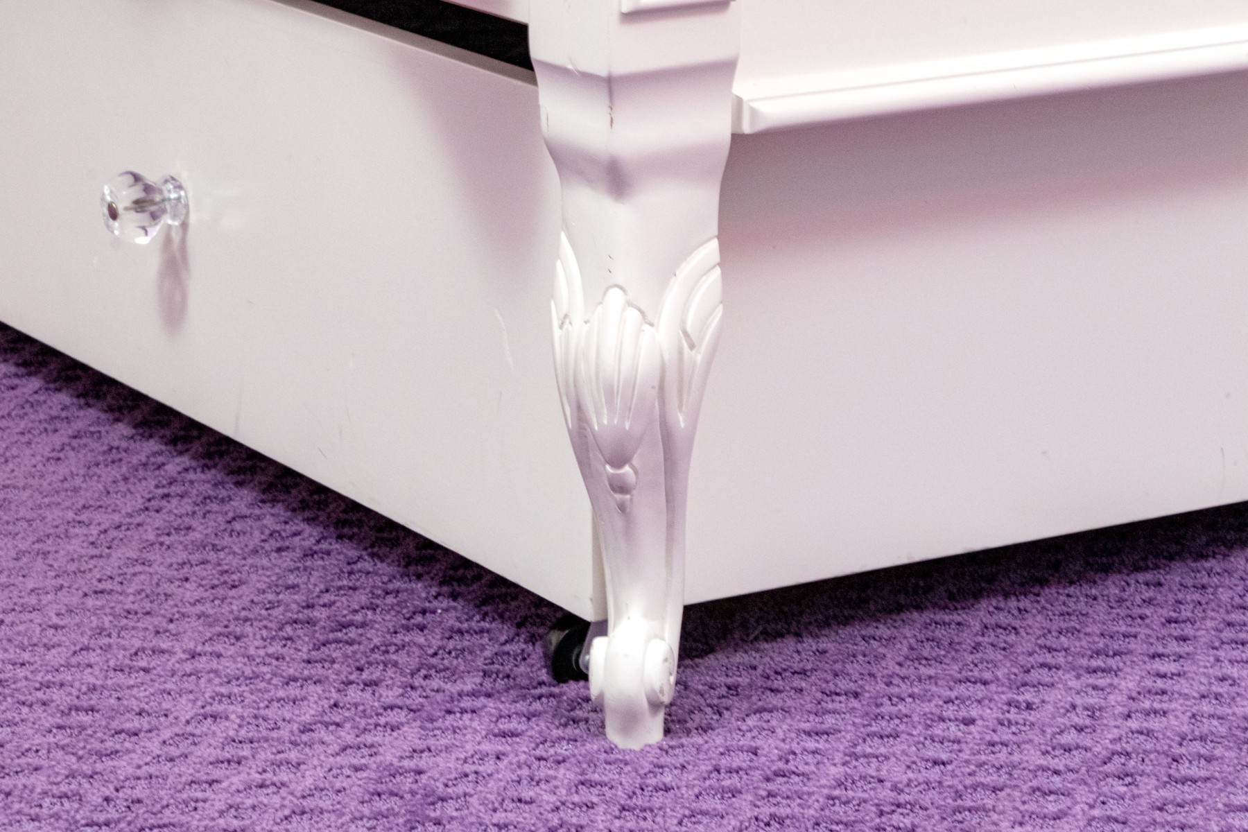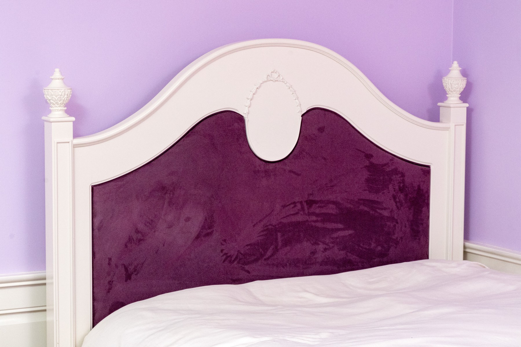 A chic French provincial full size trundle bed frame in a white painted finish, displaying a camelback headboard and footboard with purple upholstered centers and wreath relief. Accompanied by a matching bedside table with a drawer and cabinet.