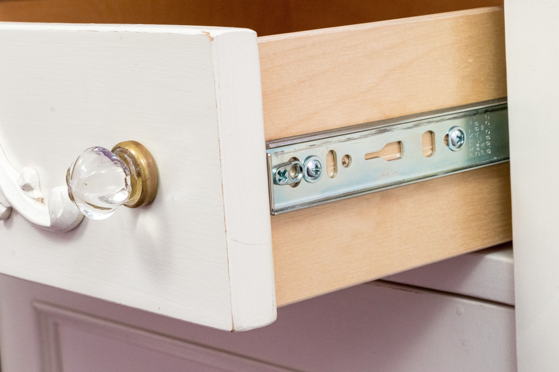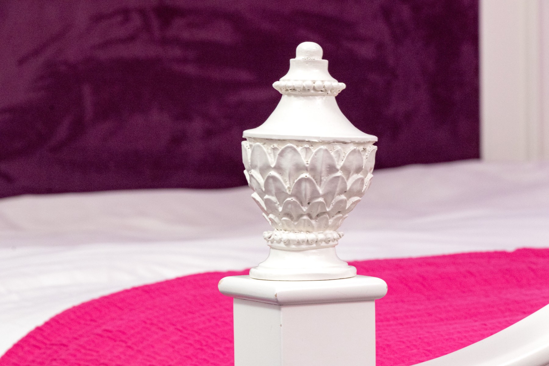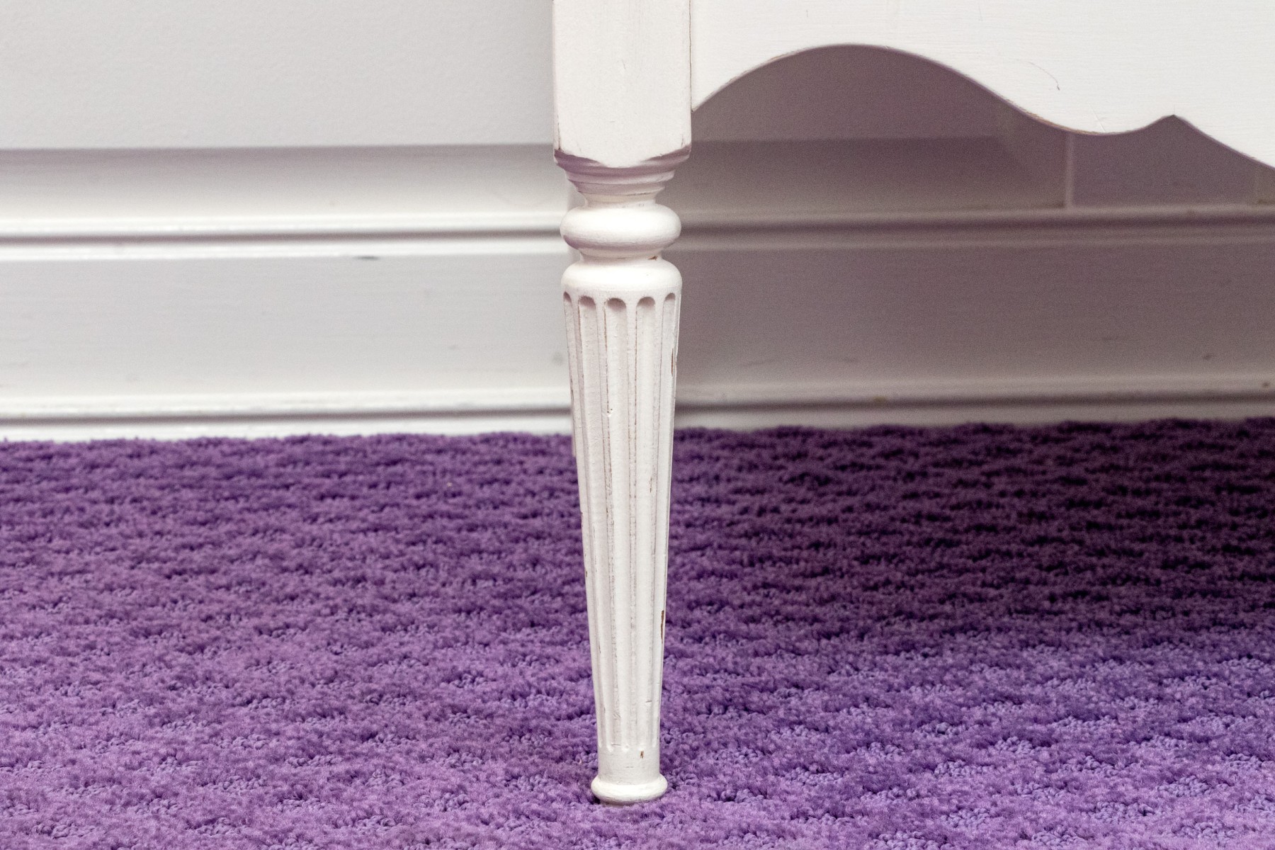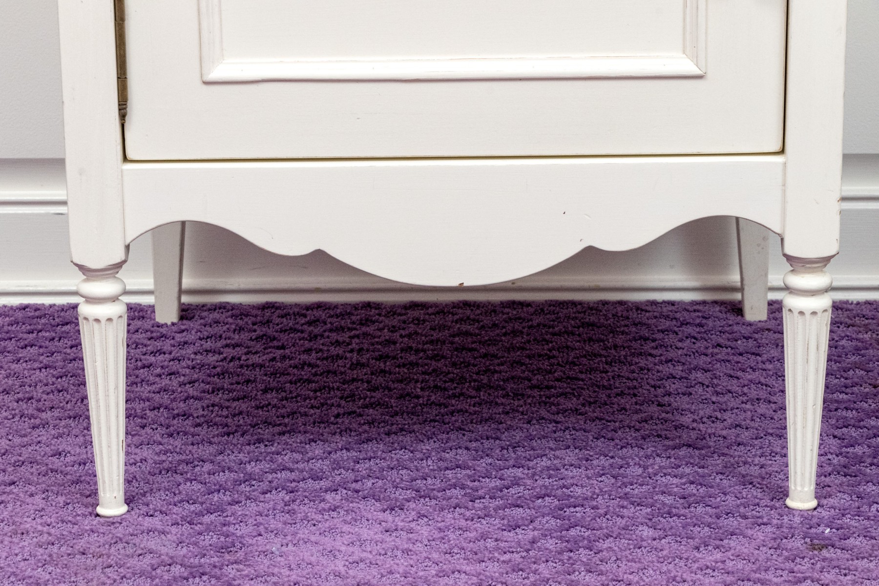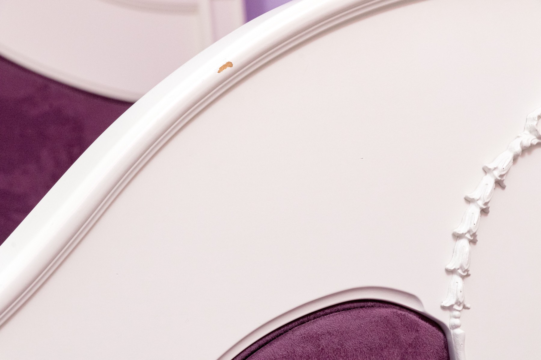 A chic French provincial full size trundle bed frame in a white painted finish, displaying a camelback headboard and footboard with purple upholstered centers and wreath relief. Accompanied by a matching bedside table with a drawer and cabinet.
